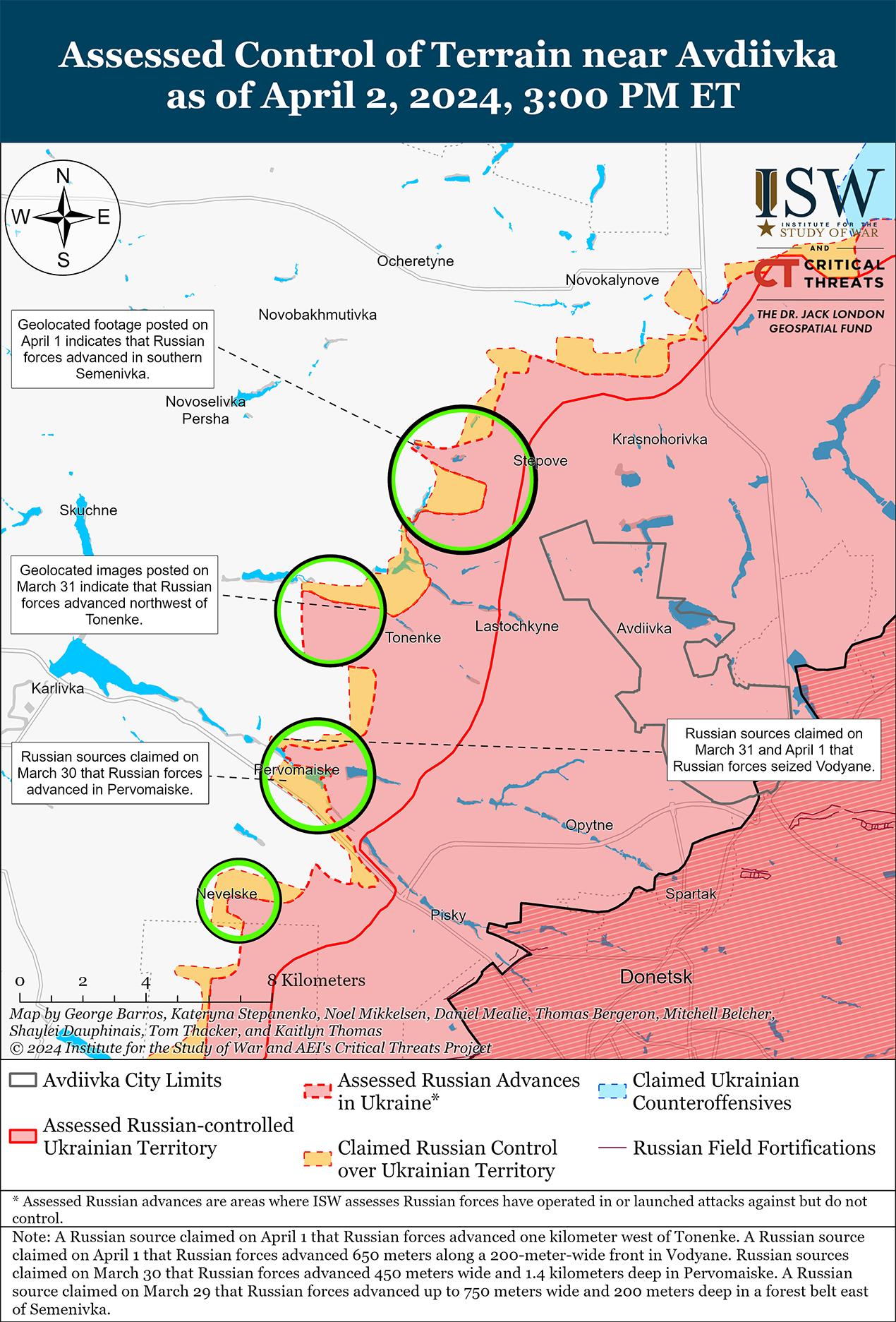 Российские войска недавно продвинулись в районе Авдеевки на фоне продолжающихся позиционных боев в этом районе 2 апреля. Геолоцированные кадры, опубликованные 31 марта, свидетельствуют о том, что российские войска продвинулись к западу от Бердичей (северо-запад Авдеевки). [53] На геолоцированных кадрах, опубликованных 1 апреля, также видно, что российские войска продвинулись на юге Семеновки (северо-западнее Авдеевки). [54] Дополнительные геолокационные кадры, опубликованные 2 апреля, указывают на то, что российские войска продвинулись к западу от Тоненького (к западу от Авдеевки), хотя неясно, являются ли они более старыми кадрами предыдущего российского наступления к западу от Тоненького 30 марта или кадрами более поздних возобновленных российских наступлений в этом районе. [55] Некоторые российские военные блогеры утверждали, что российские войска продвинулись на один километр западнее Тоненького в направлении Уманского (западнее Авдеевки и западнее Тоненького). [56] Российские военные блогеры утверждали, что российские войска продвинулись в районе Бердичей и Семеновки, а также вблизи Уманского (к западу от Авдеевки), Водяного (юго-западнее Авдеевки) и Первомайского (к юго-западу от Авдеевки), однако ISW не обнаружил визуальных подтверждений этим заявлениям. [57] Украинские и российские источники утверждали, что позиционные бои продолжались к северо-западу от Авдеевки в районе Бердичей и Семеновки; западнее Авдеевки в районе Уманского и Тоненького; и юго-западнее Авдеевки в районе Первомайского и Невельского. [58] Украинский офицер, служивший в бригаде на Авдеевском направлении, заявил, что российские войска иногда проводят тактические атаки сразу в двух направлениях, как, например, когда российские войска вели механизированный штурм в районе Первомайского, в то время как группа из 30 российских пехотинцев атаковала Невельское в неустановленную дату. [59]