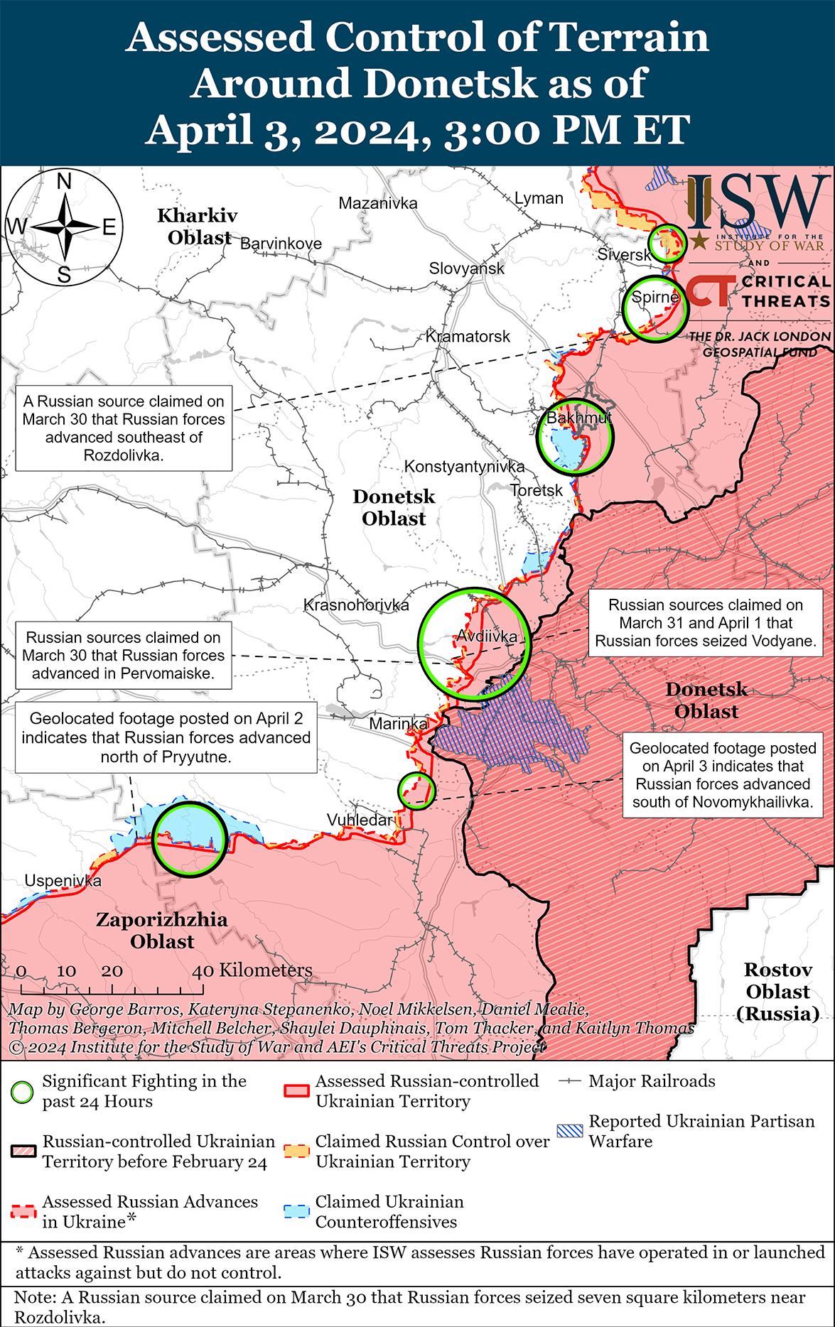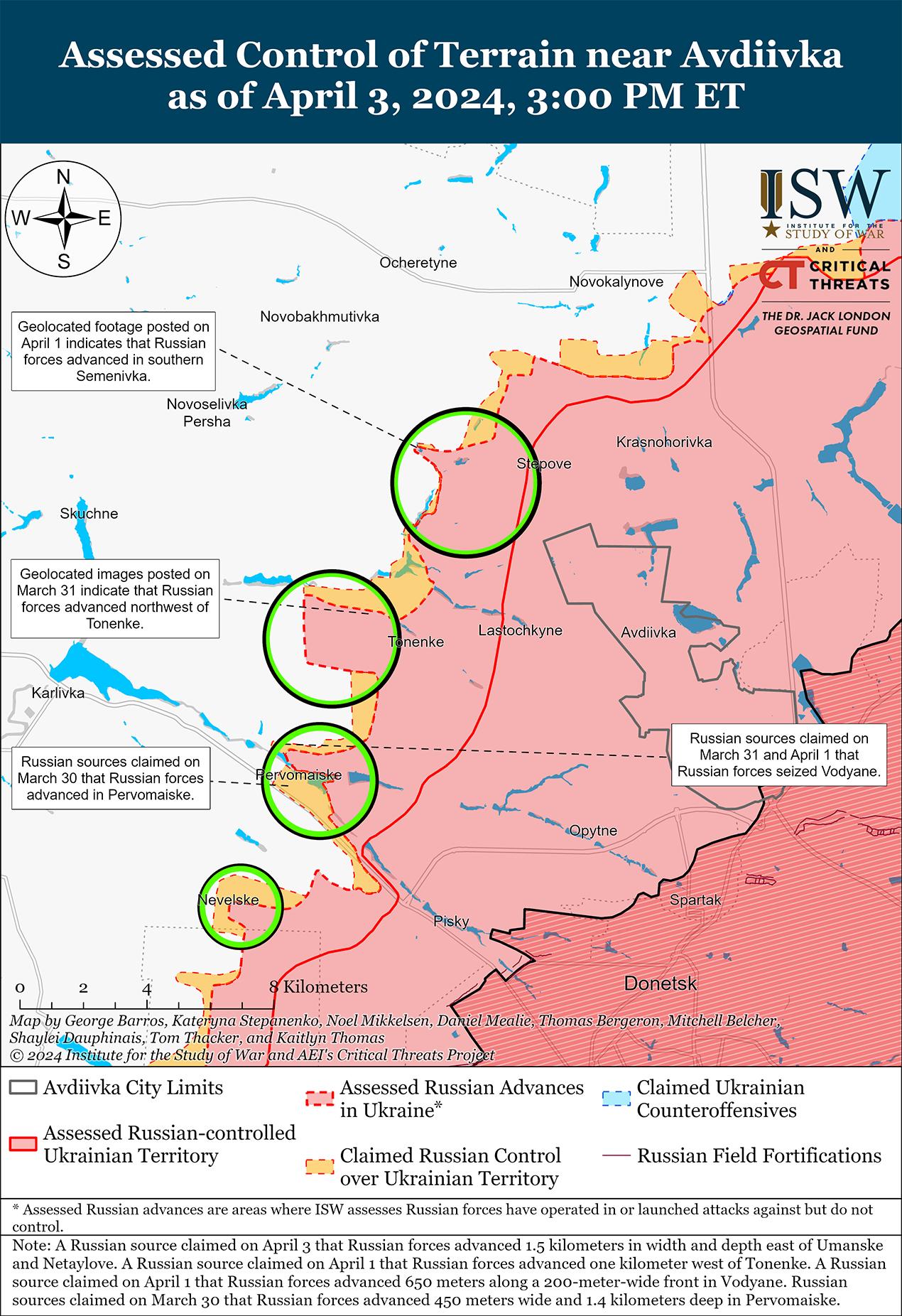 Сообщается, что 3 апреля российские войска продвинулись к западу от Авдеевки на фоне продолжающихся боев в этом районе. Российский военный блогер заявил, что в последние дни российские войска продвинулись до 1,5 километров по фронту и глубину в направлении Уманское-Нетайлово (оба к западу от Авдеевки). [43] Другой блогер утверждал, что украинские войска отходят из Бердичей и Семеновки (к западу от Авдивки). [44] Хотя ISW пока не получил подтверждения этого заявления, в настоящее время ISW оценивает, что российские войска оккупировали большую часть Бердичей. Известный российский блогер заявил, что российские войска продвинулись дальше на южные окраины Семеновки, хотя ISW обнаружил доказательства российского присутствия только в самой южной части населенного пункта. [45] Бои продолжались также к западу от Авдеевки в районе Тоненького, Уманского и Яснобродовки и юго-западнее Авдеевки в районе Водяного, Первомайского и Невельского. [46] По имеющимся данным, подразделения 6-го танкового полка (90-я танковая дивизия, 41-я общевойсковая армия, Центральный военный округ) продолжают действовать в районе Тоненькое, несмотря на тяжелые потери 30 марта. [47]