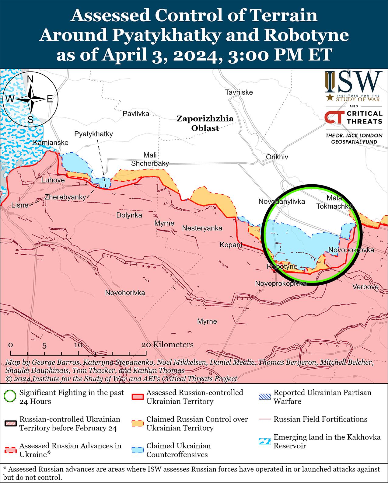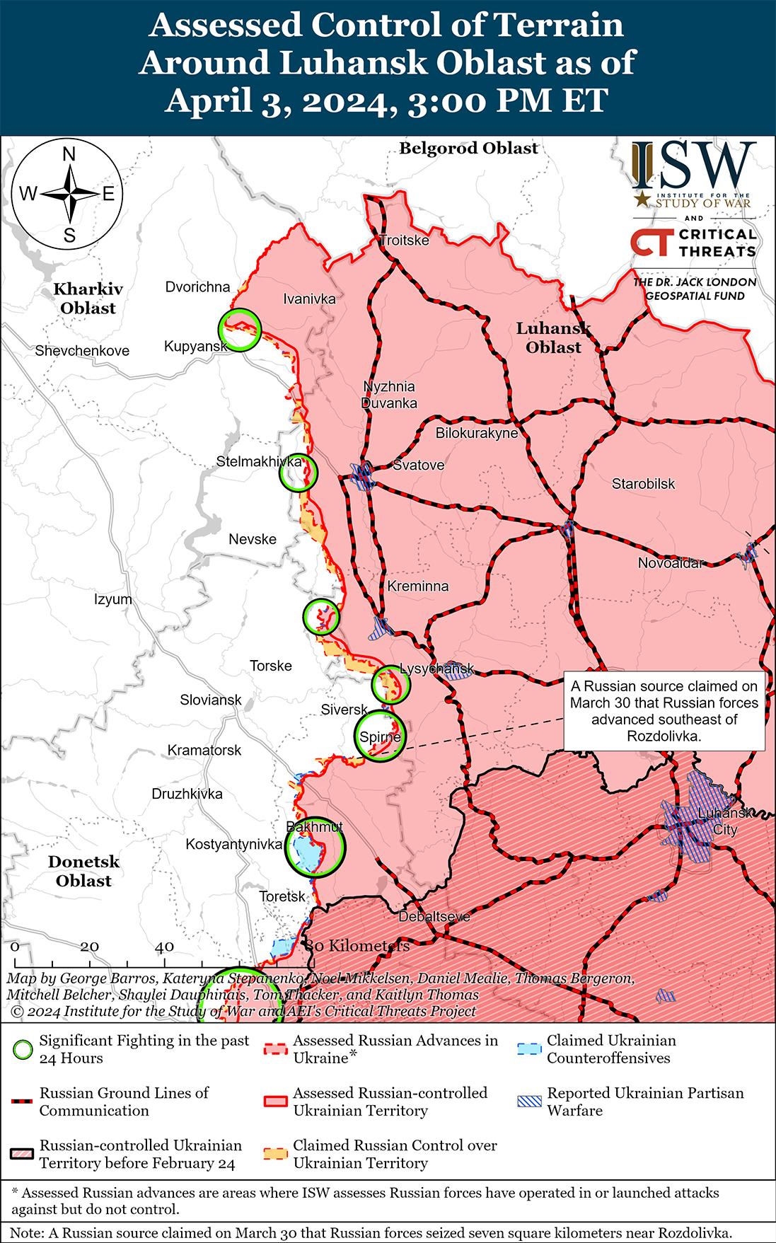 Недавно российские войска провели безуспешное механизированное наступление в составе примерно роты к западу от Кременной и возобновили ограниченные атаки непосредственно к западу от Сватово с 3 апреля. На геолоцированных кадрах, опубликованных 3 апреля, видно, как украинские силы отражают слегка усиленную российскую механизированную атаку в составе взвод к востоку от Терны (к западу от Кременной) с помощью беспилотников с видом от первого лица (FPV), артиллерии и противотанковых управляемых ракет (ПТРК). [30] Неясно, когда российские войска провели это наступление, но, скорее всего, это было недавно. Недавнее усиление механизированной атаки в составе взвода в районе Терн говорит о том, что российское командование уделяет приоритетное внимание Лиманскому направлению и может еще больше активизировать темпы своих наступательных операций в этом районе. 2 апреля российские военные блогеры заявили, что российские войска захватили украинские опорные пункты к западу от Сватово, а 3 апреля украинский Генштаб сообщил, что российские войска провели безуспешные атаки в районе Андреевки (к западу от Сватово). [31] Летом 2023 г. российские войска вели наступательные действия к западу от Сватово в районе Райгородки, но с тех пор редко совершали наступательные действия в этом районе. [32] Остается неясным, будут ли российские войска продолжать наступательные действия непосредственно к западу от Сватово. Продолжались позиционные бои на рубеже Купянск — Сватово — Кременная в районе Синьковки (северо-восточнее Купянска) и Белогоровки (южнее Кременной). [33]