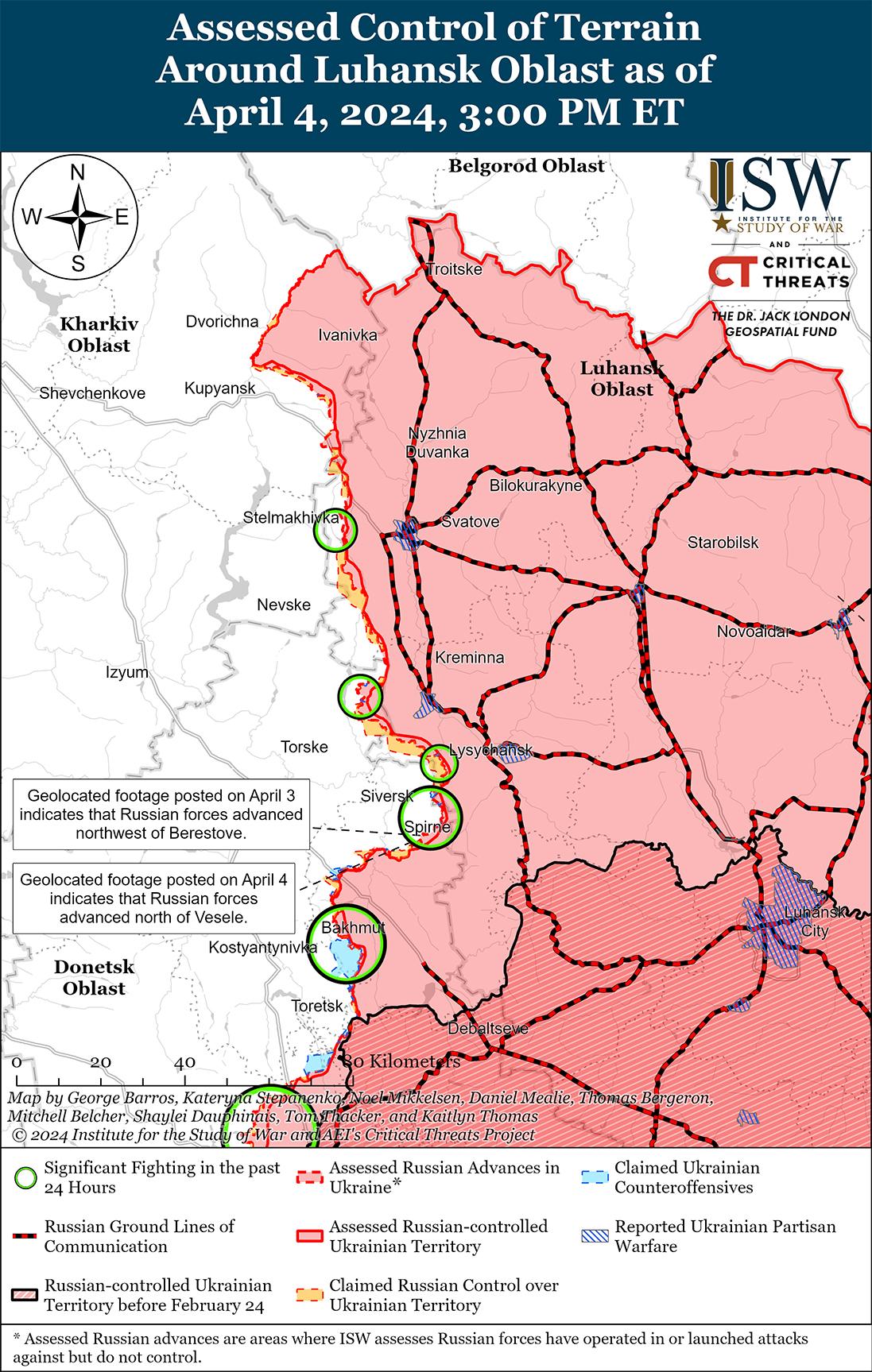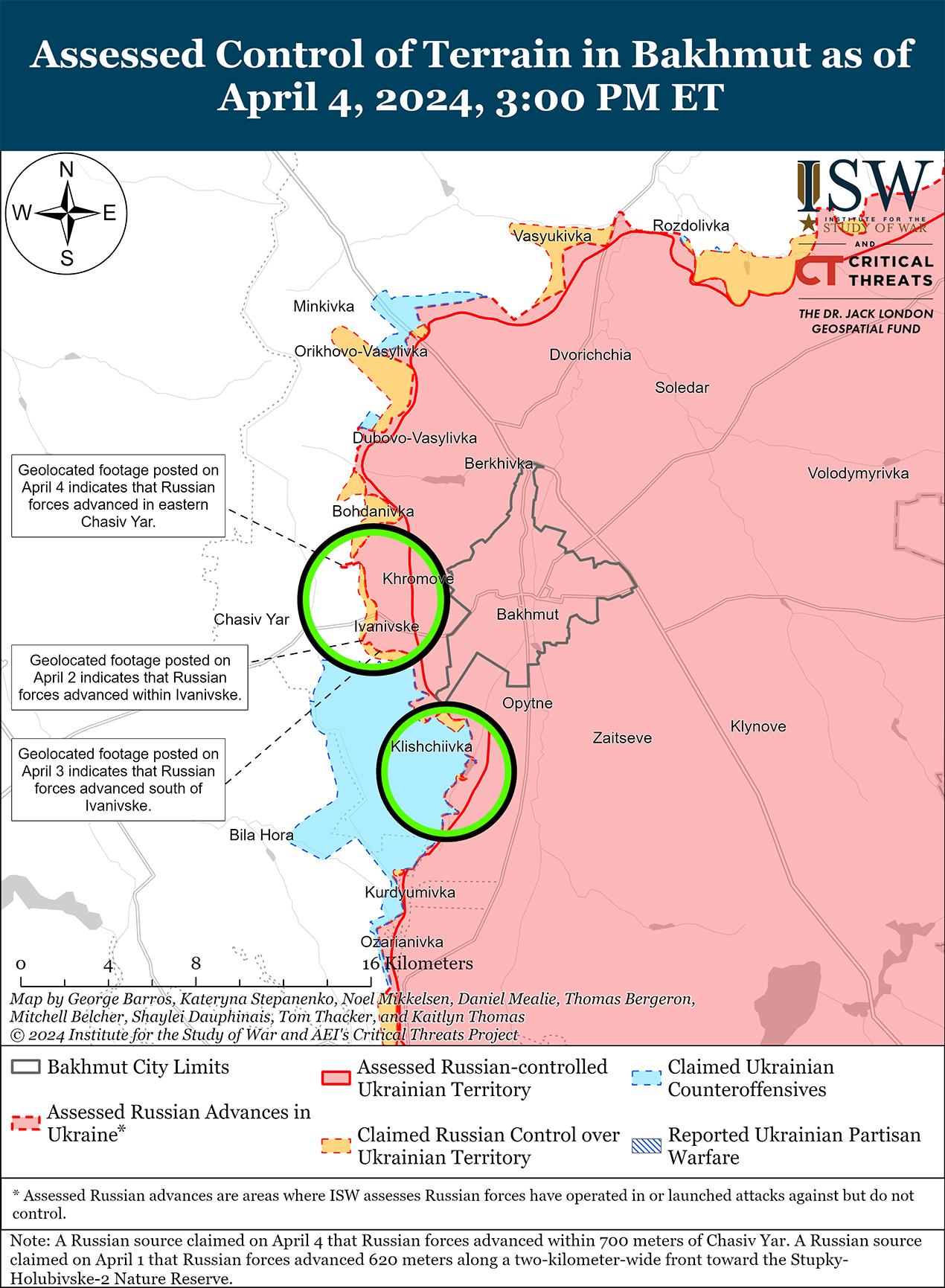 В последнее время российские войска продвинулись к северо-востоку и западу от Бахмута на фоне продолжающихся позиционных боев в этом районе. Геолоцированные кадры, опубликованные 4 апреля, указывают на то, что российские войска недавно продвинулись к северу от Веселого (к северо-востоку от Бахмута). [37] На кадрах, опубликованных 3 апреля, видно, что российские войска недавно продвинулись к северо-западу от Берестового (к северо-востоку от Бахмута), а также захватили значительную часть южной части Ивановского (западнее Бахмута). [38] Российский блогер утверждал, что российские войска полностью вытеснили украинские войска из Ивановского, хотя ISW не видел визуальных подтверждений этого заявления и в настоящее время оценивает, что российские войска пока не контролируют районы юго-западного и северо-западного Ивановского. [39] Продолжались позиционные бои северо-восточнее Бахмута в районе Верхнекаменского, Выемки и Спорного; северо-западнее Бахмута в районе Богдановки; западнее Бахмута в районе Ивановского и Ступочек; и юго-западнее Бахмута в районе Клещеевки и Андреевки. [40] Сообщается, что подразделения российской 98-й воздушно-десантной дивизии (ВДВ) действуют на восточных окраинах Часового Яра. [41]