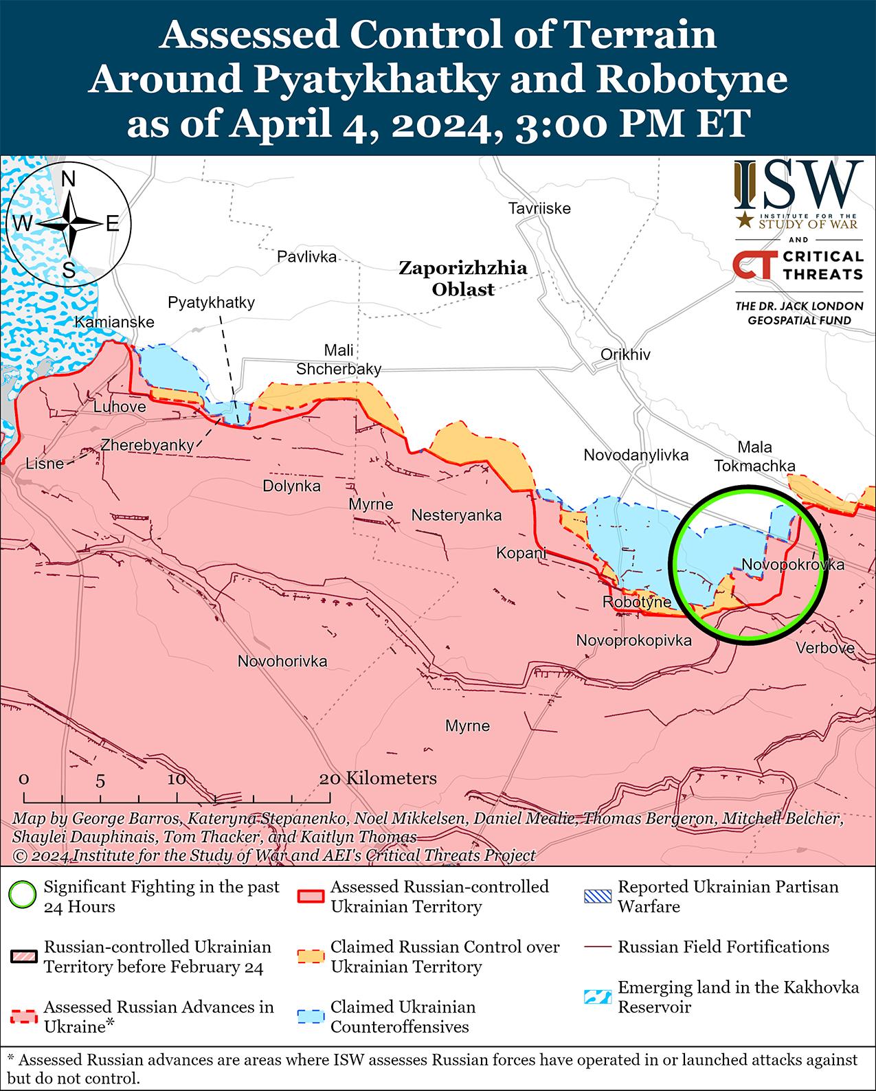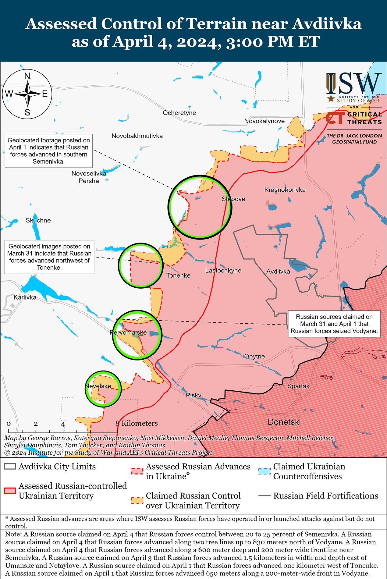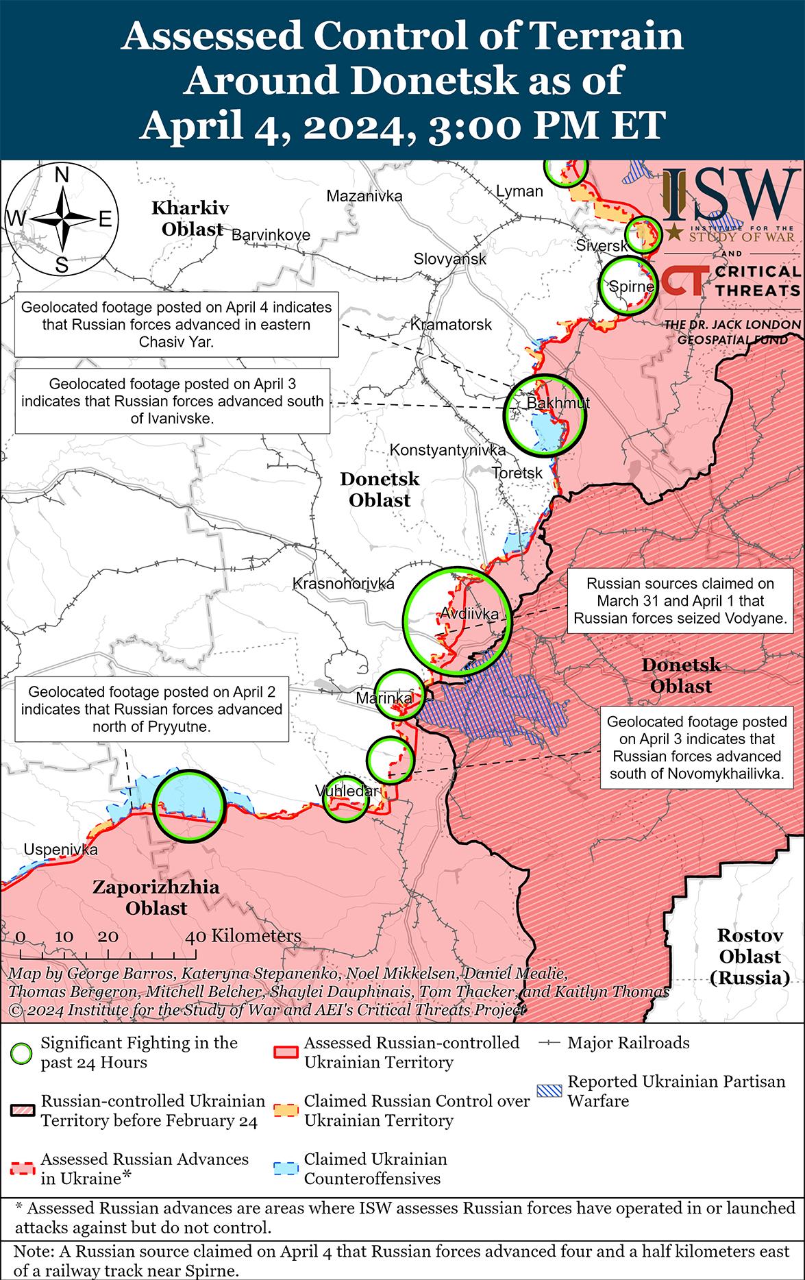 4 апреля к западу от Авдеевки продолжались позиционные бои. Российский военный блогер заявил, что российские войска продвинулись на глубину до 830 метров к юго-востоку от Уманского (к западу от Авдеевки) и до 600 метров в глубину возле Семеновки (к западу от Авдеевки). [42] Российский военный блогер утверждал, что российские войска контролируют от 20 до 25% Семеновки, хотя ISW наблюдал только визуальные доказательства присутствия российских войск в самой южной части Семеновки. [43] Российские источники утверждали, что украинские войска частично отходят из Бердичей (северо-запад Авдеевки), Семеновки и Первомайского (юго-западнее Авдеевки), хотя ISW не зафиксировал никаких доказательств вывода украинских войск из этих районов. [44] Российские военные блогеры утверждали, что 3 и 4 апреля украинские военные провели несколько механизированных контратак вблизи Тоненького (западнее Авдеевки), Уманского, Водяного (юго-западнее Авдеевки) и Первомайского. [45] Позиционные бои велись также к западу от Авдеевки в районе Яснобродовки и к юго-западу от Авдеевки в районе Невельского. [46] Пресс-секретарь украинской бригады, действующей на Авдеевском направлении, заявил, что российские войска пытаются наступать в этом районе до тех пор, пока позволяют погодные условия, вероятно, имея в виду грунтовые условия, которые с наступлением весны станут менее благоприятными для механизированного маневра, а земля станет более грязной. [47]