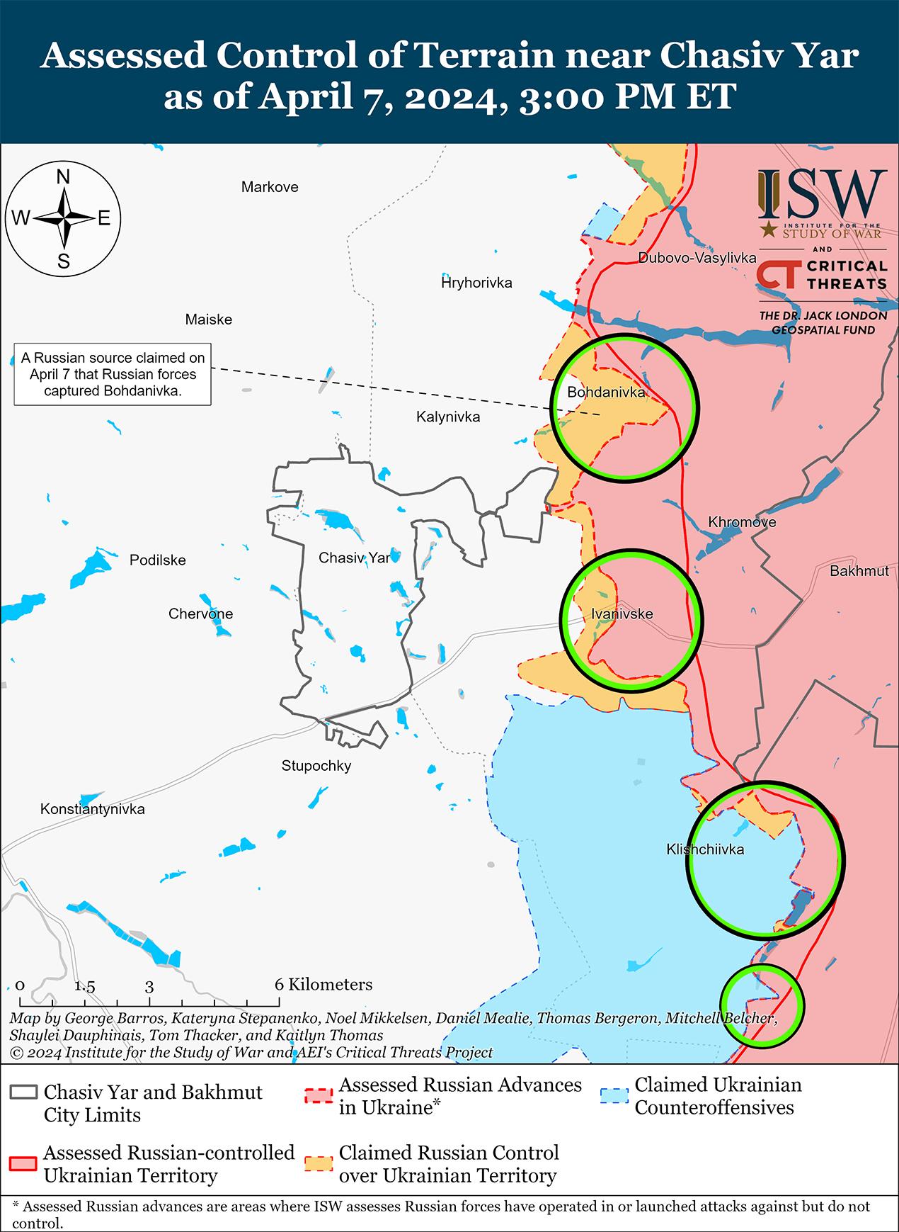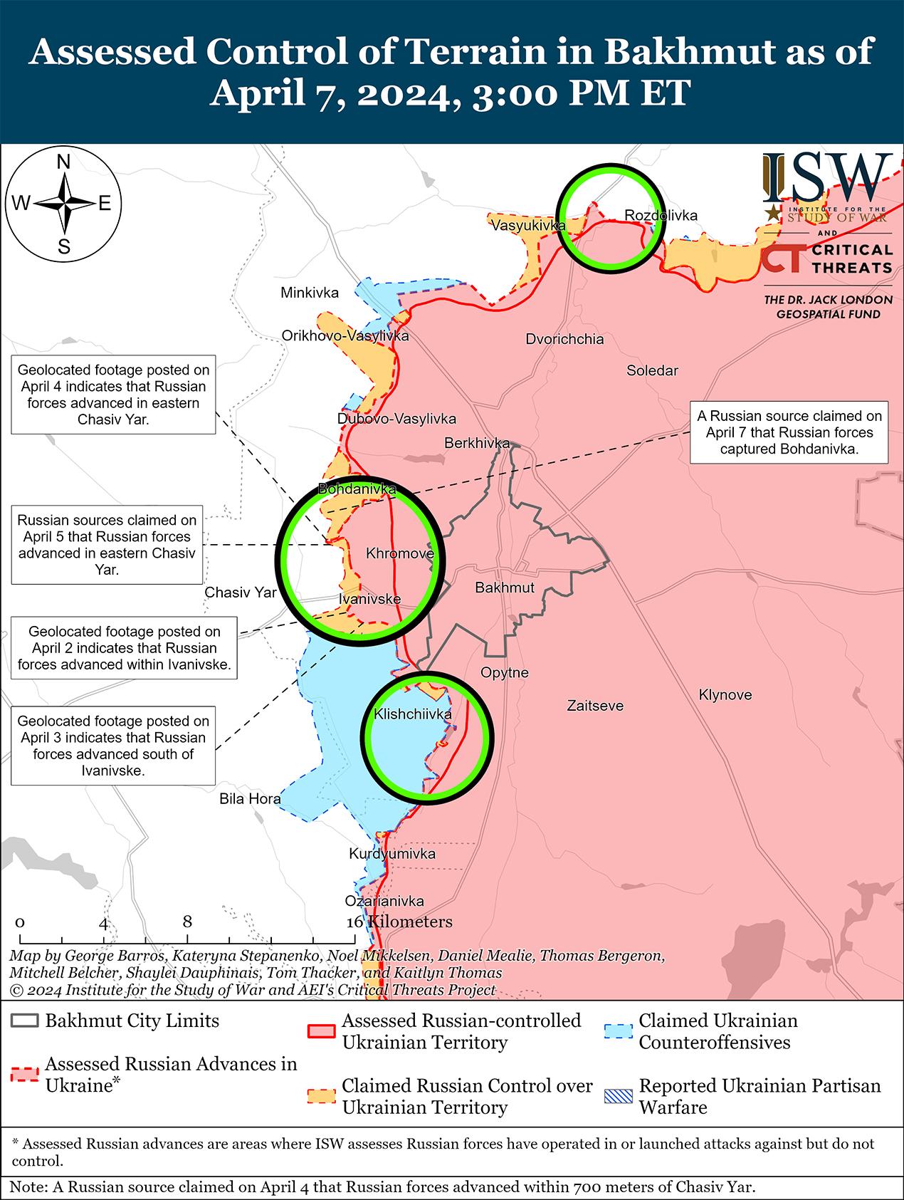 Сообщается, что 7 апреля российские войска продвинулись к северо-западу и западу от Бахмута, но подтвержденных изменений на линии фронта не было. Один российский военный блогер заявил, что российские войска захватили Богдановку (северо-западнее Бахмута), в то время как другие российские военные заявили, что бои в Богдановке продолжаются и что украинские силы удерживают позиции на западной окраине населенного пункта. [29] ISW пока не обнаружил визуальных доказательств того, что российские войска полностью захватили Богдановку. Российские военные блогеры утверждали, что российские войска, а именно подразделения российской 98-й воздушно-десантной дивизии (ВДВ), при поддержке подразделений 11-й отдельной бригады ВДВ и 150-й мотострелковой дивизии (8-я общевойсковая армия [ОА], Южный военный округ [ЮВО]) продвинулись в микрорайоне канала на восточной окраине Часового Яра (к западу от Бахмута), хотя ISW не обнаружил визуальных доказательств этого заявления. [30] Продолжались позиционные бои к северо-западу от Бахмута в районе Богдановки, к западу от Бахмута в районе Ивановского и к юго-западу от Бахмута в районе Клещеевки и Андреевки. [31] Украинский военный обозреватель Константин Машовец сообщил 7 апреля, что подразделения российской 7-й разведывательно-штурмовой бригады (Добровольческий корпус) и 331-го полка ВДВ (98-я дивизия ВДВ) действуют вблизи Богдановки и пытаются продвинуться в направлении Калиновки (северо-восточнее Бахмута). [32] Машовец заявил, что наиболее агрессивные атаки ведут подразделения российской 11-й отдельной бригады ВДВ, 102-го мотострелкового полка (150-я мотострелковая дивизия, 8-я ОА, ЮВО), а также 217-го и 299-го полков ВДВ (98-я дивизия ВДВ). Машовец заявил, что подразделения российской 6-й мотострелковой дивизии и 72-й мотострелковой бригады (обе входят в состав 3-го армейского корпуса), а также подразделения 88-й мотострелковой бригады (2-й армейский корпус Луганской народной республики) пытаются обойти Клещеевку и оттеснить украинские силы к западу от канала Северский-Донец.