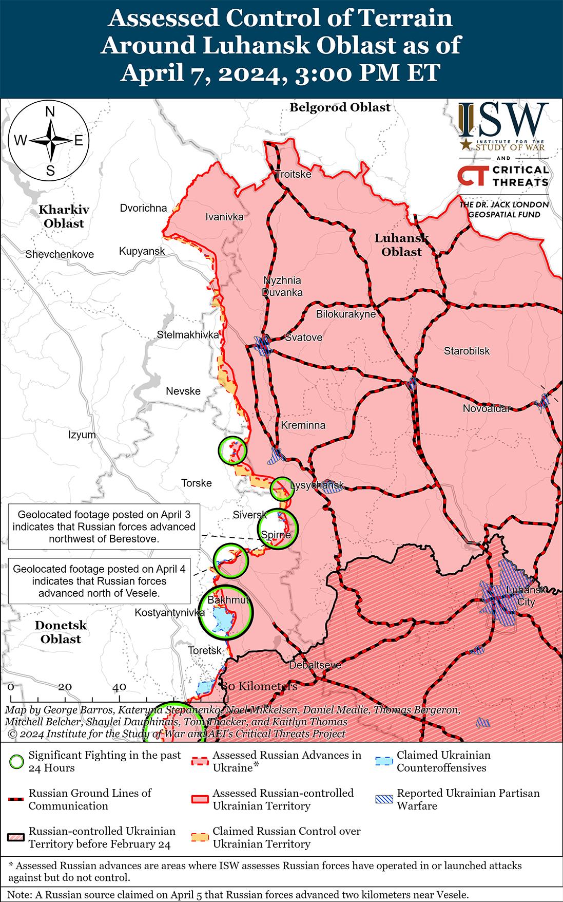 Недавно, 7 апреля, российские войска подтвердили продвижение к западу от Авдеевки на фоне продолжающихся позиционных боев в этом районе. Геолоцированные кадры, опубликованные 7 апреля, свидетельствуют о том, что российские войска недавно продвинулись к северо-западу от Первомайского (юго-западнее Авдеевки). [33] Известный российский военный блогер, связанный с Кремнем, утверждал, что российские войска в настоящее время контролируют не менее 80% Первомайского, что согласуется с текущей оценкой ISW продвижения российских войск в населенном пункте. [34] Продолжались позиционные бои северо-западнее Авдеевки в районах Новокалиново, Новобахмутовки и Бердичи; западнее Авдеевки в районе Тоненького и Семеновки; и юго-западнее Авдеевки вблизи Первомайского, Невельского и Водяного. [35]