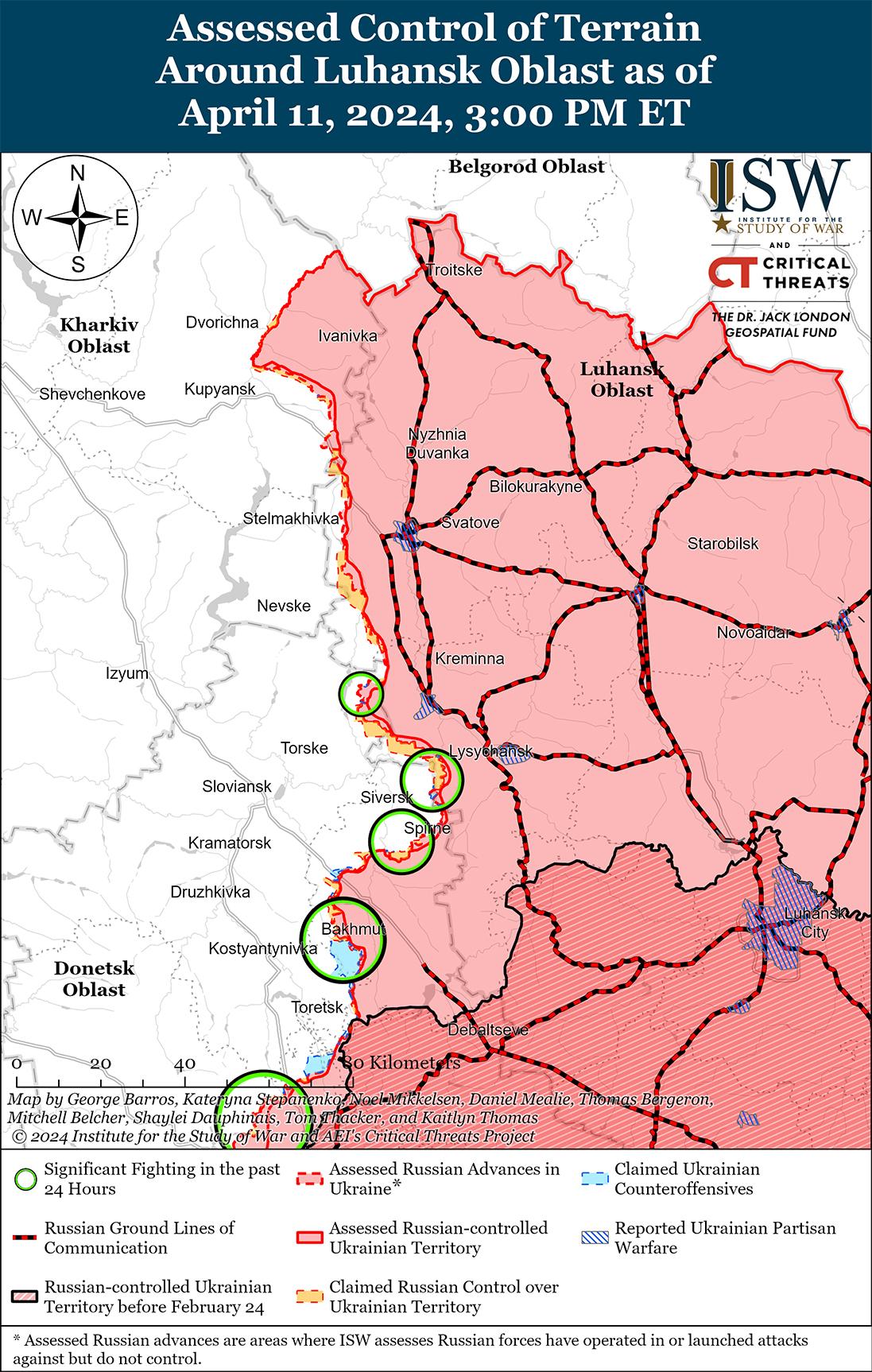 Недавно российские войска подтвердили продвижение в направлении Часового Яра на фоне продолжающихся позиционных боев 11 апреля. Геолоцированные кадры, опубликованные 10 апреля, о которых ранее сообщал ISW, также указывают на то, что российские войска продвинулись к западу от Ивановского (к востоку от Часового Яра) вдоль трассы Т0504 (Бахмут-Часов Яр). [32] Российские военблогеры утверждали, что российские войска, включая подразделения 98-й дивизии ВДВ, продолжали атаковать в районе микрорайона «Канал» (крайняя восточная часть Часового Яра) и в районе Богдановки (к северо-востоку от Часового Яра).[33] Позиционные бои продолжались в районе Часов Яра, Ивановского и Клещеевки.[34]