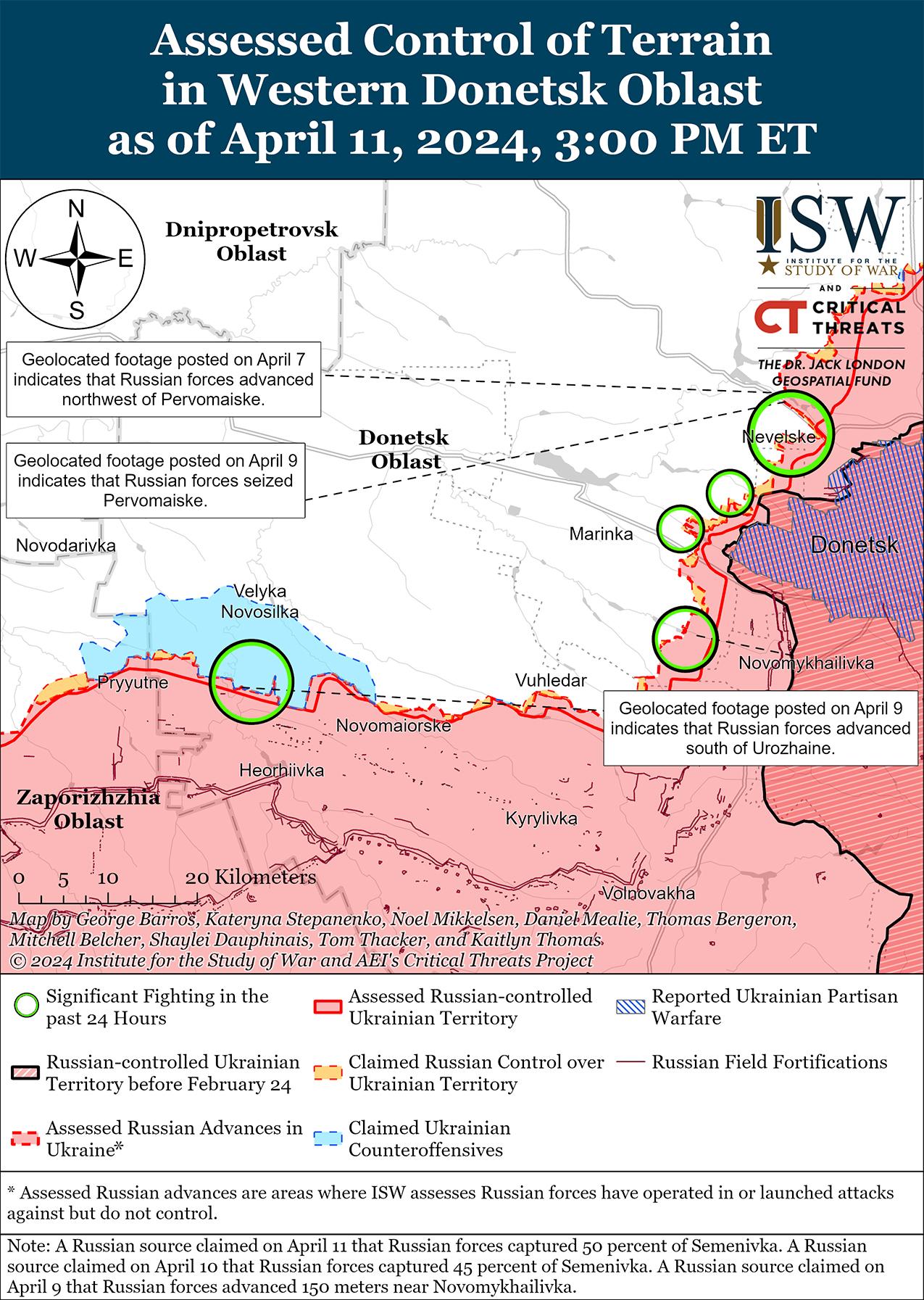 11 апреля позиционные бои продолжались к западу от Авдеевки, но подтвержденных изменений на линии фронта не было. Российские военные блогеры утверждали, что российские войска продвинулись на 2,5 километра в глубину между Яснобродовкой и Уманским (оба к западу от Авдеевки), вышли на юго-восточную окраину Уманского и контролируют почти половину Семеновки (к западу от Авдеевки), хотя ISW не обнаружил визуальных доказательств этих заявлений. [35] Продолжались позиционные бои северо-восточнее Авдеевки в районах населенных пунктов Новокалиново, Керамик, Новобахмутовка и Бердичи; западнее Авдеевки в районе Уманского и Семеновки; и юго-западнее Авдеевки в районе Первомайского и Нетайлова. [36] Сообщается, что подразделения 9-й мотострелковой бригады (1-й АК ДНР) продолжают действовать в районе Первомайского. [37]