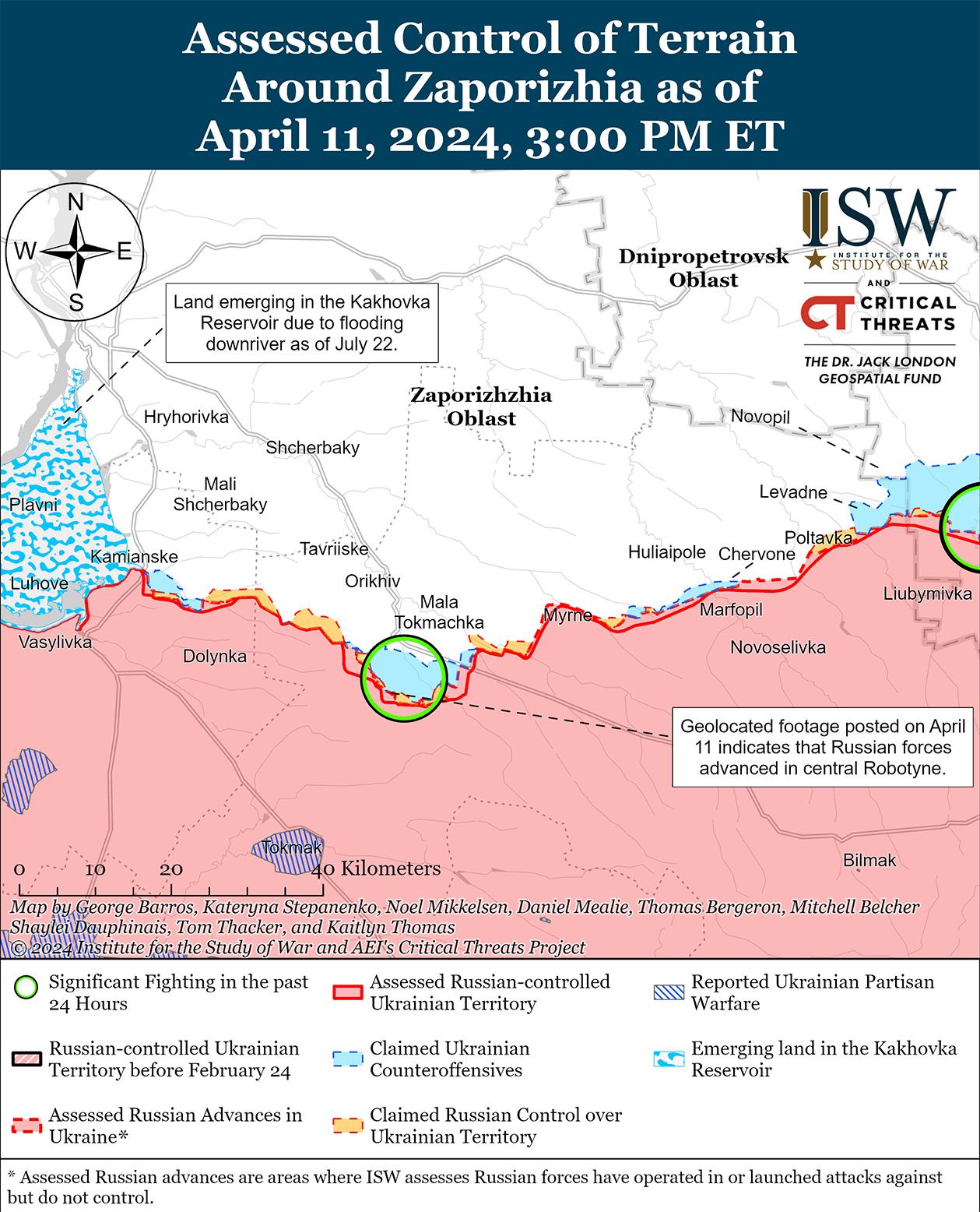 Российские войска недавно продвинулись на западе Запорожской области на фоне продолжающихся позиционных боев в этом районе 11 апреля. Геолоцированные кадры, опубликованные 9 апреля, указывают на то, что российские войска в последнее время незначительно продвинулись в западной части Работино. [43] Позиционные бои продолжались в районе Работино и к северо-западу от Вербовое (к востоку от Работино). [44] Подразделения российской 76-й воздушно-десантной дивизии (ВДВ) действуют в районе Очеретуватое (юго-восточнее Работино). [45]