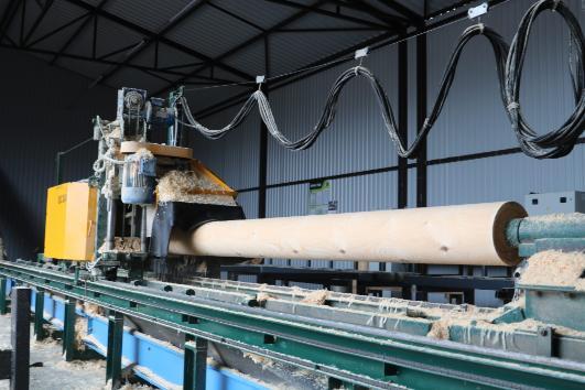 Мы побывали на производстве и посмотрели, как работает новая линия оцилиндровки бревен. Начальник деревообрабатывающего цеха Игорь Себровский пояснил, что процесс полностью автоматизирован. В программу заложены необходимые параметры, работникам остается только выставить те или иные режимы. На домокомплекты идут отборные сосновые сортименты определенного диаметра. Только так можно обеспечить качество конечной продукции. Бревно подается на рабочую поверхность станка. Его пропускают через установку трижды: в первый заход оно очищается от коры и приобретает цилиндрическую форму, затем делается компенсационный паз (то есть прорези сверху и снизу, чтобы одно бревно в последующем можно было положить на другое), третьим заходом вырезаются так называемые чашки, или полукруглые углубления на углы. После этого бревно подается на рольганг, где торцуется, а затем его перемещают на площадку готовой продукции.
