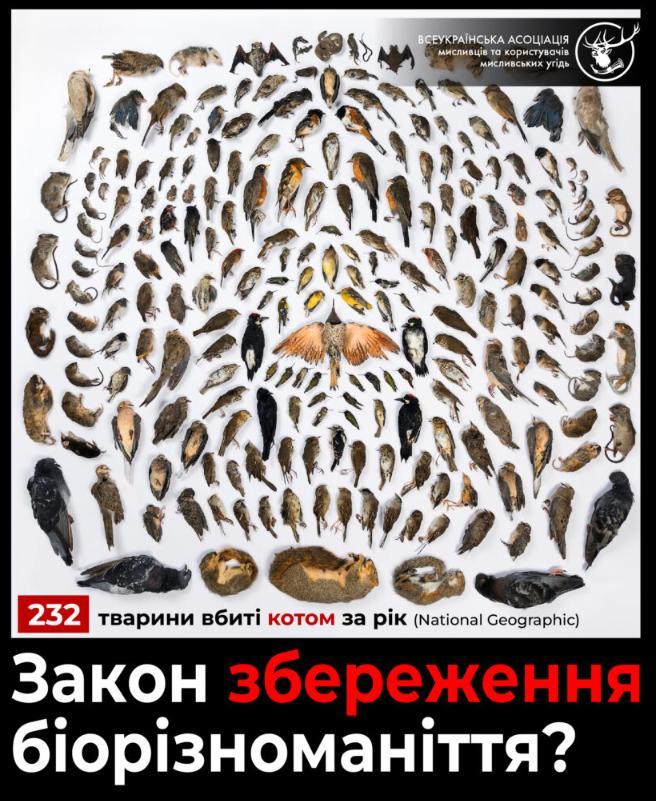 Також вищезазначеним проєктом Закону бродячих котів і термін «шкідливі тварини» пропонується взагалі видалити із мисливського законодавства. Це неприпустимо, адже здичавілі коти в мисливських угіддях наносять значної, не меншої, ніж здичавілі собаки, шкоди, особливо птахам, у тому числі, червонокнижним. Всесвітньо визнано, що коти займають перше місце серед домашніх тварин щодо загрози фауністичному різноманіттю. Наприклад польські вчені з Інституту дослідження ссавців та біології ссавців Державної академії наук порахували, що коти в їхній країні знищують майже 800 млн тварин на рік. В останні роки з’явилися наукові аргументи, що кішки є фактором ризику для виживання видів, що вимирають, зокрема птахів. Науковці переконують, що домашні кішки полюють на диких хребетних і скорочують їх кількість, що призводить до вимирання в місцевому масштабі. Оцінюється, що в Канаді кожного року коти щороку знищують лише птахів до 350 млн особин, а в США вони забирають життя у 12 млрд ссавців.