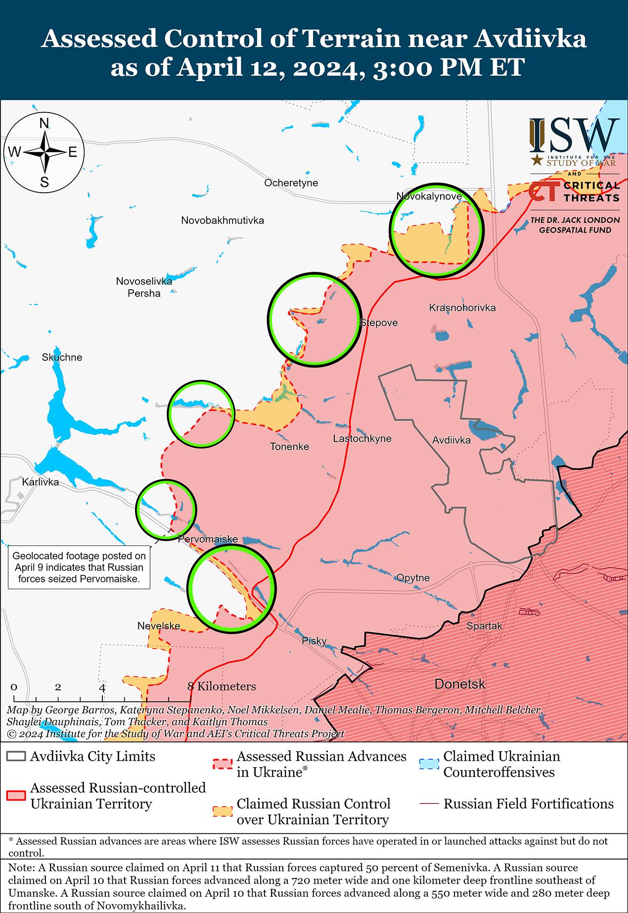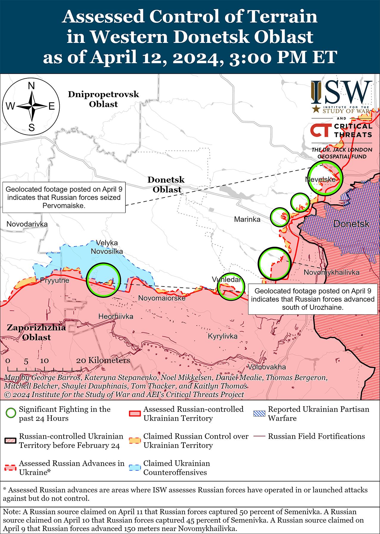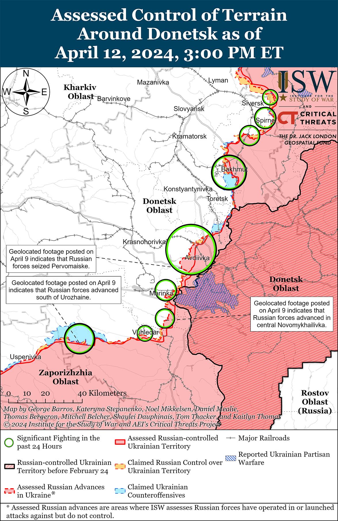 Российские войска недавно добились незначительных успехов к западу от Авдеевки на фоне продолжающихся боев в этом районе 12 апреля. На геолоцированных кадрах, опубликованных 12 апреля, видно, что российские войска недавно незначительно продвинулись к северу от Бердичей (к северо-западу от Авдеевки) и к югу от Уманского (к западу от Авдеевки). [31] Российские военные блогеры также утверждали, что российские войска продвинулись на полях к северу и югу от Новокалиново (северо-запад Авдеевки), где российские войска наносят тяжелые удары планирующими бомбами, однако ISW не обнаружил визуальных подтверждений этих успехов. [32] Позиционные бои продолжались также северо-западнее Авдеевки в районе Новобахмутовки; западнее Авдеевки в районе Тоненького, Семеновки и Яснобродовки; и юго-западнее Авдеевки в районе Первомайского и Нетайлова. [33]