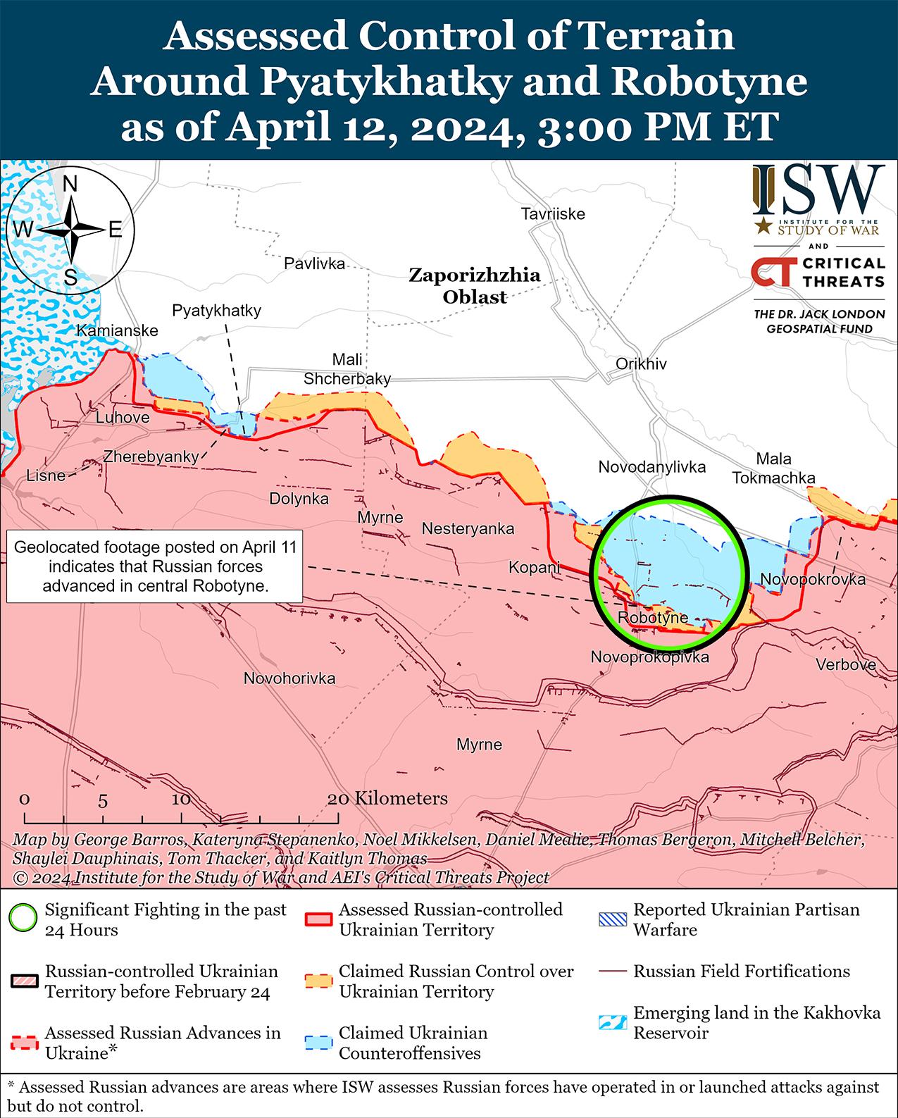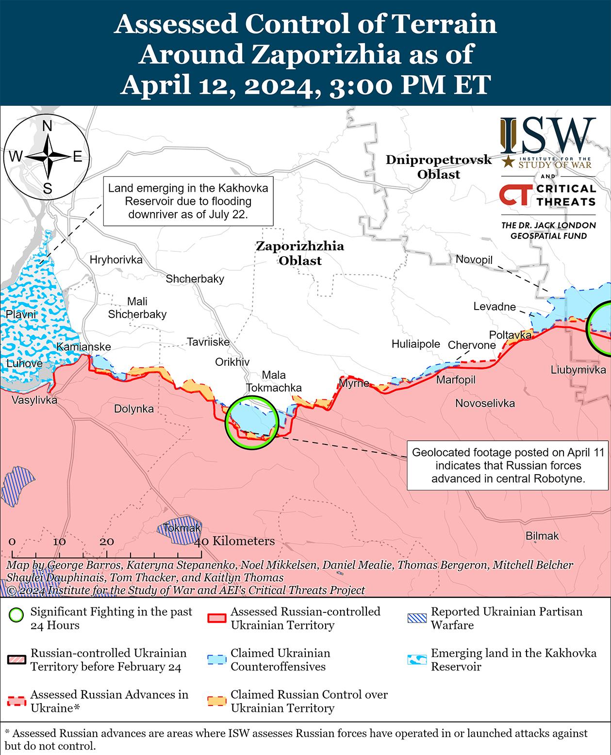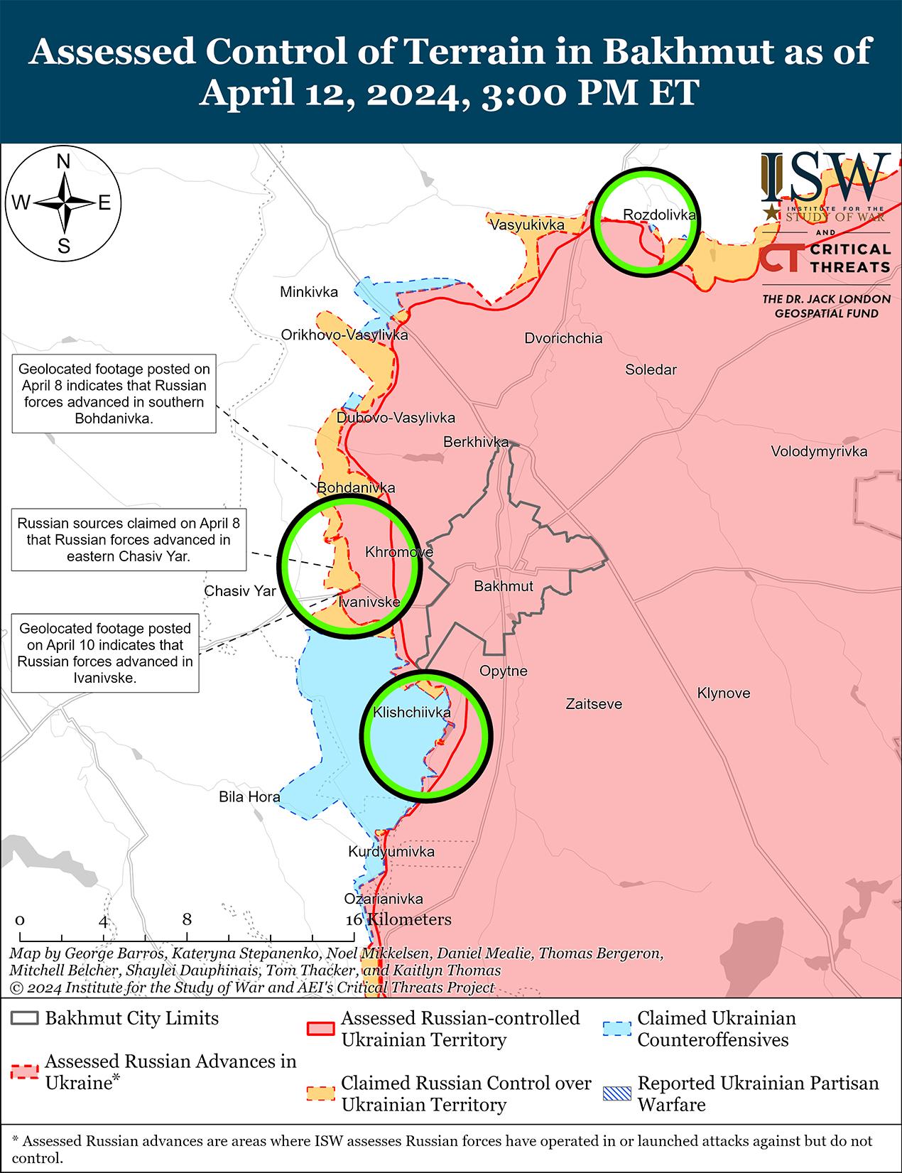 Российские войска недавно добились незначительных успехов к западу от Авдеевки на фоне продолжающихся боев в этом районе 12 апреля. На геолоцированных кадрах, опубликованных 12 апреля, видно, что российские войска недавно незначительно продвинулись к северу от Бердичей (к северо-западу от Авдеевки) и к югу от Уманского (к западу от Авдеевки). [31] Российские военные блогеры также утверждали, что российские войска продвинулись на полях к северу и югу от Новокалиново (северо-запад Авдеевки), где российские войска наносят тяжелые удары планирующими бомбами, однако ISW не обнаружил визуальных подтверждений этих успехов. [32] Позиционные бои продолжались также северо-западнее Авдеевки в районе Новобахмутовки; западнее Авдеевки в районе Тоненького, Семеновки и Яснобродовки; и юго-западнее Авдеевки в районе Первомайского и Нетайлова. [33]