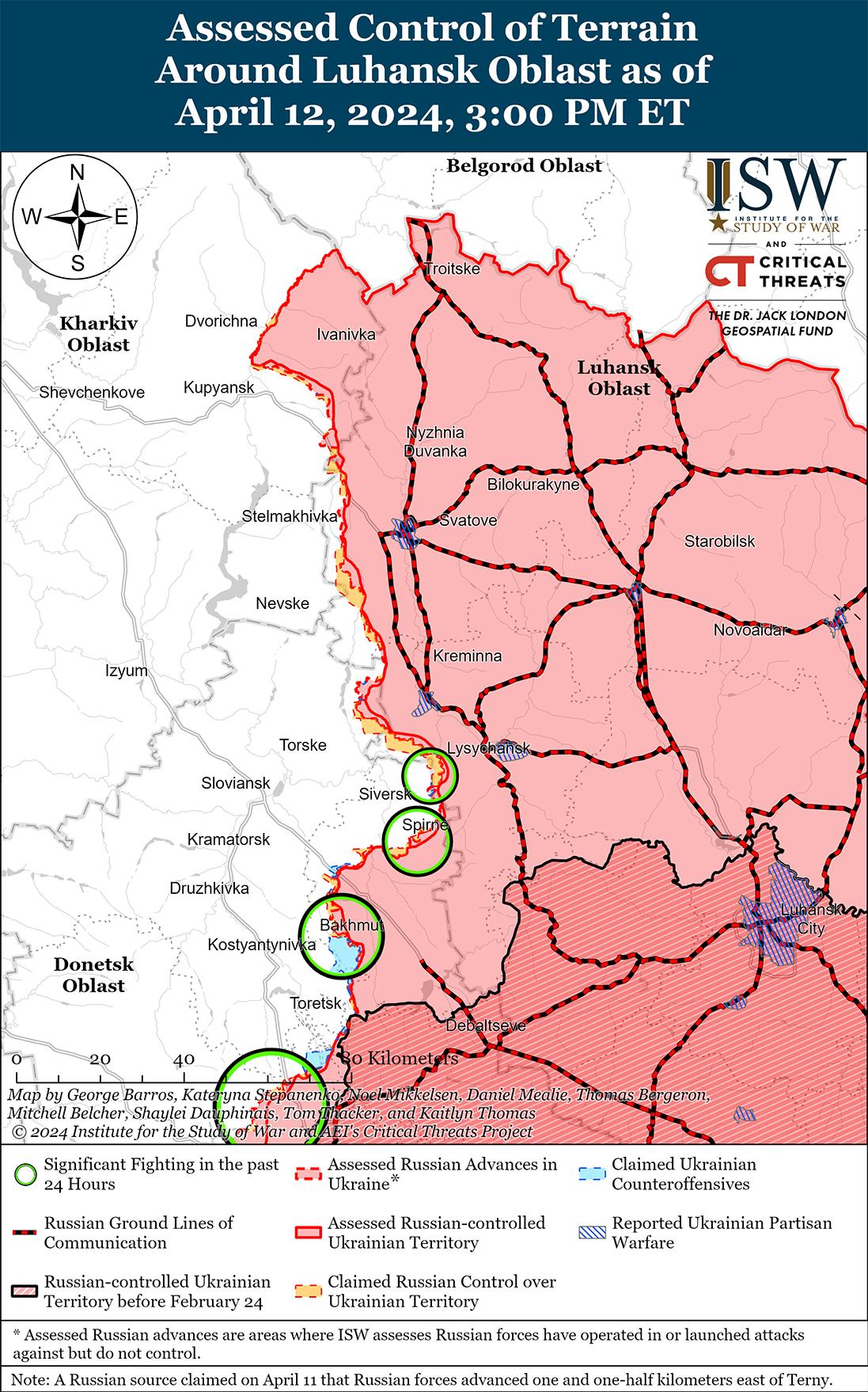 12 апреля в районе Кременной продолжались ограниченные позиционные бои. 11 апреля российский военный блогер заявил, что российские войска отбросили украинские войска на 1,5 километра в районе Крупной Балки к востоку от Терны (к западу от Кременной), хотя ISW не обнаружил визуального подтверждения этого заявления. [22] К югу от Кременной в районе Белогоровки продолжались позиционные бои, и украинский Генштаб сообщил, что российские войска не проводили никаких атак ни на Лиманском, ни на Купянском направлении. [23]