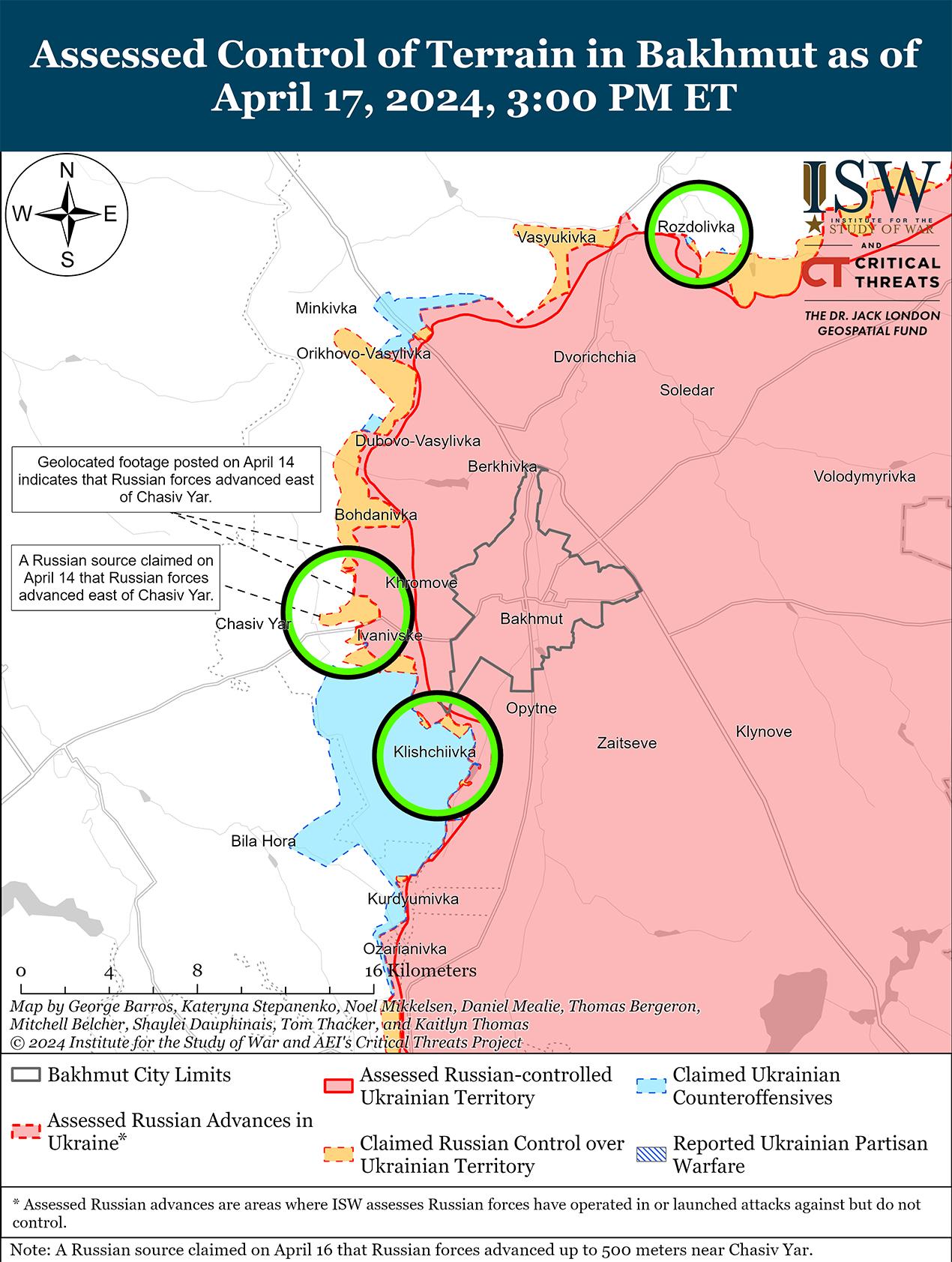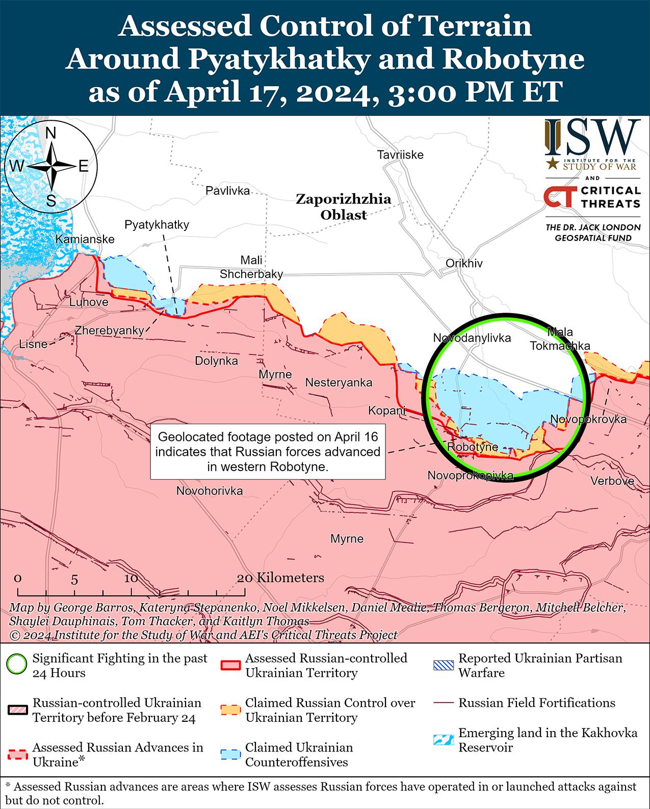 Сообщается, что российские войска продвинулись к северо-востоку от Часового Яра и 17 апреля продолжили наступательные действия в этом районе. 16 и 17 апреля российские военные блогеры утверждали, что российские войска захватили всю Богдановку (к северо-востоку от Часов Яра), продвинулись ближе к Калиновке (к северу от Часов Яра) и продвинулись на глубину до 500 метров в дачных районах к северу от Нового Микрорайона (восточный Часов Яр). [44] ISW не обнаружил визуальных подтверждений этих российских заявлений. Бои продолжались к северо-востоку от Часов Яра в районе Богдановки; вблизи Часов Яра и Нового микрорайона; восточнее Часов Яра в районе Ивановского; и юго-восточнее Часов Яра в районе Клещеевки. [45] Спикер Хортицкой группировки войск подполковник Назар Волошин заявил, что российские войска атакуют небольшими штурмовыми группами в районе Часов Яра и используют квадроциклы для быстрой переброски и выгрузки пехоты в районах боевых действий. [46] Командир украинского батальона, действовавшего в районе Часов Яра, заявил, что российские войска теряют от 40 до 70% своей техники во время штурмов. [47] Командир батальона заявил, что украинские силы используют беспилотники с видом от первого лица (FPV), чтобы остановить продвижение российской бронетехники, и что украинские силы используют около 50 FPV для нанесения ударов по 20-25 российским целям каждый день. [48] Сообщается, что в районе Богдановки действуют подразделения российской 200-й мотострелковой бригады (Ленинградский военный округ, бывший Северный флот), а на бахмутском направлении – подразделения 83-й воздушно-десантной бригады (ВДВ). [49] Части 98-й дивизии ВДВ, в том числе 331-й полк ВДВ; 11-я бригада ВДВ; и 102-й мотострелковый полк (150-я мотострелковая дивизия, 8-я общевойсковая армия [ОА], Южный военный округ [ЮВО]), действуют на окраинах Часов Яра. [50]