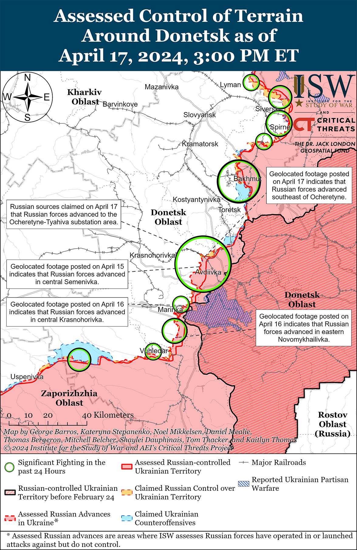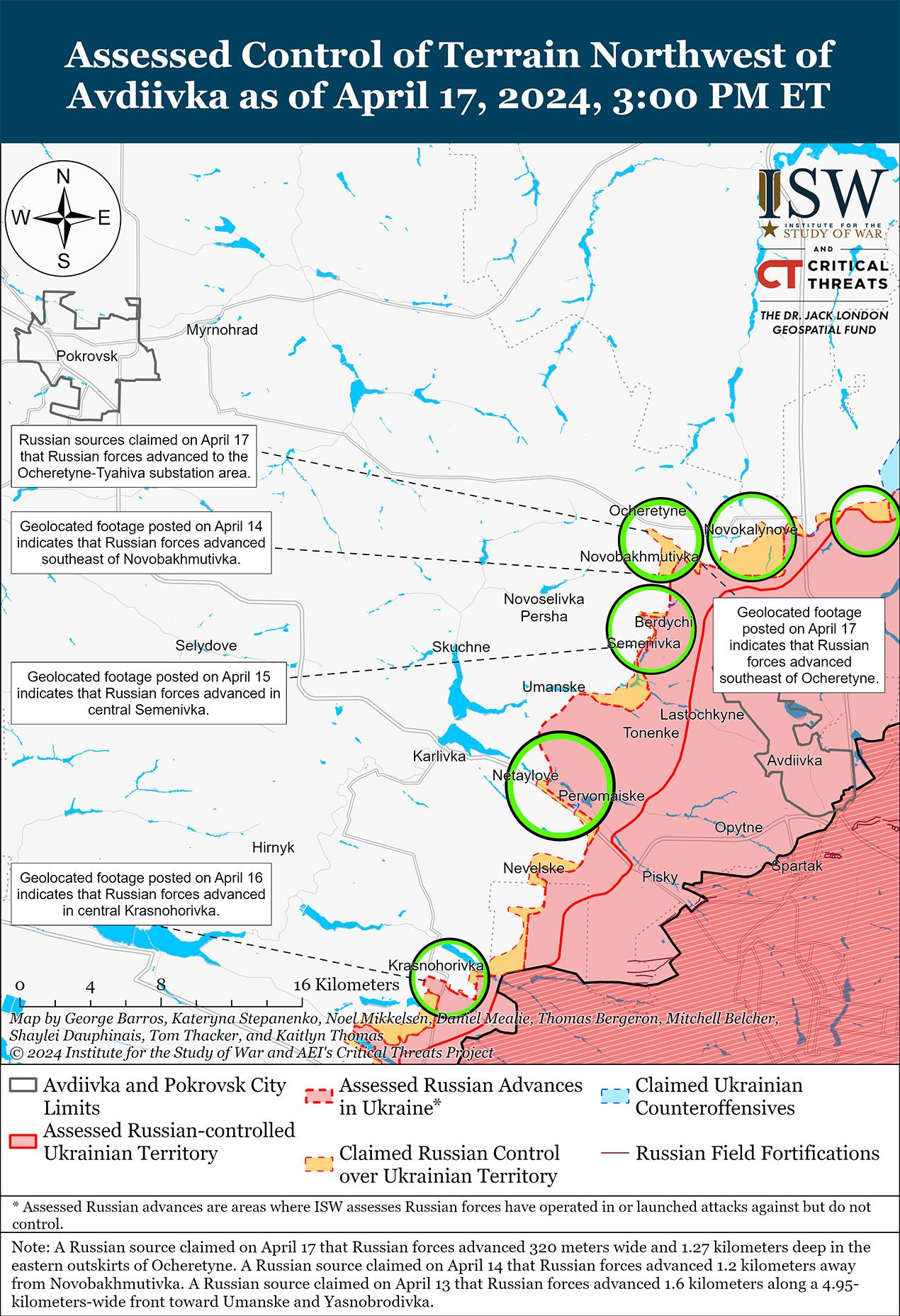 Недавно российские войска продвинулись к западу от Авдеевки и 17 апреля продолжили наступательные действия в этом районе. Геолоцированные кадры, опубликованные 17 апреля, свидетельствуют о том, что российские войска недавно продвинулись вдоль железнодорожной линии к юго-востоку от Очеретино (северо-западнее Авдеевки). [51] На геолоцированных кадрах, опубликованных 14 апреля, видно, что российские войска недавно продвинулись в западной части Орловки (к западу от Авдеевки). [52] Российские военные блогеры утверждали, что российские войска продвинулись к юго-восточным окраинам Очеретино и вошли в северные окраины Нетайлова (юго-запад Авдеевки), хотя ISW не обнаружил визуальных подтверждений этих заявлений. [53] Бои продолжались северо-западнее Авдеевки в районе Очеретино, Новобахмутовки, Новокалиново и Бердичей; западнее Авдеевки в районе Семеновки и Уманского; и юго-западнее Авдеевки в районе Нетайлова и Первомайского. [54] Сообщается, что подразделения 9-й мотострелковой бригады (1-й АК Донецкой Народной Республики [ДНР]) действуют в районе Первомайского. [55]