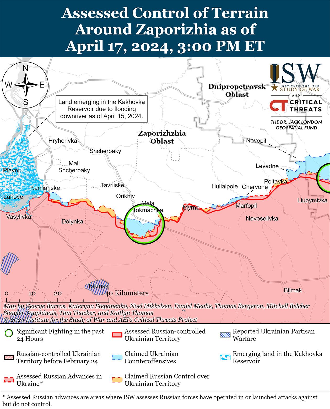 17 апреля на западе Запорожской области продолжались позиционные бои, однако подтвержденных изменений на линии фронта не было. Продолжались позиционные бои в районе Работино, северо-западнее Вербовое (восточнее Работино) и в районе Малой Токмачки (северо-восточнее Работино). [61] Бывший глава Роскосмоса и ультранационалист Дмитрий Рогозин заявил 17 апреля, что российские войска установили в окопах системы радиоэлектронной борьбы (РЭБ), которые способны успешно подавлять украинские беспилотники, управляемые через Starlink на Запорожском направлении. [62] Министерство обороны России заявило, что на Запорожском направлении действуют подразделения российского отряда БАРС-10 (58-я общевойсковая армия [ОА], Южный военный округ [ЮВО]). [63]