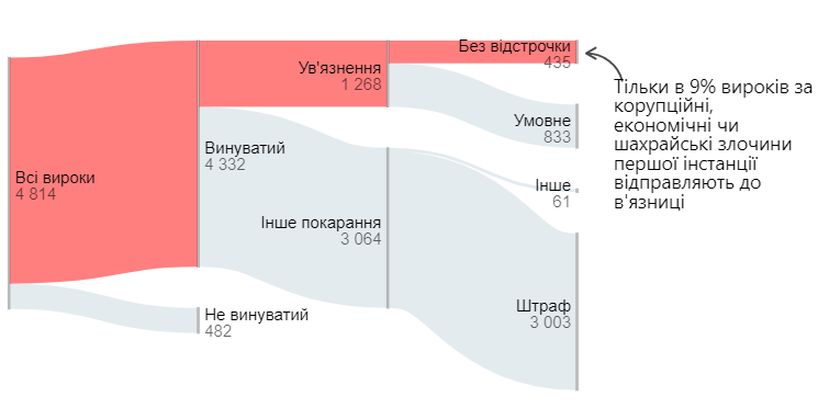 Загалом з 4,8 тис проаналізованих вироків у першій інстанції лише в 9% випадків усе закінчилося максимально суворим покаранням (безальтернативним ув’язненням). З урахуванням апеляцій ця частка може бути ще меншою. Проте є велика різниця між видами злочинів, що впливає на вірогідність бути виправданим і на те, чи потрапить обвинувачений за ґрати.