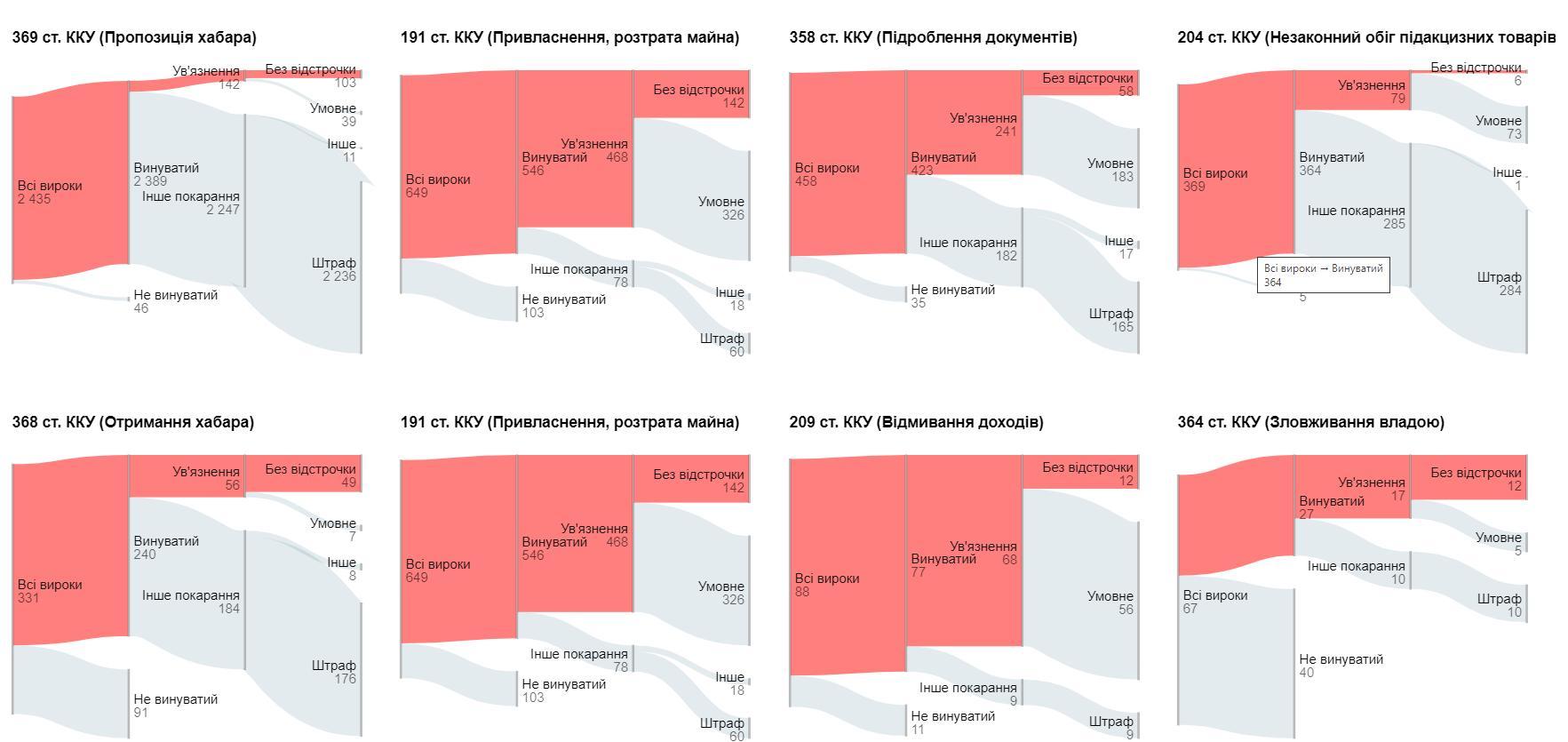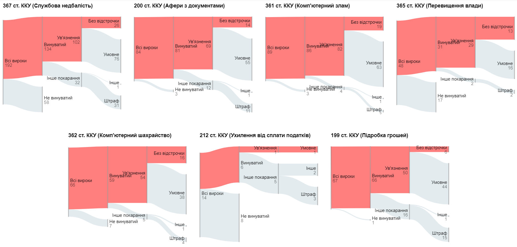 Інша ситуація – із ст. 368 (отримання хабаря), де у 27% випадках обвинувачених, як правило, чиновників, виправдовують. Стається це через ту саму угоду зі слідством, коли більшість визнаних винуватими (76%) отримують м’які покарання.