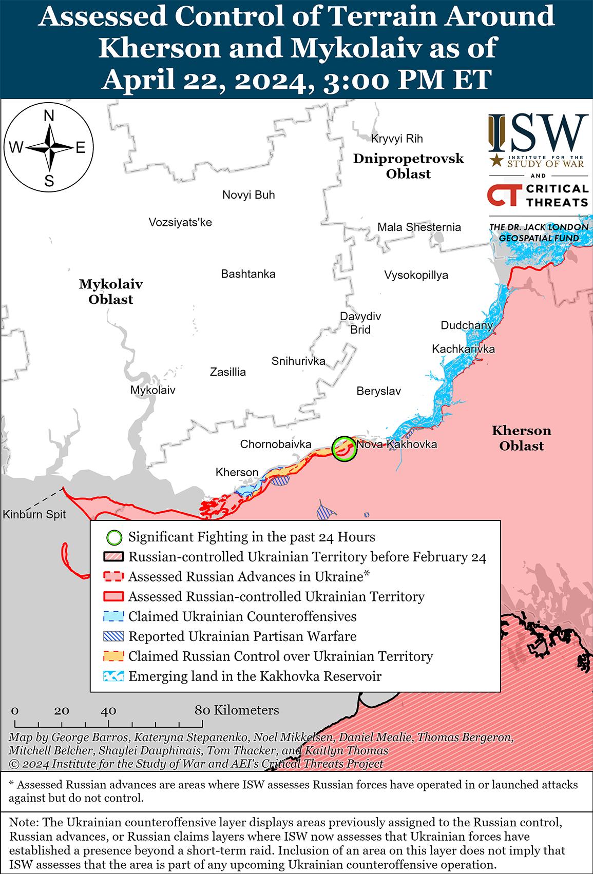 Российские военные блогеры продолжили реагировать на принятие Палатой представителей США 20 апреля законопроекта о дополнительных ассигнованиях на оказание помощи Украине, продвигая нарративы, призванные удержать американских политиков от завершения оказания помощи и ослабить ожидания Запада и Украины относительно влияния американской помощи на поле боя. [79] Российские военные блогеры утверждали, что помощь США не повлияет на ситуацию на фронте, и утверждали, что США лишь оттягивают «неизбежное» поражение Украины от России. [80] По оценкам ISW, 20 апреля кремлевские чиновники и рупоры, скорее всего, активизируют информационные операции, направленные на ослабление поддержки Украины со стороны США и Запада и поощрение самосдерживания Запада после принятия Палатой представителей США законопроекта о помощи Украине. [81]