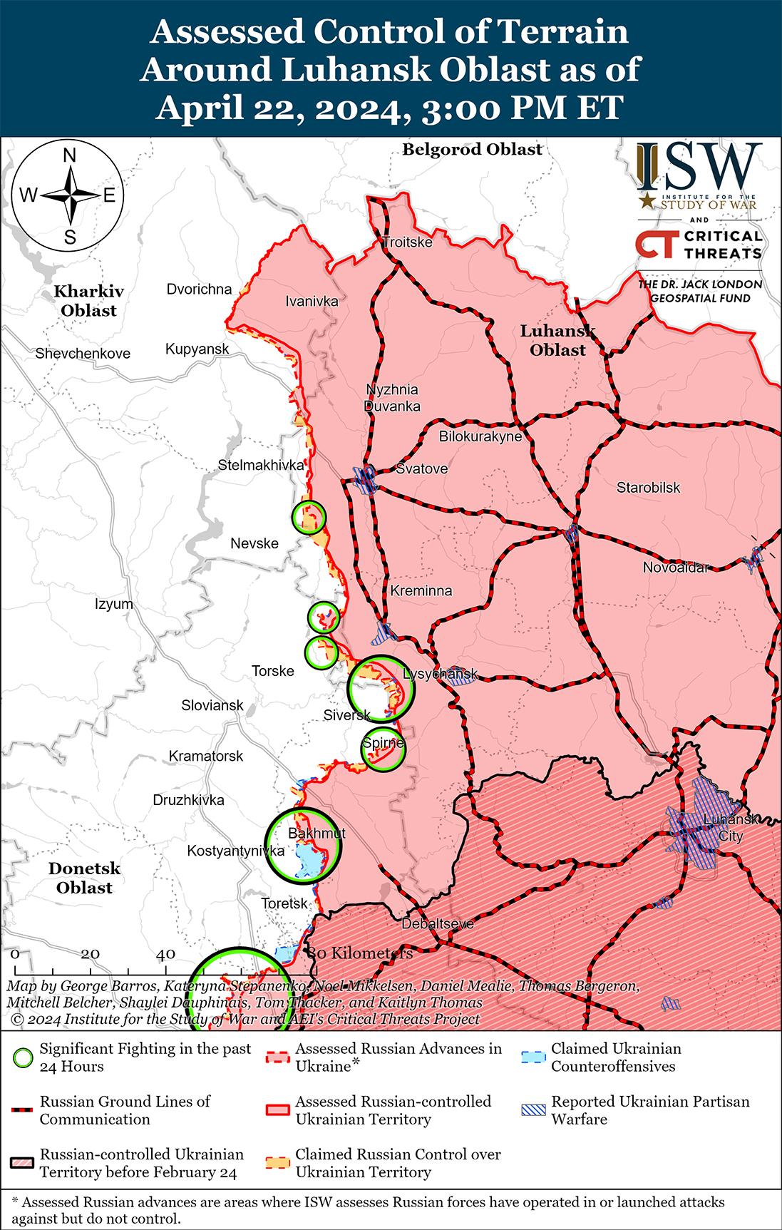 22 апреля российские войска продолжили наступательные действия в направлении Часового Яра, но подтвержденных успехов не добились. Несколько российских блогеров продолжали утверждать, что украинские войска покинули Богдановку (к северо-востоку от Часового Яра) и что российские войска завершили захват населенного пункта после предполагаемого ухода украинцев, хотя ISW пока не обнаружил визуального подтверждения российского контроля над всей Богдановкой. [28] 22 апреля пресс-секретарь украинской Хортицкой группировки войск подполковник Назар Волошин заявил, что от 20 000 до 25 000 российских военнослужащих пытаются штурмовать окраины Часового Яра, и отметил, что особую активность в этой работе проявляют подразделения 217-го гвардейского парашютно-десантного полка (98-й дивизии ВДВ). [29] Волошин также сообщил, что российские войска проводят разведывательные операции против украинских позиций на окраинах Часового Яра, чтобы создать условия для будущих наземных атак. Генеральный штаб Украины сообщил о продолжении российских атак к востоку от Часового Яра в районе Ивановского и к юго-востоку от Часового Яра в районе Клещеевки и Андреевки. [30] Сообщается, что подразделения 331-го и 217-го полков 98-й дивизии ВДВ, 11-й бригады ВДВ и бригады «Север-В» (Российский добровольческий корпус) продолжают действовать в районе Часового Яра. [31]