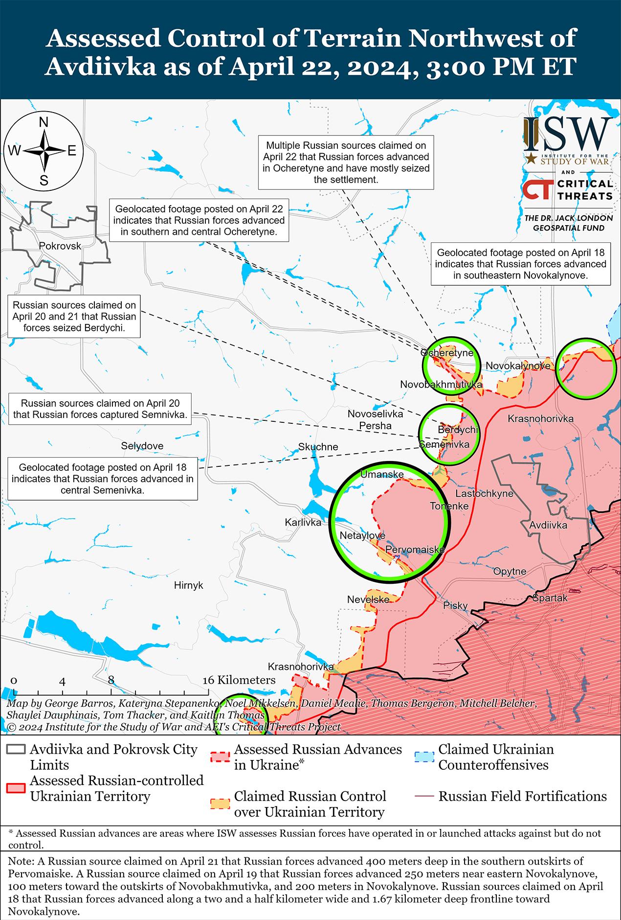 Недавно российские войска добились подтвержденных успехов в Очеретино (северо-запад Авдеевки) на фоне продолжающихся боев в районе Авдеевки. На кадрах, опубликованных 22 апреля, видно, как российские войска поднимают российский флаг над зданием Очеретинской военно-гражданской администрации в центре Очеретино, что позволяет предположить, что российские войска захватили железнодорожную станцию, пересекли железнодорожную линию и продвинулись на север в центральную часть населенного пункта. [33] На дополнительных кадрах, опубликованных 22 апреля, видно, что российские войска также продвинулись к другому зданию на юге Очеретино. [34] Один российский блогер утверждал, что российские войска «почти полностью» захватили Очеретино, а украинские войска удерживают позиции только на кирпичном заводе в западной части Очеретино. [35] ISW пока не обнаружил визуального подтверждения российского контроля над всем Очеретино. Российские военные блогеры также утверждали, что российские войска вытеснили украинские войска из Семеновки (к северо-западу от Авдеевки), хотя ISW пока не обнаружил доказательств того, что российские войска контролируют северо-западную часть Семеновки. [36] Российский блогер утверждал, что подразделения российской 9-й мотострелковой бригады (1-й армейский корпус ДНР) добились незначительных тактических успехов к западу от Первомайского в районе Нетайлова (оба к юго-западу от Авдеевки). [37] Другой российский блогер утверждал, что российские войска продвинулись на глубину до 400 метров на южной окраине Первомайского, хотя ISW пока не зафиксировал визуальных подтверждений продвижения российских войск в этом районе. [38] Сообщается, что за Очеретино ведут бои подразделения российского 433-го мотострелкового полка (27-я мотострелковая дивизия, 2-я общевойсковая армия, Центральный военный округ), а в районе Бердичей (северо-западнее Авдеевки) – подразделения 74-й мотострелковой бригады (41-я ОА). [39]