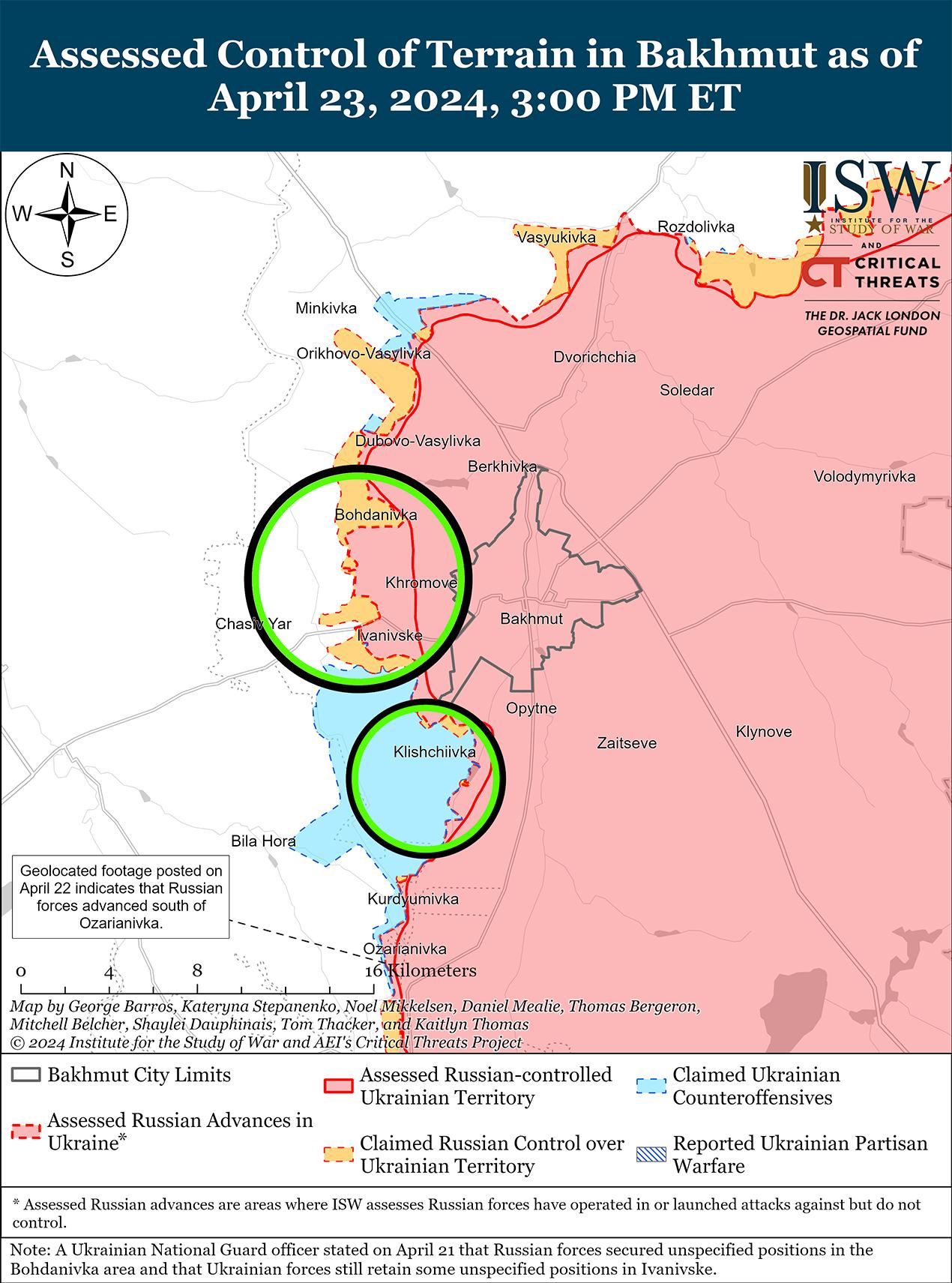 Украинские силы недавно восстановили утраченные позиции к востоку от Часового Яра, в то время как российские войска продолжили наступательные действия в этом районе 23 апреля. Геолоцированные кадры, опубликованные 22 апреля, свидетельствуют о том, что украинские силы недавно незначительно продвинулись к юго-востоку от Ивановского (к востоку от Часового Яра). [40] Командир чеченского спецназа «Ахмат» Апти Алаудинов утверждал, что части спецназа «Ахмат» и российской 4-й мотострелковой бригады (2-й АК ЛНР) захватили несколько украинских позиций на западной окраине Клещеевки (юго-восток Часового Яра), но ISW не обнаружил визуальных подтверждений этому заявлению. [41] Российские блогеры утверждали, что подразделения российской 98-й воздушно-десантной дивизии (ВДВ) и батальона «Сармат» Донецкой Народной Республики (ДНР) интернациональной добровольческой бригады «Пятнашка» атаковали восточные окраины Часов Яра. [42] Один российский военный блогер призвал российские войска уделять первоочередное внимание захвату Нового микрорайона на востоке Часового Яра, а не продолжать, по их словам, тактически незначительные усилия по продвижению к Часовому Яру из Богдановки (к северо-востоку от Часового Яра). [43] Продолжались позиционные бои в районе Богдановки, в Новом микрорайоне, к востоку от Часов Яра в районе Ивановского и юго-восточнее Часов Яра в районе Клещеевки и Андреевки. [44] Пресс-секретарь украинской Хортицкой группировки войск подполковник Назар Волошин заявил, что Бахмутское, Авдеевское и Новопавловское направления (к западу и юго-западу от Донецка) в настоящее время являются наиболее интенсивными на востоке Украины. [45]