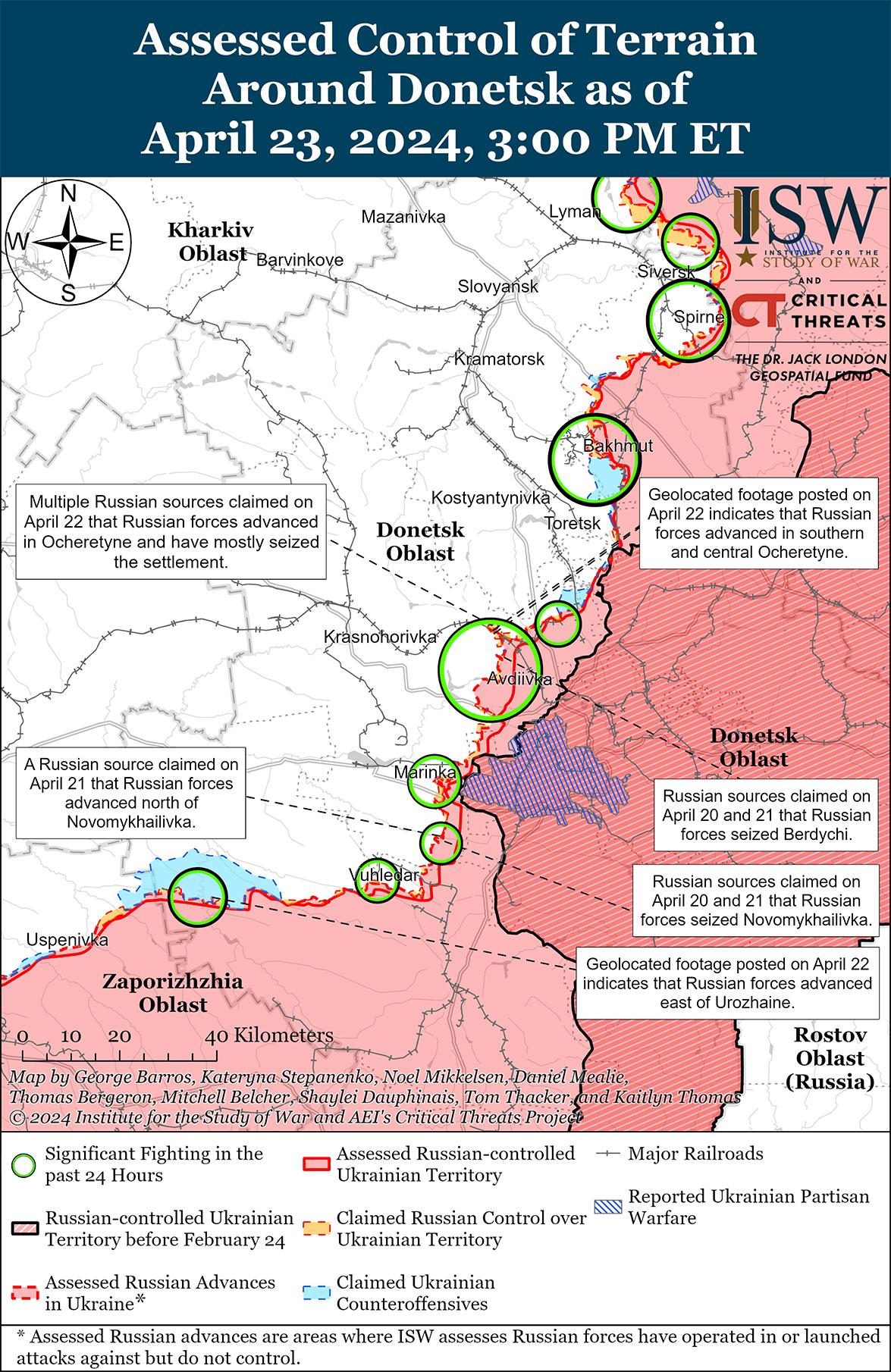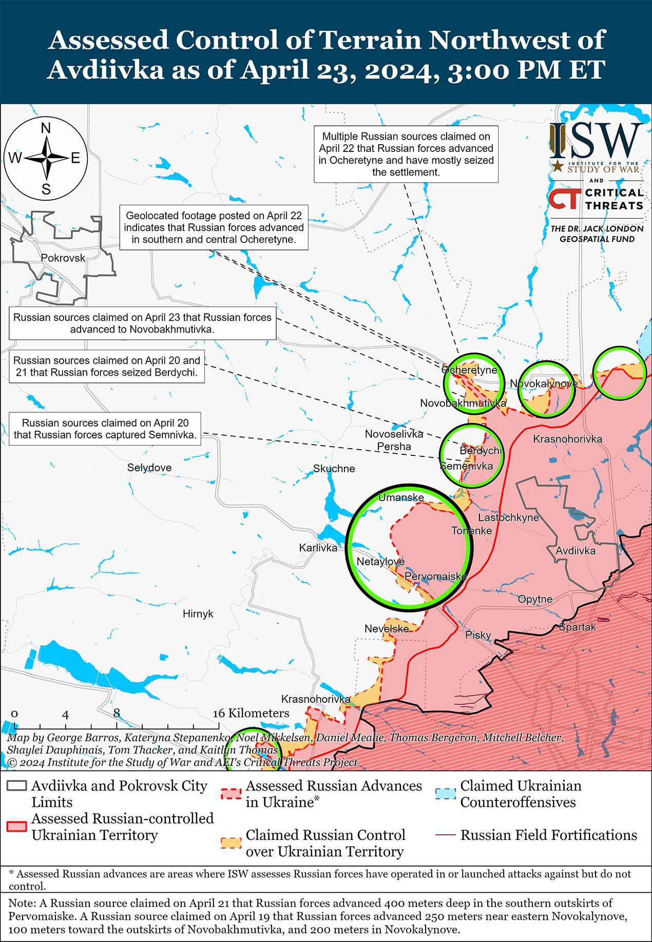 Российские и украинские источники продолжали спорить о масштабах заявленного продвижения россиян к северо-западу от Авдеевки 23 апреля, но подтвержденных изменений линии фронта на этом участке не было. Большинство российских блогеров утверждали, что российские войска захватили Очеретино (к северо-западу от Авдеевки), хотя некоторые из них утверждали, что российские войска имеют более ограниченные позиции в южной половине населенного пункта, а украинские силы сохраняют присутствие на западных окраинах. [46] Несколько российских военных блогеров утверждали, что российские войска прорвали украинскую оборонительную линию, которая, как сообщается, простирается от Очеретино до Нетайлова (с северо-запада на юго-запад от Авдеевки), в том числе один российский военный блогер утверждал, что российские войска продвинулись на пять километров в глубину за украинскую оборонительную линию в Очеретино. [47] В украинской Хортицкой группе войск подчеркнули, что украинские силы по-прежнему контролируют большую часть Очеретино и сохраняют огневой контроль над южной частью населенного пункта, где пытаются наступать российские войска. [48] Украинская Хортицкая группировка войск также заявила, что российские войска используют все доступные средства и вооружение, в том числе неустановленное химическое оружие, для продвижения в районе Очеретино. [49] Российские военные блогеры утверждали, что российские войска также продвинулись до Новобахмутовки (северо-западнее Авдеевки и южнее Очеретино) и что украинские войска отходят с позиций в центре Новобахмутовки и Соловьево (северо-западнее Авдеевки). [50] ISW пока не обнаружил доказательств присутствия российских войск в Новобахмутовке или вывода украинских войск из нее. Российский военный блогер заявил, что российские войска в настоящее время не контролируют Новобахмутовку, но заявил, что российские войска, скорее всего, быстро захватят Новобахмутовку и Соловьево. [51] Бои продолжались северо-западнее Авдеевки в районе Керамика, Новокалиново, Бердичей и Семеновки; западнее Авдеевки в районе Уманского и Яснобродовки; и юго-западнее Авдеевки в районе Первомайского и Нетайлова. [52] Сообщается, что в Очеретино действуют подразделения 30-й мотострелковой бригады (2-я общевойсковая армия, Центральный военный округ), 27-й мотострелковой дивизии (2-я ОА) и 35-й мотострелковой бригады (41-я ОА). [53]