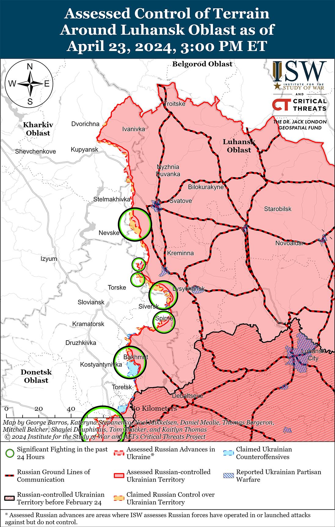23 апреля российские войска поддерживали относительно интенсивный темп наземных атак между Сватово и Кременной, но не добились каких-либо подтвержденных успехов. Украинский Генштаб сообщил, что украинские силы отразили атаки россиян к северо-западу от Сватово в районе Берестово; юго-западнее Сватово в районе Надии, Новоегоровки и Грековки; западнее Кременной в районе Терны, Торского и Ямполовки; юго-западнее Кременной в Серебрянском лесничестве; и южнее Кременной возле Белогоровки. [35] Минобороны России заявило, что украинские силы безуспешно контратаковали юго-западнее Кременной в районе Григорьевки. [36] Сообщается, что подразделения 2-й артиллерийской бригады (2-й армейский корпус Луганской Народной Республики [ЛНР]) действуют вблизи Белогоровки. [37]