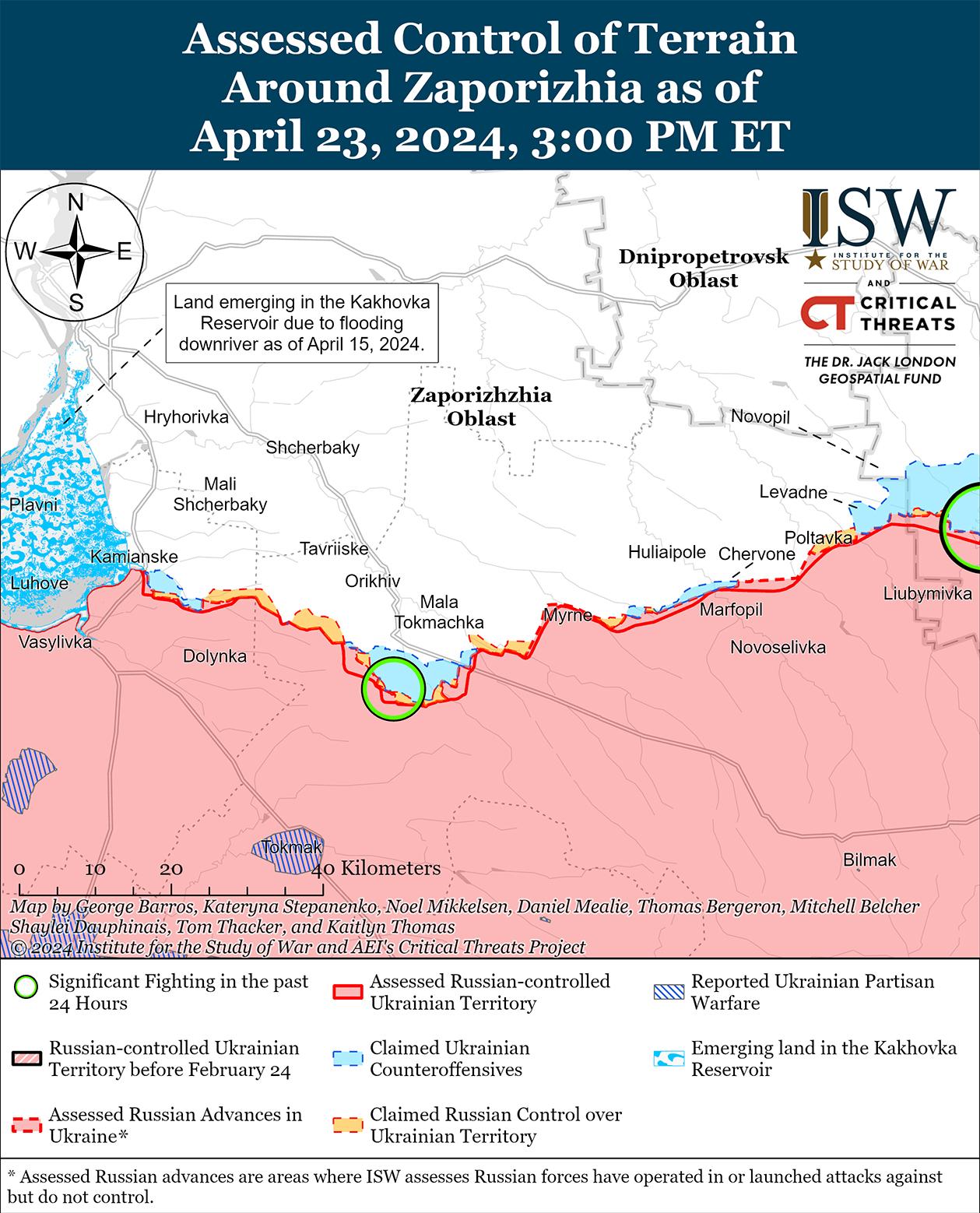 23 апреля на западе Запорожской области продолжались позиционные бои в районах населенных пунктов Работино и Вербовое (восточнее Работино). [64] Депутат оккупационной власти Запорожской области Владимир Рогов утверждал, что российские войска продвинулись на глубину до километра в районе Работино, хотя ISW не видел визуальных подтверждений этому заявлению. [65] Сообщается, что на западе Запорожской области действуют подразделения российского 429-го мотострелкового полка (19-я мотострелковая дивизия, 58-я общевойсковая армия, Южный военный округ) и, предположительно, подразделения 56-го воздушно-десантного полка (7-я дивизия ВДВ). [66]