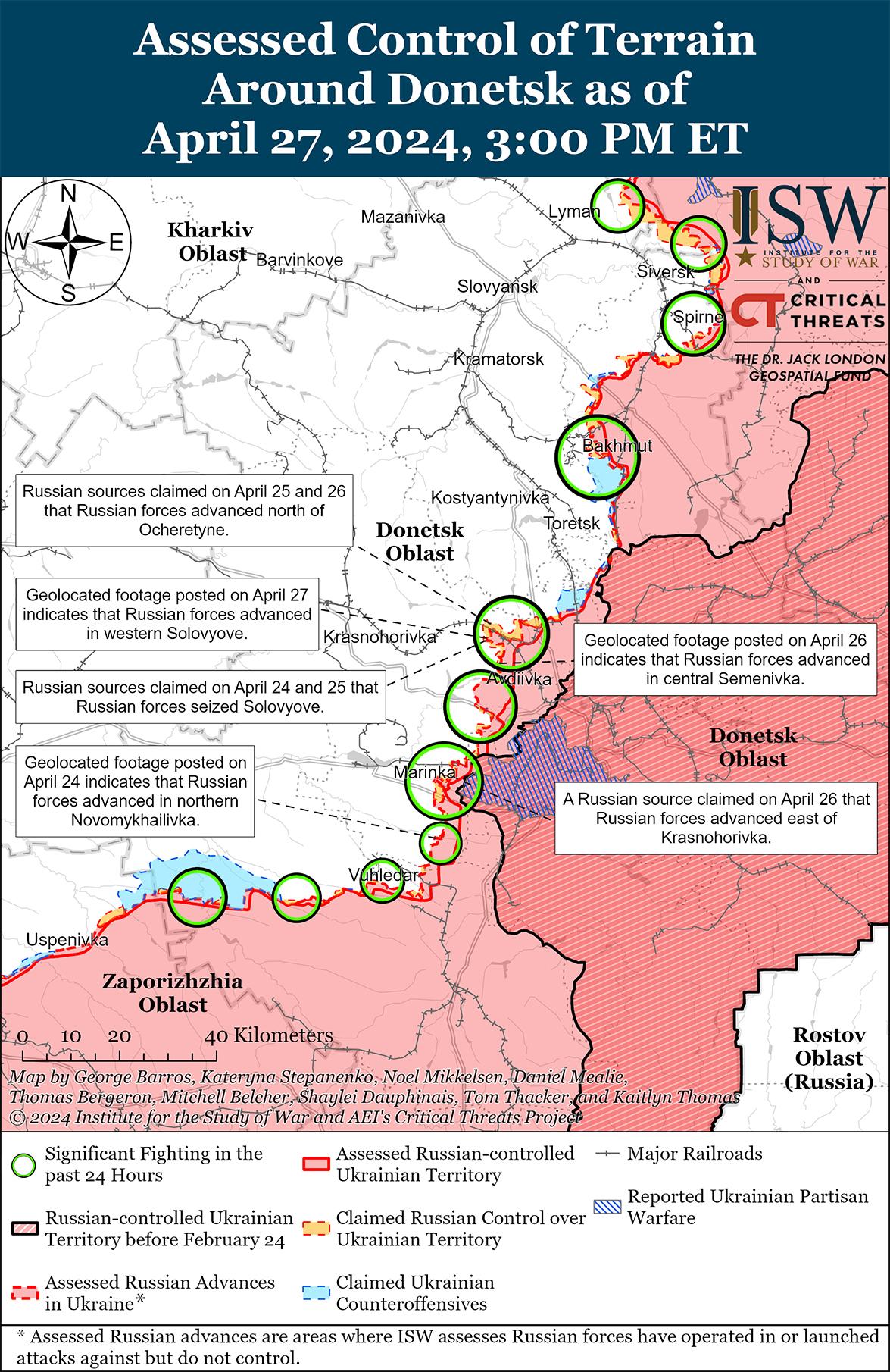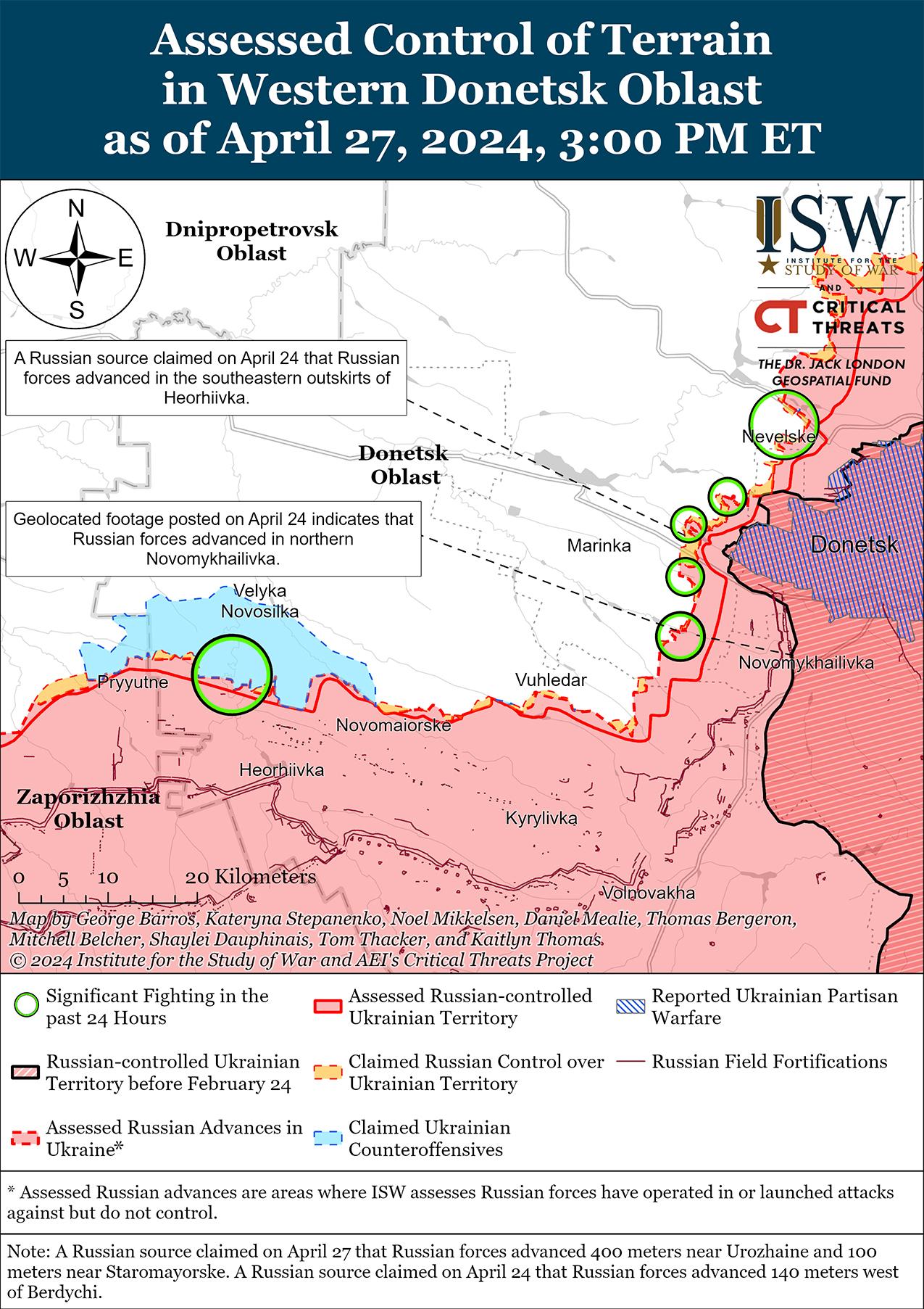 Российские войска, вероятно, добьются значительных тактических успехов в ближайшие недели, поскольку Украина ожидает прибытия на фронт помощи США в области безопасности, но вряд ли сможет сломить украинскую оборону. 26 апреля издание Politico сообщило, что президент Украины Владимир Зеленский в декабре 2023 года заявил спикеру Палаты представителей США Майку Джонсону, что украинские силы смогут «продержаться» до марта или апреля 2024 года без дополнительной помощи США в области безопасности, период, через который сейчас проходят украинские силы без прибытия военной помощи США. [1] Прибытие американской помощи на фронт в ближайшие недели позволит украинским силам справиться с текущими материальными ограничениями и притупить продолжающиеся российские наступательные операции, а российские силы, похоже, активизируют усилия по дестабилизации украинской обороны и завоеванию территорий в преддверии прибытия американской помощи в области безопасности. [2] Сообщается, что два офицера украинской разведки сообщили Financial Times, что российские войска намерены использовать продолжающиеся наступательные операции и ракетные удары по Украине, чтобы подготовить поле боя к ожидаемой крупномасштабной российской наступательной операции в конце мая или в июне. [3] Газета Financial Times сообщила, что западный чиновник заявил, что российские войска могут совершить дальнейшие «тактические прорывы» в ближайшие недели, но не «захватят» Украину. [4] Российские войска имеют возможность добиться значительных тактических успехов в районе Авдеевки и преследовать оперативно значимую цель с захватом Часового Яра; Однако ни одна из этих попыток вряд ли перерастет в оперативно значимое прорыв в ближайшей перспективе, не говоря уже о том, чтобы привести к краху украинской оборонительной линии в Донецкой области. [5]