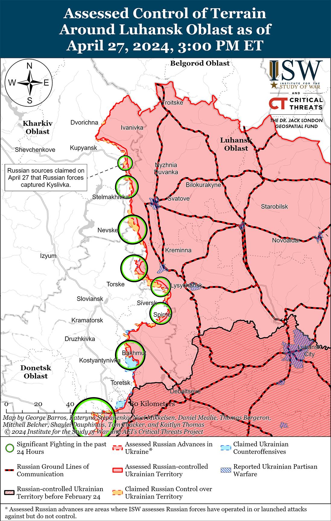 Российские войска активизировали действия к северо-западу от Сватово и, как сообщается, захватили Кисловку по состоянию на 27 апреля. Вечером 26 апреля российские военные блогеры заявили, что части 1-й гвардейской танковой армии РФ прорвали украинскую оборону в Кисловке, а несколько российских военных заявили, что российские войска захватили весь населенный пункт по состоянию на 27 апреля. [65] Российские военные блогеры утверждали, что российские войска продвинулись на глубину до 1,85 км вдоль железнодорожной линии, проходящей через Кисловку. [66] Российский военный блогер утверждал, что российские войска частично окружили соседние украинские войска в Котляровке (северо-западнее Сватово и юго-западнее Кисловки). [67] Визуального подтверждения этих российских заявлений ISW пока не наблюдает. Бои продолжались северо-западнее Сватово в районах населенных пунктов Берестовое, Кисловка и Стельмаховка. [68]