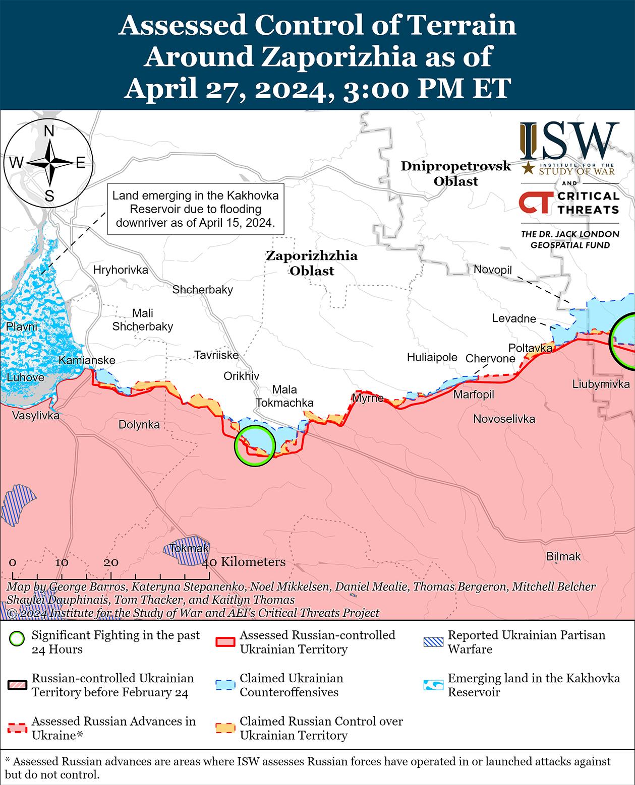 Российские источники утверждали, что 27 апреля российские войска продвинулись в районе границы Донецкой и Запорожской областей. Российский военный блогер заявил, что российские войска продвинулись на 400 метров в глубину возле Урожайное и на 100 метров в глубину возле Старомайорского (оба к югу от Великой Новоселки), но ISW не обнаружил визуальных доказательств этих российских заявлений. [82] Генштаб Украины сообщал, что российские войска атаковали восточнее Великой Новоселки в районе Угледара в районе Водяного, юго-восточнее Великой Новоселки возле Пречистовки и к югу от Великой Новоселки в районе Урожайного и Старомайорского. [83] Подразделения российской 43-й роты спецназа действуют в районе Угледара; подразделения 11-й армии ВВС и ПВО (ВКС РФ и ВВО) наносят удары по украинским объектам в районе Урожайного; и подразделения 165-й артиллерийской бригады (35-я ОА, ВВО) действуют западнее Великой Новоселки в районе Гуляйполя. [84]