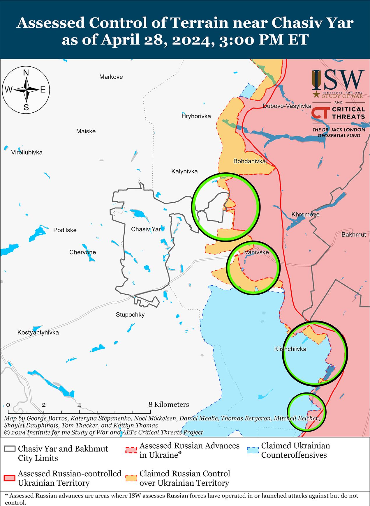 Продолжающаяся стабилизация Россией своего выступа к северо-западу от Авдеевки ставит российское командование перед выбором: продолжать наступление на запад к заявленной оперативной цели в Покровске или попытаться продвинуться на север для проведения возможных дополнительных наступательных операций с российскими усилиями в районе Часового Яра. Украинские официальные лица ранее называли Покровск российской оперативной целью на Авдеевском направлении, и Сырский повторил эту оценку 28 апреля. [11] В качестве альтернативы российские войска могут принять решение о наступлении на север от тактического прорыва в районе Очеретино вдоль трассы Н-20 (Донецк-Константиновка), чтобы оказать давление на украинские силы, обороняющиеся в районе Торецка и, возможно, в оперативном тылу украинской обороны в районе Часового Яра и к западу от него. Российские войска уже давно нацелены на захват четырех крупных городов, образующих крепостной пояс в Донецкой области (Славянск, Краматорск, Дружковка и Константиновка), и Часов Яр имеет важное оперативное значение, поскольку он предоставит российским войскам плацдарм для начала наступательных операций на Дружковку и Константиновку. [12] Российское военное командование может решить, что продвижение на север вдоль трассы Н-20 позволит российским войскам провести последующие взаимодополняющие наступательные операции с востока и юга против южного края украинского крепостного пояса в Донецкой области. Российское тактическое прорыв к северо-западу от Авдеевки находится примерно в 20 км к юго-западу от Торецка, примерно в 18 км к югу от Александро-Калиново (следующий крупный населенный пункт к югу от Константиновки) и примерно в 28 км к югу от Константиновки. Это расстояние заметно не больше, чем расстояние до Покровска, который находится примерно в 30 км к западу от российского выступа к северо-западу от Авдеевки. Продвижение по Н-20 была бы серьезным предприятием и не была бы быстрым. Однако российское командование может принять решение о продолжении наступления на запад в направлении Покровска, поскольку в районе к западу от Авдеевки может быть больше возможностей для тактических успехов, чем к северу, а также из-за озабоченности России выходом на западные границы Донецкой области.