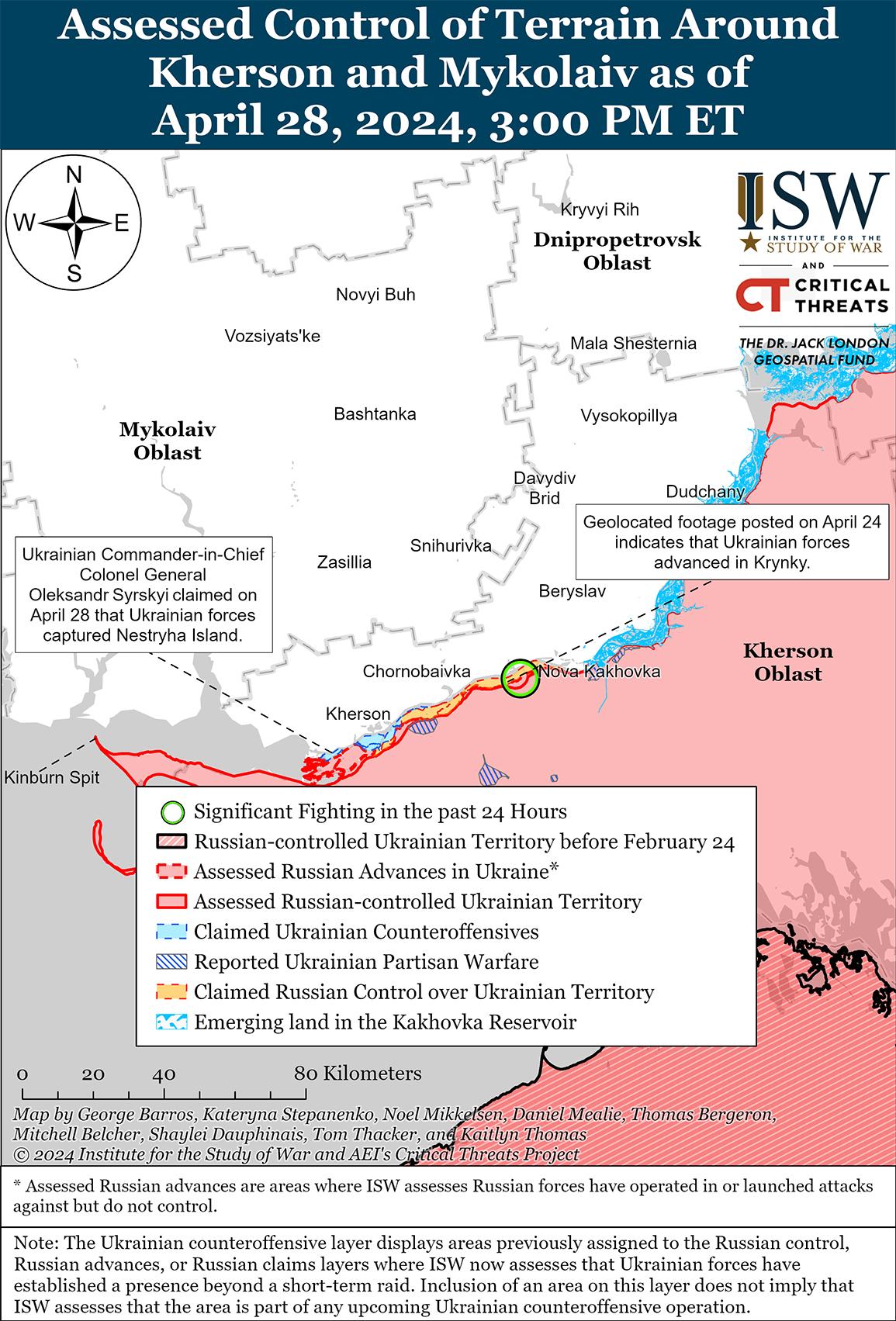 Украинский главнокомандующий генерал-полковник Александр Сырский сообщил 28 апреля, что украинские силы недавно продвинулись в районе Велетенского (юго-запад Херсона) и установили контроль над островом Нестрига в дельте реки Днепр к юго-западу от Херсона. [63] Генштаб Вооруженных сил Украины сообщил, что украинские силы отбили несколько атак россиян в районе населенных пунктов Крынки на восточном (левом) берегу Херсонской области. [64]