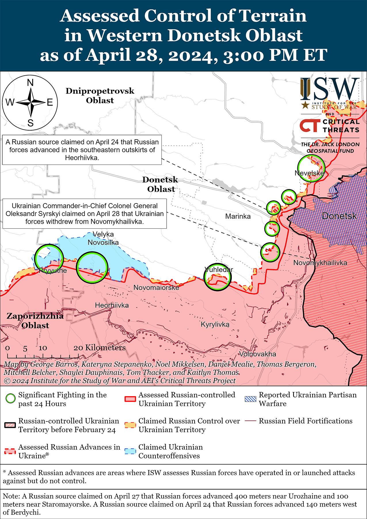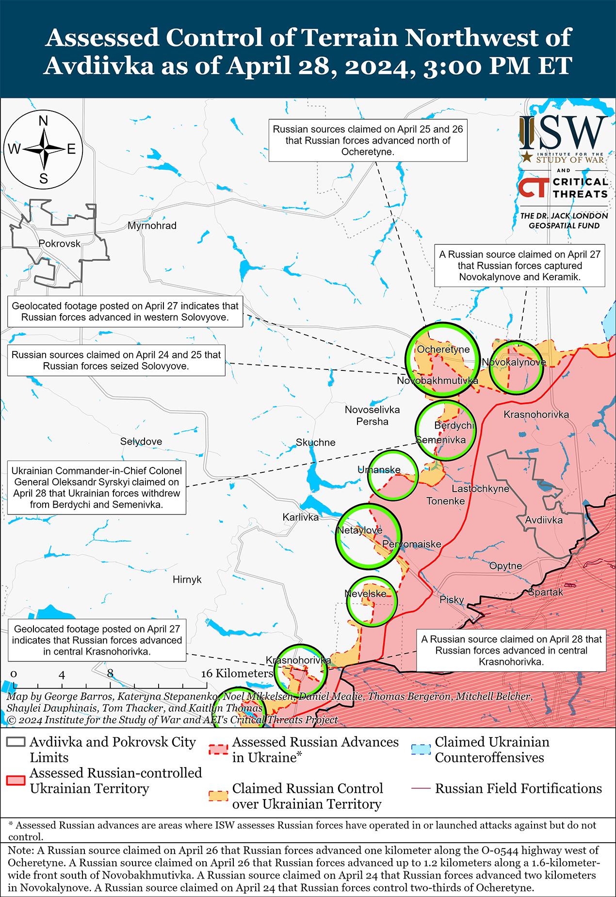 Украинские силы отошли из двух населенных пунктов к северо-западу от Авдеевки на фоне продолжающихся боев в этом районе 28 апреля. Украинский главнокомандующий генерал-полковник Александр Сырский заявил 28 апреля, что украинские силы отошли из Бердичей (северо-западнее Авдеевки) и Семеновки (западнее Авдеевки) на неустановленные линии к западу. [48] Известный российский военный блогер сообщил, что украинские войска покинули Бердичи вечером 27 апреля после того, как 26 апреля российские войска захватили Семеновку и прорвали украинский укрепрайон в районе Очеретино (северо-западнее Авдеевки), угрожая окружить украинские силы в Бердичах. [49] Российские военные блогеры сообщали, что российский отряд «Маг Догс» из состава 74-й мотострелковой бригады (41-я общевойсковая армия, Центральный военный округ) захватил Бердичи и до полуночи 27 апреля поднял российский флаг на его западной окраине. [50] Российские военные блогеры утверждали, что 27 апреля российские войска захватили Новокалиново (северо-западнее Авдеевки) и продвинулись к восточной окраине Керамика (непосредственно к северу от Новокалиново); 28 апреля продвинулись западнее Бердичей, севернее Семеновки и в западную часть Нетайлова (юго-западнее Авдеевки); и захватил Керамик 28 апреля. [51] Однако ISW не обнаружил подтверждения этим российским заявлениям, кроме захвата Бердичей и Семеновки. Также продолжались бои северо-западнее Авдеевки в районах населенных пунктов Уманское, Сокол (западнее Очеретино), Архангельское, Калиново, Соловьево, Новопокровское (юго-западнее Соловьево) и Новоселовка Перша (юго-западнее Новопокровского). [52] 28 апреля Министерство обороны России заявило, что российские войска захватили Новобахмутовку (северо-западнее Авдеевки) после того, как российские войска, вероятно, захватили населенный пункт в ночь с 24 на 25 апреля. [53] Сообщается, что на Авдеевском направлении продолжают действовать подразделения российского отряда спецназа «Вега» (24-я гвардейская бригада спецназа, ГРУ). [54]