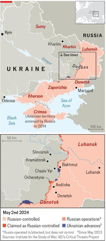 Первоочередную озабоченность Украины вызывает ее опорный пункт в городе Часов Яр, который является ключом к дальнейшему продвижению российских войск к последним крупным городам Донецкой области (см. карту). Вероятно, это вопрос времени, когда этот город падет так же, как Авдеевка, разбомбленная россиянами в феврале, говорит генерал. «Не сегодня и не завтра, конечно, но все зависит от наших резервов и поставок».