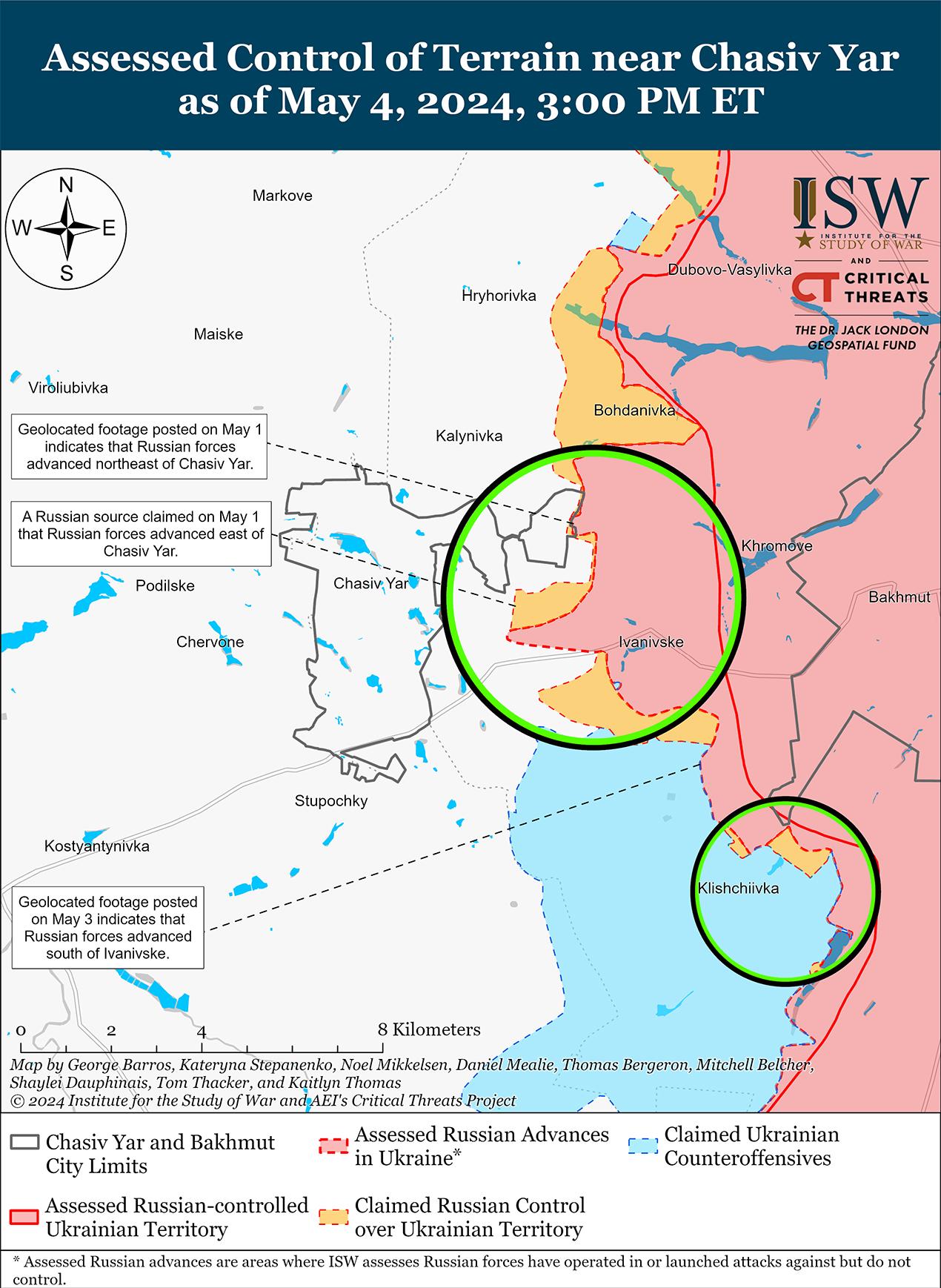 4 мая украинские и российские войска продолжали вести бои в районе Часова Яра, но подтвержденных изменений на этой линии фронта не было. Российский блогер заявил, что российские войска продвинулись между Ивановским (к востоку от Часова Яра) и Клещеевкой (к юго-востоку от Часова Яра), но ISW не обнаружил визуального подтверждения этого заявления. [25] Российский источник утверждал, что украинский контроль над Григорьевкой и Калиновкой (к северу от Часова Яра) и контратаки в их окрестностях препятствуют продвижению российских войск к северу от Часова Яра. [26] Заместитель командира украинской бригады, действующей вблизи Часова Яра, заявил, что российские войска пытаются обойти Часов Яр из Богдановки (северо-восточнее Часова Яра) и Ивановского, а также пытаются атаковать населенный пункт в лоб. [27] Бои продолжались к северо-западу от Часова Яра в районе Богдановки; к северу от Часова Яра в районе Калиновки; вблизи Нового микрорайона (юго-восток Часова Яра); восточнее Часова Яра в районе Ивановского; и юго-восточнее Часова Яра в районе Андреевки и Клещеевки. [28] Украинский военный наблюдатель Константин Машовец заявил, что между Часовым Яром и трассой Т0504 (Бахмут-Константиновка) действуют новые дополнительные подразделения российского 331-го полка ВДВ (98-я дивизия ВДВ); передовые подразделения 217-го полка ВДВ (98-я дивизия ВДВ) и Русского добровольческого корпуса действуют в лесном массиве северо-восточнее микрорайона Канал (самый восточный Часов Яр); а другие подразделения 217-го полка ВДВ пытаются продвинуться в сторону Калиновки из Богдановки. [29] Машовец заявил, что подразделения 102-го мотострелкового полка (150-я мотострелковая дивизия, 8-я общевойсковая армия, Южный военный округ [ЮВО]) с трудом поддерживают левый фланг тактической ударной группы 98-й дивизии ВДВ (вероятно, имеется в виду район Ивановского), что осложняет продвижение дивизии южнее Часова Яра. Машовец заявил, что к югу от Ивановского действуют подразделения 11-й отдельной бригады ВДВ; подразделения 88-й отдельной мотострелковой бригады (2-й АК ЛНР) после восстановления вернулись на поле боя и действуют восточнее Клещеевки; и подразделения 83-й отдельной бригады ВДВ действуют вблизи Клещеевки и Андреевки. Сообщается, что подразделения российской 200-й мотострелковой бригады (14-й АК Ленинградского военного округа [ЛВО]) действуют в районе Часова Яра. [30]