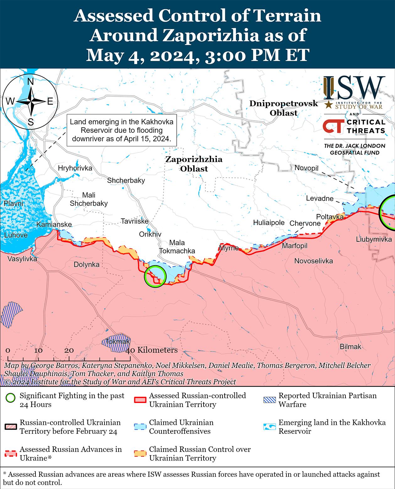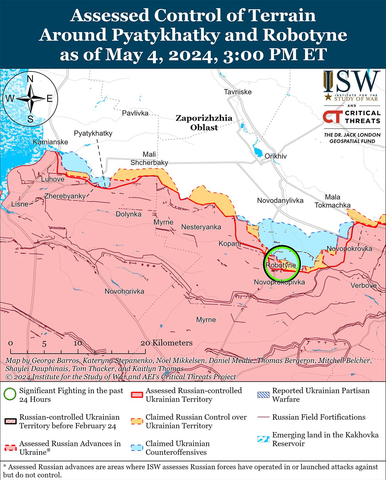 4 мая российские войска продолжали атаковать украинские позиции в Работино и его окрестностях, но линия фронта не изменилась. Продолжались позиционные бои в районе Работино и северо-западнее Вербовое (восточнее Работино). [46] Пресс-секретарь Украинского легиона свободы Константин Денисов заявил, что российские войска продолжают использовать небольшие группы пехоты для наступления на Запорожском направлении, и отметил, что успехи российских войск в Запорожской области являются «микроскопическими и жалкими» по сравнению с ресурсами, которые российские войска выделили на этом направлении. [47] Денисов добавил, что интенсивность российских атак на западе Запорожской области снизилась за последние четыре-пять недель. Один из блогеров отметил, что российские войска испытывают трудности с укреплением позиций к северу от Работино и к северо-западу от Вербовое из-за разрушения позиций и зданий в этом районе. [48] Блогер также утверждал, что российским войскам, действующим на линии Работино-Вербовое, требуются дополнительные комплексы радиоэлектронной борьбы (РЭБ) для отражения украинских беспилотников. Сообщается, что российские подразделения 108-го гвардейского воздушно-десантного полка (ВДВ) и 56-го гвардейского полка ВДВ (оба входят в состав 7-й дивизии ВДВ) действуют на линии Работино-Вербовое. [49] Сообщается также, что в районе Работино действуют подразделения 1152-го мотострелкового полка (58-я общевойсковая армия [ОА], Южный военный округ [ЮВО]) и 291-го гвардейского мотострелкового полка (42-я мотострелковая дивизия, 58-я ОА); сообщается, что на Запорожском направлении действуют подразделения российской 136-й гвардейской мотострелковой бригады (58-я ОА). [50]