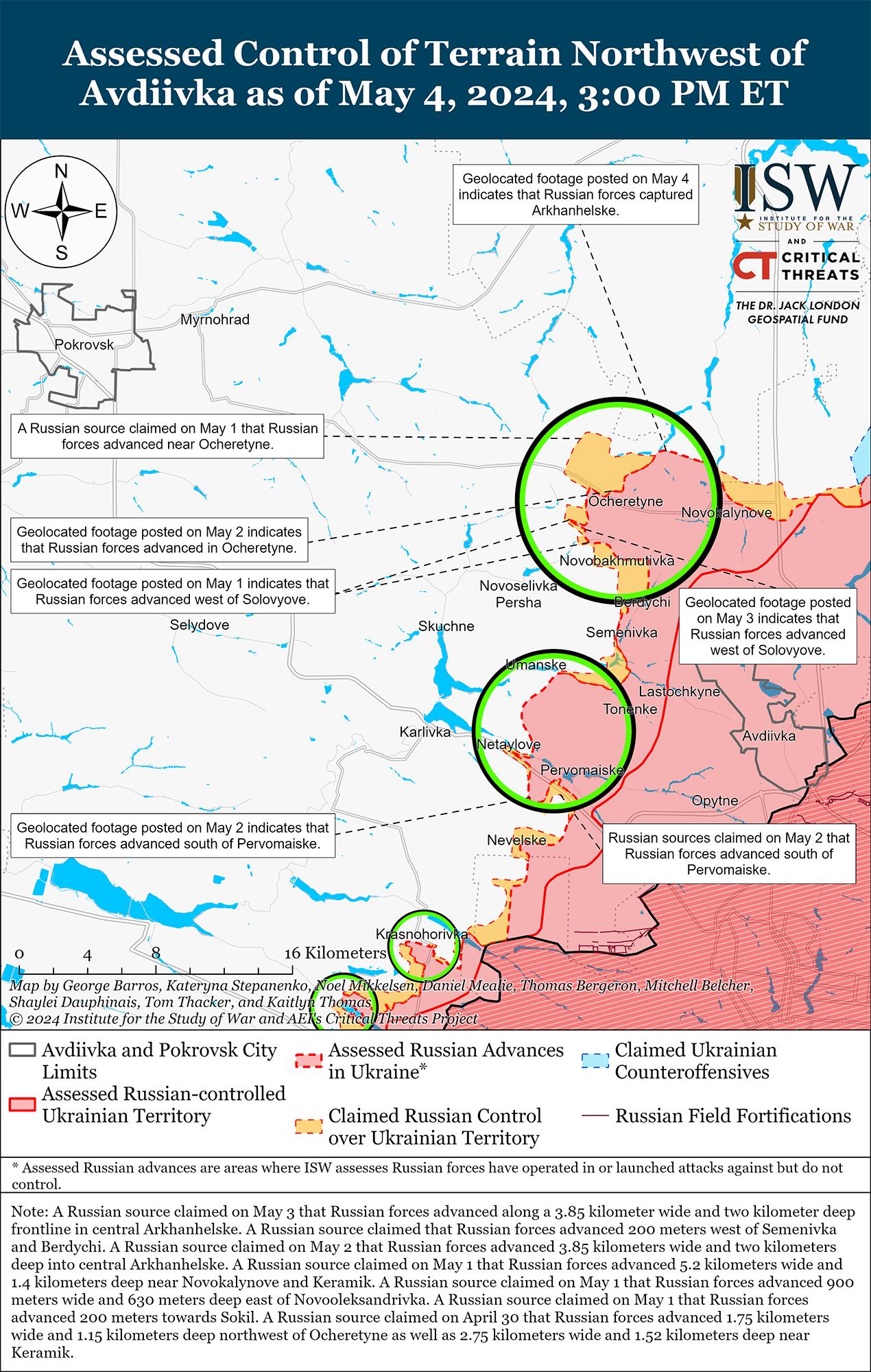 В ночь с 3 на 4 мая российские войска совершили заметное тактическое продвижение к северо-западу от Авдеевки в районе Архангельского, вероятно, после решения Украины уйти из этого района 3 мая. 4 мая российский блогер опубликовал кадры, на которых, как сообщается, бойцы российского батальона «Лавина» 132-й мотострелковой бригады (1-й армейский корпус Донецкой народной республики [ДНР]) поднимают флаг в Архангельском, а ISW геолоцировал эти кадры на севере Архангельского. [1] Дополнительные геолоцированные кадры, опубликованные 4 мая, свидетельствуют о том, что российские войска продвинулись на восточной окраине Архангельского. [2] По оценкам ISW, захват Россией Архангельского также указывает на то, что российские войска, вероятно, контролируют Керамик и Новокалиново (оба к юго-востоку от Архангельского). На геолоцированных кадрах, опубликованных 3 мая, видно, как украинские войска отходят из северной части Архангельского, а российские военные блогеры утверждали, что российские войска продвинулись в населенном пункте в ночь с 3 на 4 мая после ухода украинцев. [3] Известный российский блогер утверждал, что российские войска проводили наступательные операции по захвату Архангельского в несколько этапов: неделю назад российские войска наступали из Очеретино (северо-западнее Авдеевки и юго-западнее Архангельского), а 3 мая российские войска из Керамика (к востоку от Очеретина) захватили населенный пункт. [4] Украинские силы, возможно, решили пожертвовать временем в ожидании прибытия американской помощи на линию фронта в больших масштабах в ближайшие недели – подходящее решение для сил с ограниченными ресурсами, которые рискуют быть обойденными с флангов. [5] ISW продолжает оценивать, что российские силы, вероятно, пытаются воспользоваться ограниченным временным окном до прибытия западной военной помощи путем активизации наступательных операций, и что российские силы могут добиться дальнейших тактических успехов в этом районе в ближайшем будущем. [6]