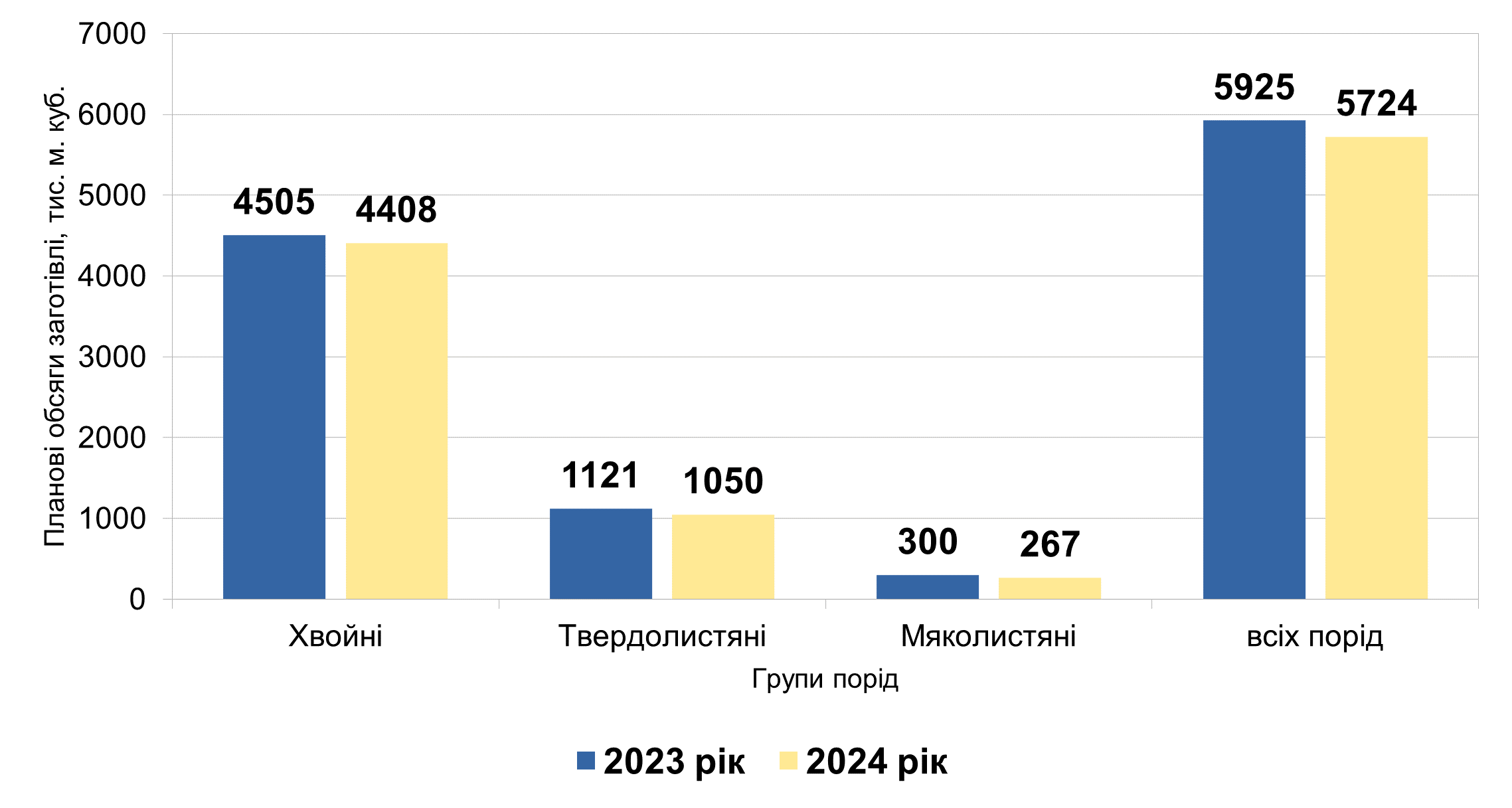 Рис. 3. Планові обсяги заготівлі круглого лісу за групами порід у ДП «Ліси України» в 2023-2024 рр., тис. м3