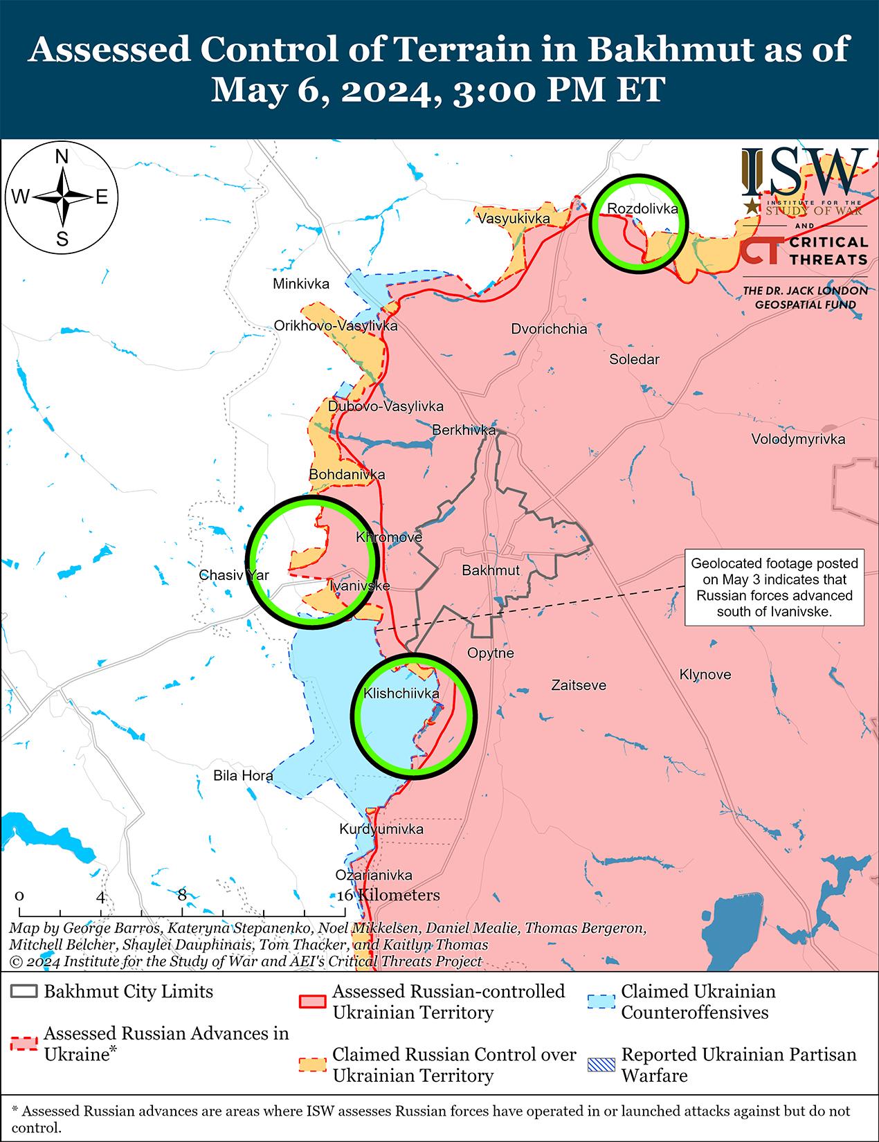 Недавно российские войска подтвердили продвижение на восточном (левом) берегу Херсонской области на фоне продолжающихся позиционных боев в этом районе 6 мая. Геолоцированные кадры, опубликованные 6 мая, свидетельствуют о том, что российские войска продвинулись к северу от Олешек (юго-восточнее Херсона). [88] Продолжались позиционные бои в районе Крынки. [89] Спикер Южного оперативного командования Украины капитан третьего ранга Дмитрий Плетенчук заявил, что российские войска ежедневно используют до 300 ударных беспилотников по украинским позициям на юге Украины. [90] Плетенчук также заявил, что российские войска пытаются взять под контроль остров Нестрига в дельте Днепра (юго-запад Херсона) и несут значительные потери. Российский источник утверждает, что остров Нестрига является спорной «серой зоной» и что высокий уровень воды затрудняет любые наступательные операции по установлению контроля над островами в дельте Днепра[91] Российский военный блогер заявил, что российские войска все чаще наносят удары управляемыми планирующими бомбами по западному (правобережью) Херсонской области. [92]
