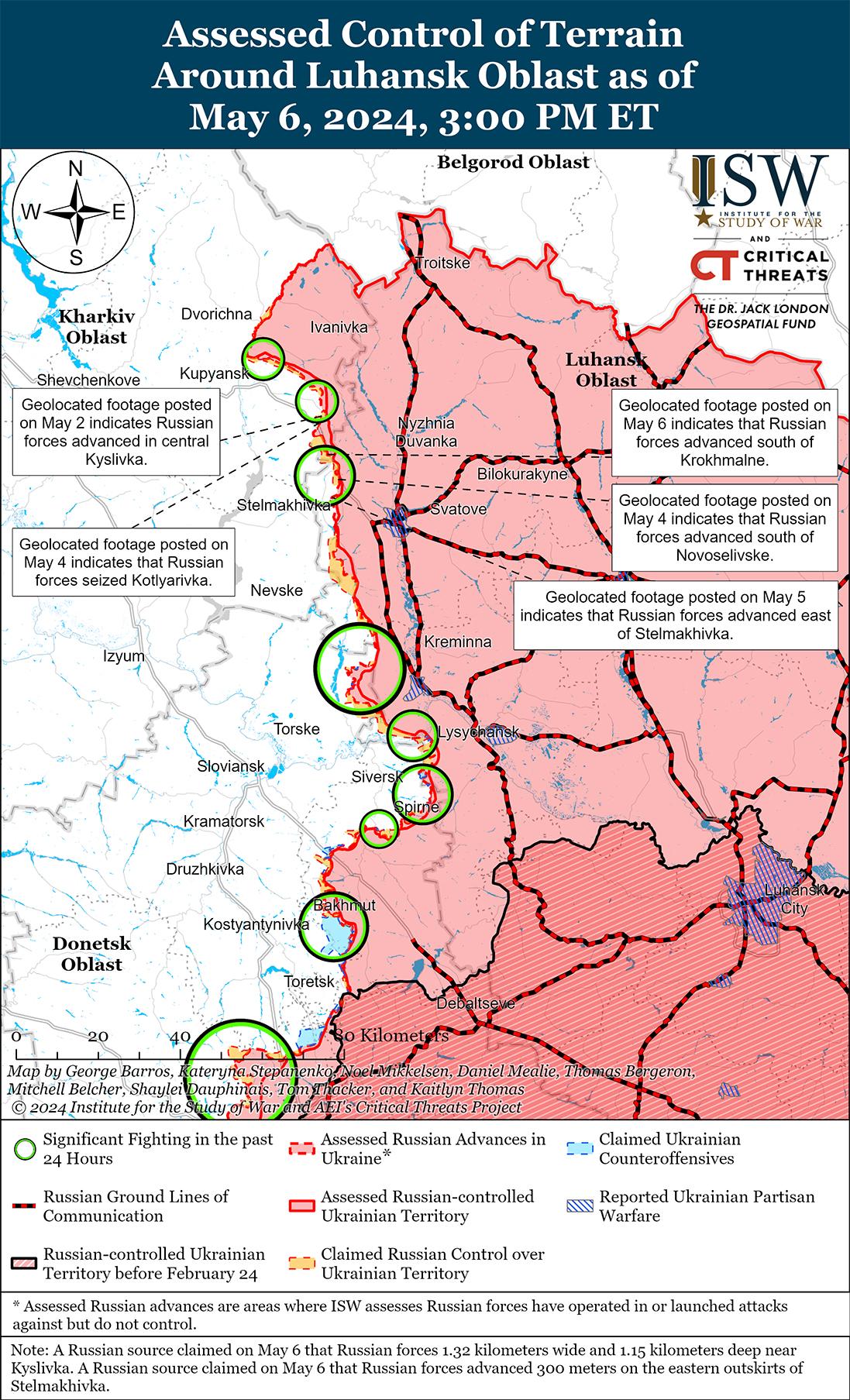 Недавно российские войска незначительно продвинулись к северо-западу от Сватово на фоне продолжающихся наземных атак вдоль линии Купянск-Сватово-Кременная 6 мая. На геолоцированных кадрах, опубликованных 5 и 6 мая, видно, что российские войска незначительно продвинулись к востоку от Стельмаховки и к югу от Крахмального (оба к северо-западу от Сватово) соответственно, а российский военный блогер сообщил, что российские войска продвинулись на 300 метров на восточной окраине Стельмаховки. [56] 6 мая Министерство обороны России заявило, что российские войска захватили Котляровку (северо-западнее Сватово), а российские военные блогеры впоследствии утверждали, что взятие Котляровки позволило частям 1-й гвардейской танковой армии РФ (Московского военного округа) полностью захватить Кисловку (северо-западнее Сватово), однако ISW не обнаружил визуальных подтверждений этим заявлениям. [57] Ранее российские военные блогеры утверждали, что российские войска захватили Кисловку 27 апреля. [58] Продолжались штурмовые действия к северо-западу от Сватово в районе Песчаного и Берестовое; северо-западнее Кременной в районе Невского и Новосадового; западнее Кременной в районе Торского; и южнее Кременной в районе Серебрянского лесничества и Белогоровки. [59] Сообщается, что подразделения российского 204-го полка спецназа «Ахмат» действуют в лесах вблизи Кременной. [60]