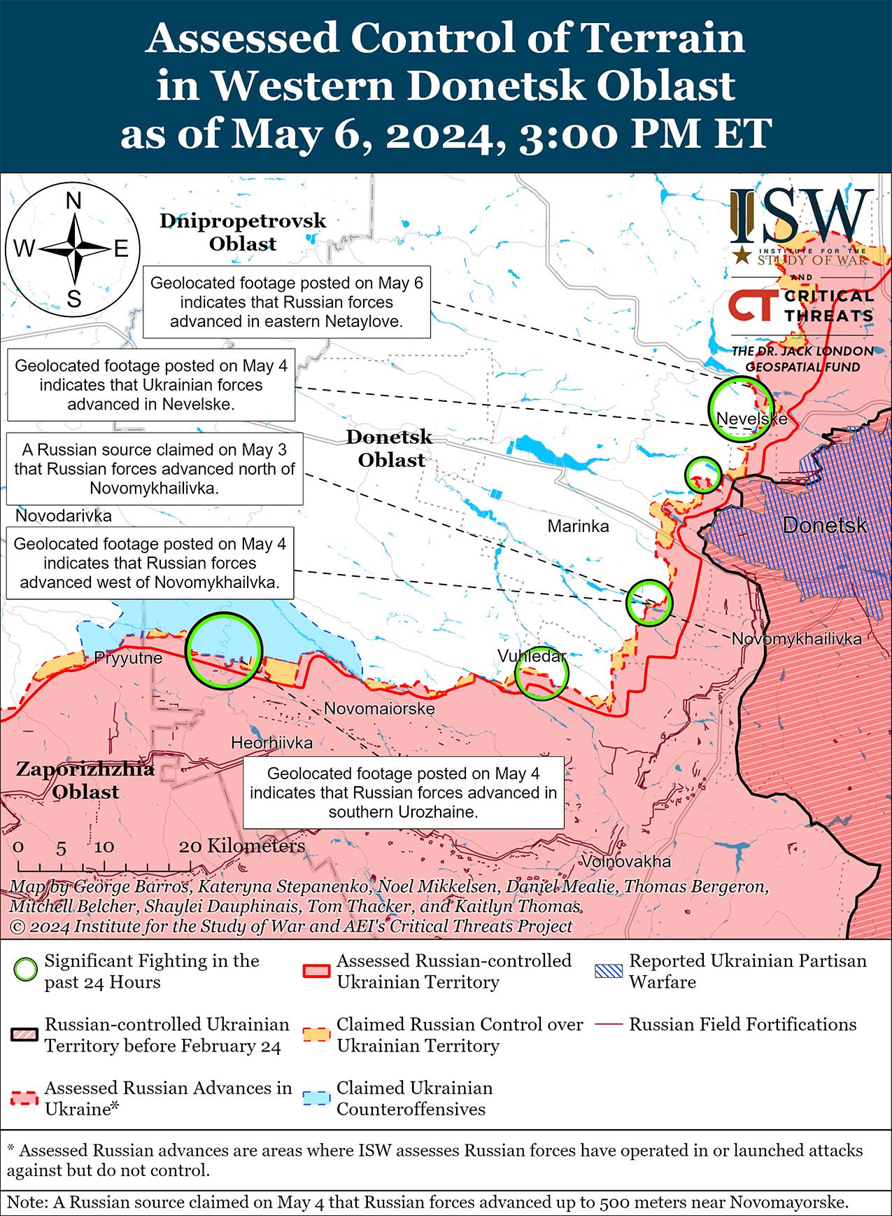 Российские войска недавно продвинулись к юго-западу от Авдеевки на фоне продолжающихся наступательных действий к западу от населенного пункта 6 мая. На геолоцированных кадрах, опубликованных 6 мая, видно, что российские войска продвинулись вдоль трассы Е50 в восточной части Нетайлова (юго-запад Авдеевки). [68] Украинские и российские источники сообщали, что бои в Нетайлове продолжались. [69] Российские военные блогеры также утверждали, что российские войска продвинулись к востоку от Новопокровского (северо-запад Авдеевки) на расстояние до двух километров и что российские войска вышли на окраины Новоалександровки (северо-запад Очеретино и примерно в 15 км к северо-западу от Авдеевки), хотя ISW пока не зафиксировал подтвержденных российских успехов в этих районах. [70] Один из блогеров утверждал, что российские войска продвинулись в жилом районе на востоке Уманского (к западу от Авдеевки). [71] Российские военные блогеры также утверждали, что российские войска ведут наступление в направлении Калиново с позиций в Архангельском (оба севернее Авдеевки). [72] Украинский Генштаб сообщал о продолжении российских атак к северо-западу от Авдеевки вблизи Новоалександровки и Новопроковского; западнее Авдеевки в районе Уманского и Яснобродовки; и юго-западнее Авдеевки в районе Нетайлова и Невельского. [73] Сообщается, что подразделения российского батальона «Лавина» (132-я мотострелковая бригада, 1-й АК Донецкой Народной Республики [ДНР]) действуют севернее Авдеевки в районе Керамик-Новокалиново-Архангельское, а подразделения 24-й гвардейской бригады спецназа, как сообщается, действуют вблизи Первомайское (юго-западнее Авдеевки).[74]
