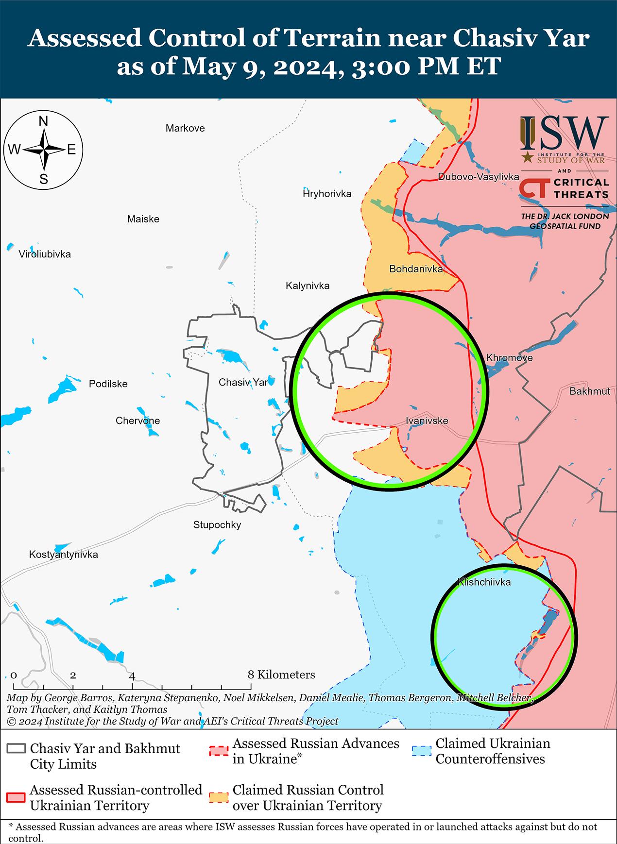 За последний месяц российские войска заметно увеличили количество наземных атак на востоке Украины, что, вероятно, отражает текущую обстановку на поле боя и намерение российского военного командования закрепить успехи до прибытия западной военной помощи на линию фронта. Спикер украинской Хортицкой группировки войск подполковник Назар Волошин 9 мая заявил, что количество боевых столкновений значительно увеличилось с 84 8 мая до 146 9 мая, и отметил, что большая часть боевых действий проходила в зоне ответственности группировки «Хортица» (участок от Харьковской области до Донецкой и Запорожской областей). [28] Министерство обороны Великобритании сообщило, что в период с марта по апрель 2024 г. количество российских атак увеличилось на 17%, а более 75% зарегистрированных наземных атак произошло на Часов Ярском, Авдеевском и Марьинском направлениях. [29] В Минобороны Великобритании отметили, что в период с марта по апрель количество российских атак вблизи Часова Яра выросло на 200%. Волошин предположил, что нынешняя активизация российских атак является результатом того, что почва высохла после весеннего сезона грязи, что способствует более быстрому механизированному маневру, и что российские войска пытаются воспользоваться относительной слабостью Украины, пока она ожидает прибытия западной помощи. [30] ISW по-прежнему оценивает, что российские войска сохранят высокий уровень атак на востоке Украины, чтобы добиться успехов до прибытия западной помощи в Украину, что, вероятно, помешает российским силам поддерживать высокий темп атак и тактические успехи, которые они могут преследовать в настоящее время. [31] Президент Украины Владимир Зеленский также заявил 9 мая во время встречи с главой Европарламента Робертой Метсолой, что прибытие западной помощи украинским подразделениям на передовой позволит украинским силам ослабить инициативу России на востоке Украины. [32]