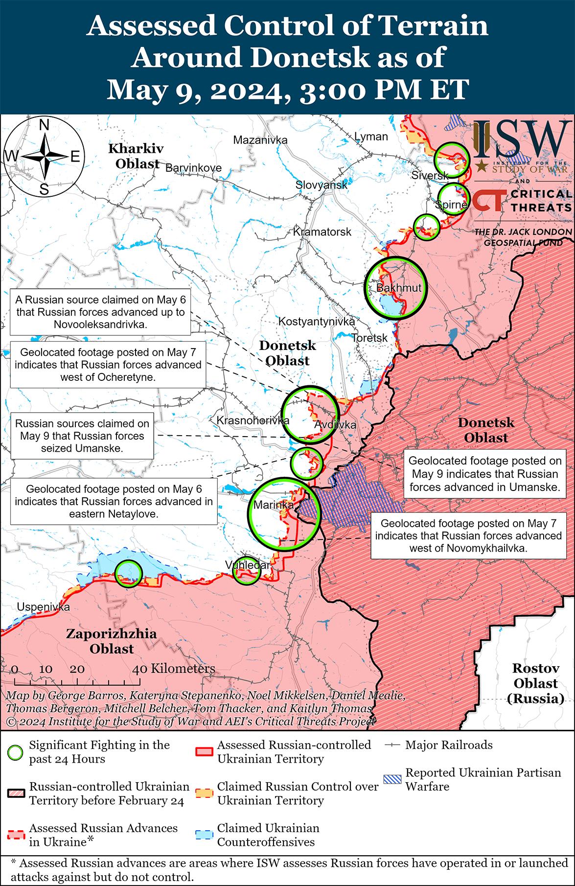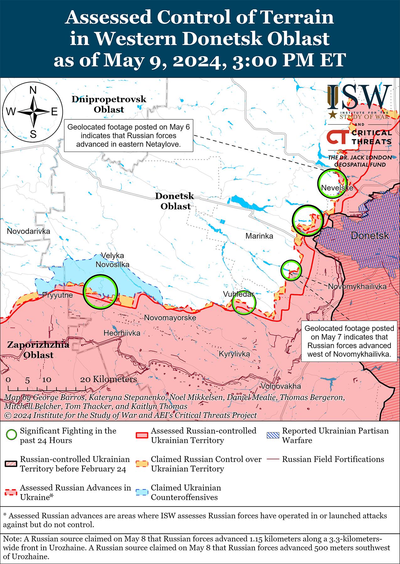 Российские войска недавно продвинулись к западу от Донецка и, как сообщается, 9 мая добились дополнительных успехов в этом районе. На геолоцированных кадрах, опубликованных 9 мая, видно, что российские войска продвинулись в восточной части Красногоровки (к западу от Донецка) вдоль улицы Чайковского. [64] Российские военные блогеры также утверждали, что российские войска продвинулись в восточной части Красногоровки вдоль улицы 1 Мая и в направлении Солнечного микрорайона и улицы Западной. [65] Спикер Хортицкой группировки войск подполковник Назар Волошин подтвердил, что украинские силы по-прежнему контролируют ситуацию в Красногоровке, и отметил, что российские войска используют небольшие пехотные группы для наступления на восточные окраины населенного пункта. [66] Российские и украинские источники сообщали о продолжении боевых действий к западу от Донецка в районе Георгиевки; к юго-западу от Донецка в районе Константиновки и Парасковиевки; и северо-восточнее Угледара под Водяным. [67] Сообщается, что в Красногоровке продолжают действовать подразделения 5-й мотострелковой бригады (1-й АК ДНР). [68]
