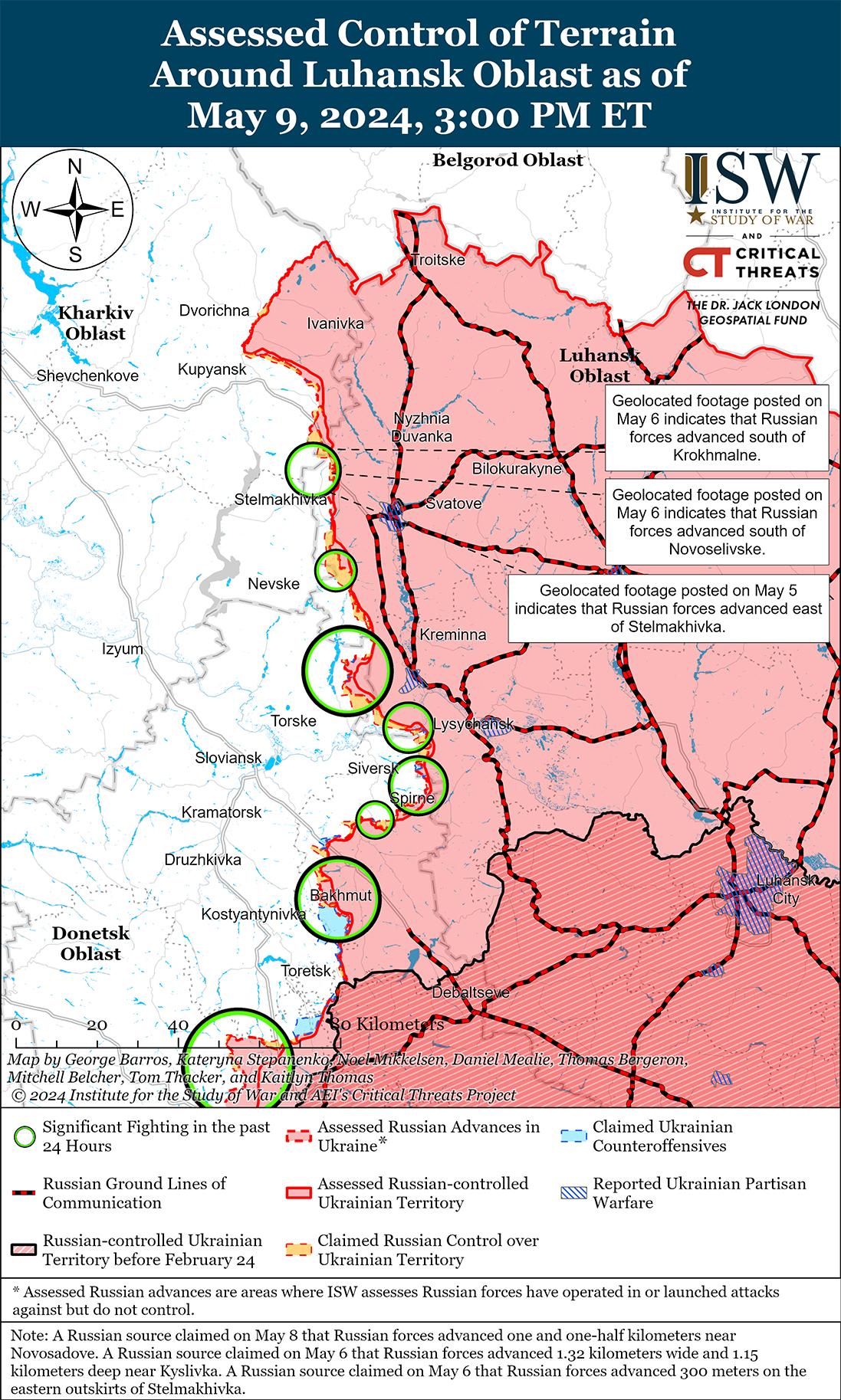 9 мая враг продолжил наступательные действия на линии Купянск — Сватово — Кременная, однако подтвержденных изменений линии фронта на этом участке не было. Российские военные блогеры утверждали, что российские войска продвинулись к северо-востоку от Синьковки (к северо-востоку от Купянска), в сторону Берестового (юго-восточнее Купянска) и на 300 метров возле Новоселовского (северо-запад Сватово), но ISW не обнаружил визуальных подтверждений этих заявлений. [50] Украинские и российские источники сообщали, что бои продолжались к северо-востоку от Купянска в районе Синьковки; восточнее Купянска в районе Петропавловки; юго-восточнее Купянска в районе Ивановки и Берестовой; северо-западнее Сватово в районе Стельмаховки; юго-западнее Сватово в районе Твердохлебово; северо-западнее Кременной вблизи Макеевки, Невского, Новосадового и Новолюбовки; западнее Кременной в районе Торского; юго-западнее Кременной в районе Серебрянского лесничества; и южнее Кременной возле Белогоровки. [51]