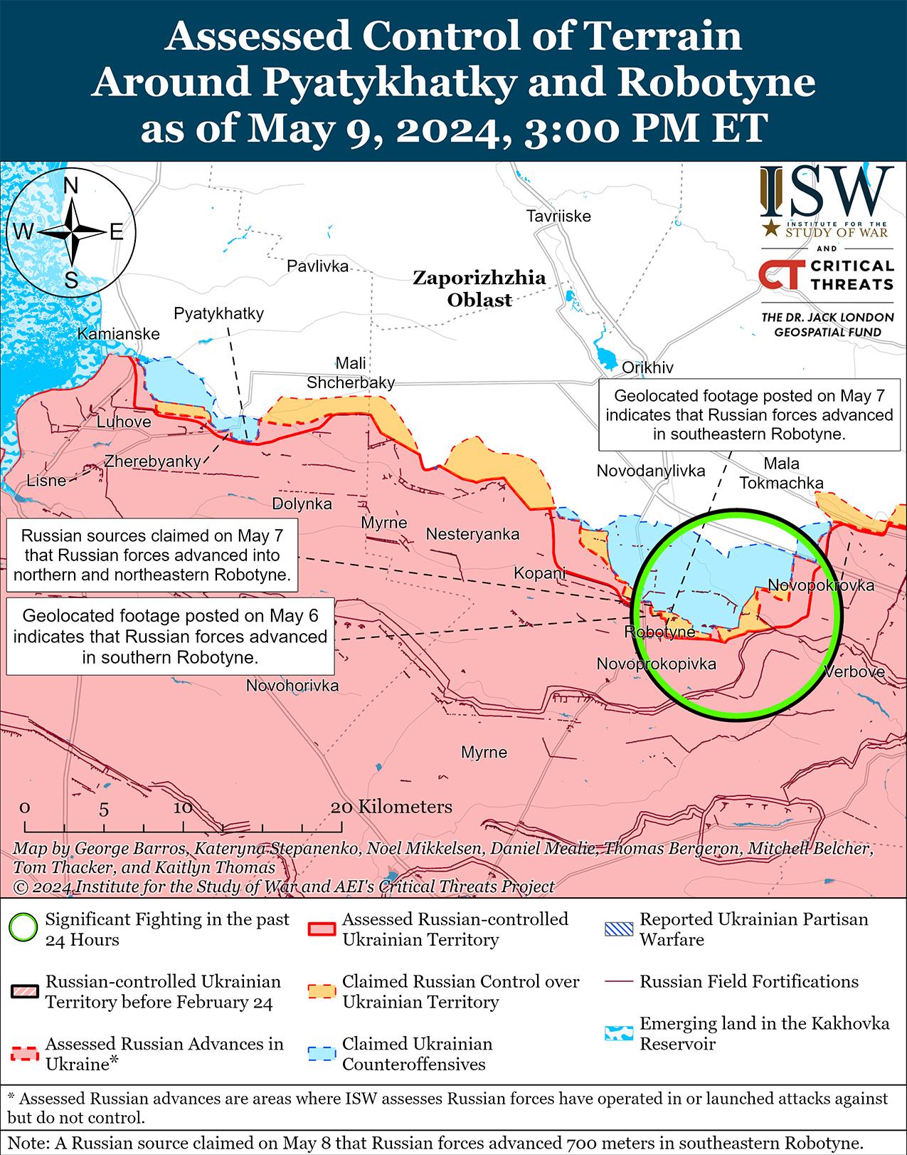 Сообщается, что 9 мая российские войска продвинулись на западе Запорожской области, но подтвержденных изменений на линии фронта не было. Российские военные блогеры утверждали, что российские войска продвинулись в центре Работино и к северу от населенного пункта. [71] Российский военный блогер утверждал, что российские войска используют мотоциклы для передвижения пехоты в Работино. [72] Позиционные бои продолжались к северо-западу от Вербовое (к востоку от Работино). [73] Сообщается, что на западно-запорожском направлении действуют подразделения российского 392-го мотострелкового полка (вероятно, мобилизованного подразделения). [74]