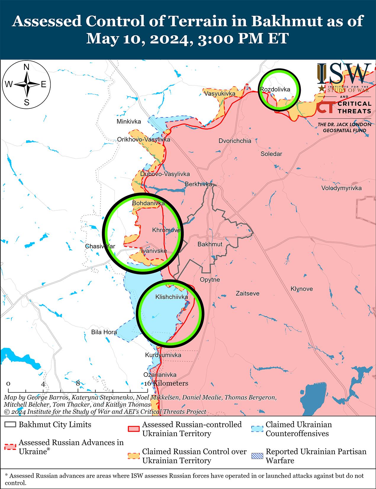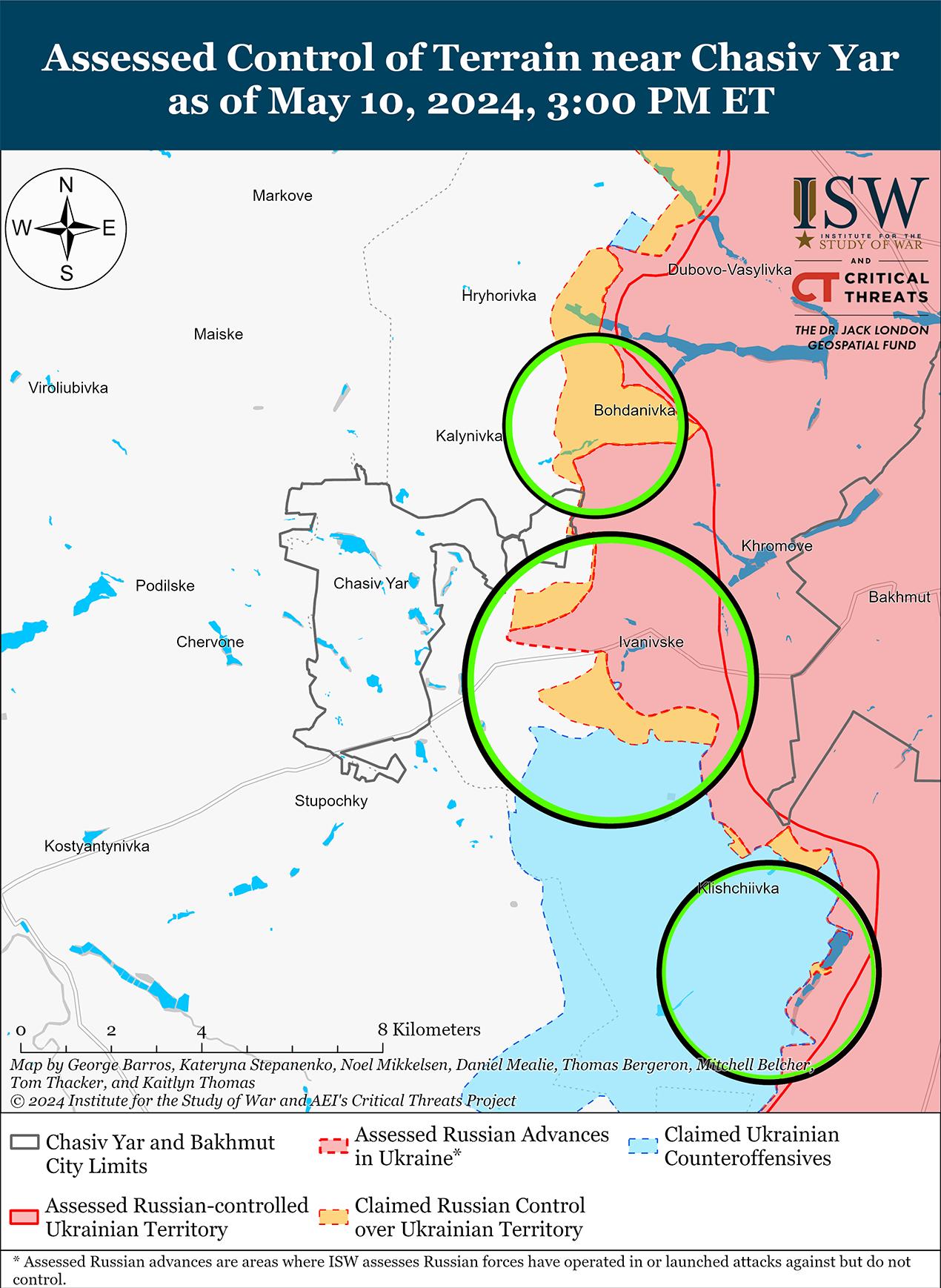 10 мая российские войска продолжили наступательные действия в районе Часова Яра, но подтвержденных изменений на линии фронта не было. Российский военный блогер заявил, что подразделения российской 98-й воздушно-десантной дивизии (ВДВ) вытесняют украинские силы с позиций в районе Нового микрорайона на востоке Часова Яра, а подразделения 98-й дивизии ВДВ и 11-й бригады ВДВ атакуют в районе юго-восточной окраины Часова Яра. [59] Другой российский военный блогер утверждает, что линия фронта стабильна, несмотря на высокую интенсивность боев в этом районе. [60] Командиры нескольких украинских подразделений, воюющих в районе Часова Яра, заявили в статье, опубликованной 9 мая в The Economist, что российские войска продолжают проводить атаки на мотоциклах и квадроциклах в этом районе. [61] Враг продолжал наступать северо-восточнее Часова Яра в районе Богдановки и Калиновки, к востоку от Часова Яра в районе Ивановского и юго-восточнее Часова Яра в районе Клещеевки и Андреевки. [62] Сообщается, что в районе Ивановского действуют подразделения 4-й мотострелковой бригады (2-й армейский корпус Луганской Народной Республики) и чеченского спецназа «Ахмат». [63] Сообщается, что подразделения 3-й бригады спецназа (Главное разведывательное управление Генштаба ВС РФ) нанесли удар беспилотником по украинскому ЗРК С-300 в районе населенного пункта Александро-Калиново (юго-западнее Часова Яра). [64]