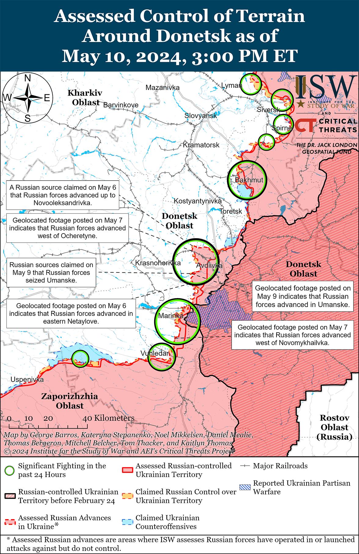 Сообщается, что 10 мая российские войска продвинулись к западу от Авдеевки на фоне продолжающихся российских наступательных действий в этом районе, но подтвержденных изменений на линии фронта не было. Российские военные блогеры утверждали, что российские войска продвинулись дальше в районе Уманского (северо-запад Авдеевки) и что есть неподтвержденные сообщения о том, что российские войска полностью захватили Уманское. [65] Ранее ISW зафиксировал геолокационные кадры действий российских войск в центральной части Уманского, но не обнаружил доказательств действий российских войск в западной или северной части Уманского. [66] Российские источники также утверждали, что российские войска продвинулись в районах Нетайлово (юго-западнее Авдеевки) и южнее Первомайского (юго-западнее Авдеевки). [67] Враг продолжал наступать к северо-западу от Авдеевки в районах населенных пунктов Калиново, Архангельское, Новоалександровка, Соловьево, Очеретино, Сокол и Новоселовка Перша и к западу от Авдеевки в районах Семеновки и Яснобродовки. [68]