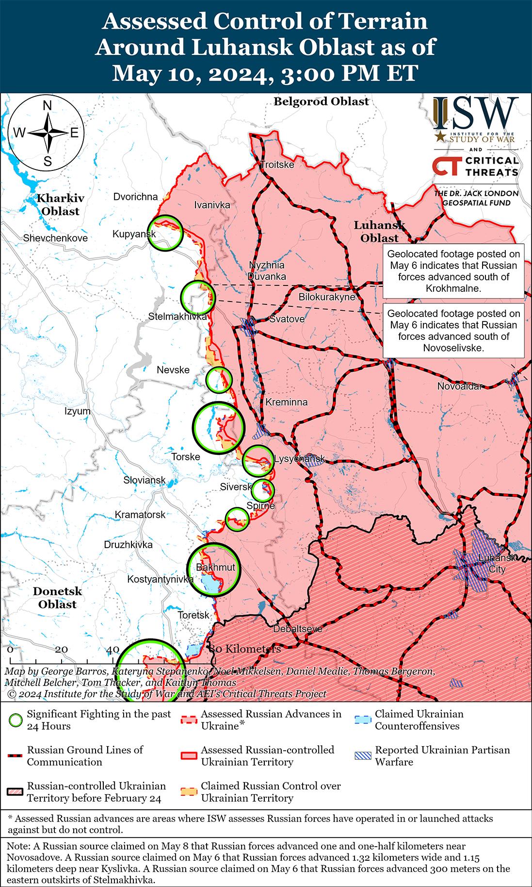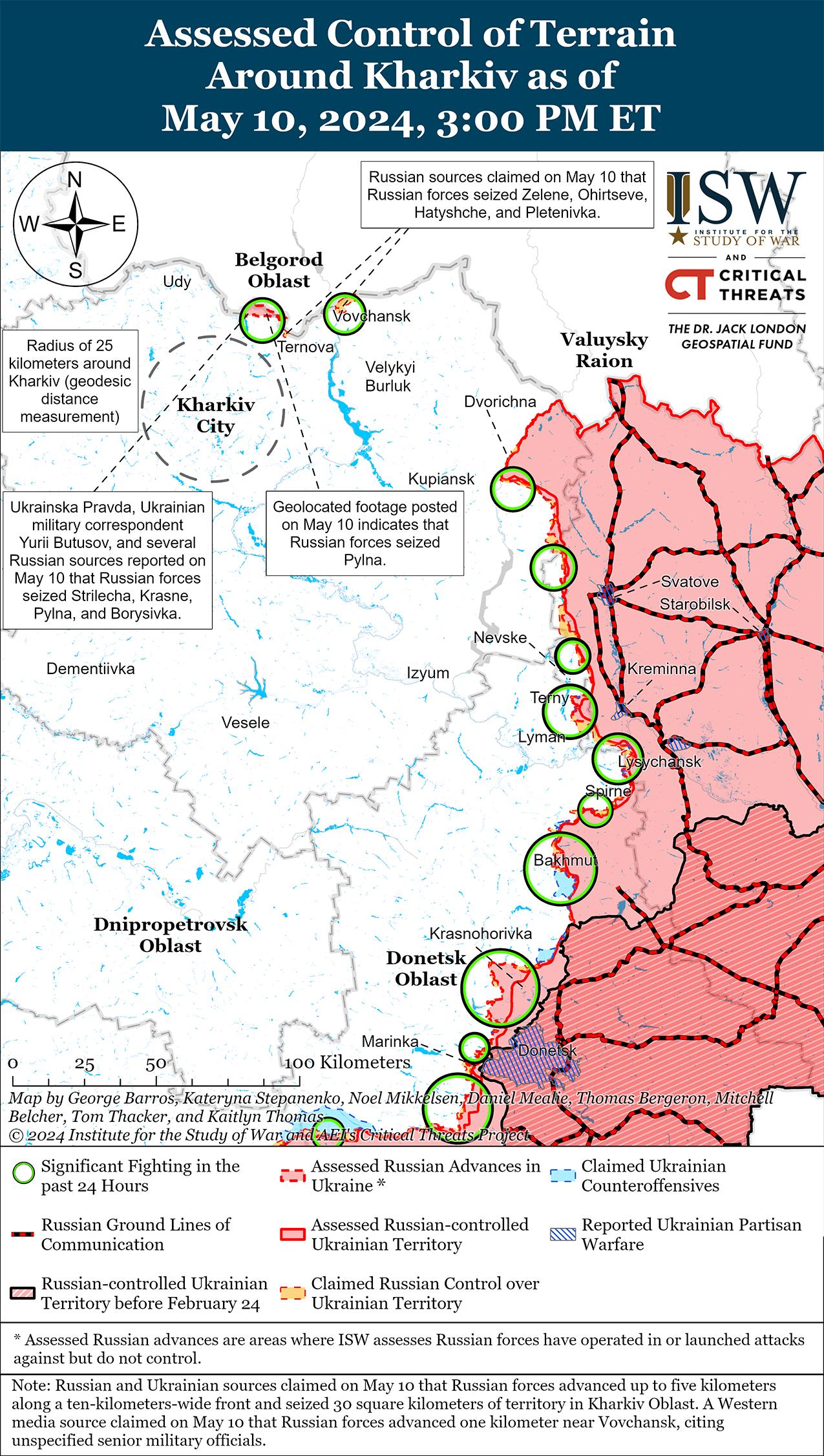 Украинский журналист Юрий Бутусов и украинское издание «Украинская правда» сообщили, что российские войска захватили Стрелечью, Красное, Пыльную и Борисовку (все с севера на северо-восток от Липцы), а Бутусов сообщил, что российские войска закрепились в этом районе глубиной пять километров и по фронту 10 километров. [4] Геолоцированные кадры подтверждают, что российские войска захватили Пыльную и продвинулись к югу от населенного пункта, а российские источники также широко заявляли, что российские войска захватили Стрелечью, Красное и Борисовку. [5] Данные NASA Fire Information for Resource Management (FIRMS) от 10 мая указывают на то, что в этих четырех населенных пунктах и вблизи них, вероятно, шли ожесточенные бои. [6] ISW с высокой степенью уверенности, основываясь на достоверных украинских сообщениях и преобладающих доказательствах, оценивает, что российские войска захватили Стрелечью, Красное и Борисовку, но пока не обнаружила геолокационных подтверждений этой оценки. Российские военные блогеры также утверждали, что российские войска захватили Зеленое, Огирцево и Гатище (оба к западу от Волчанска), хотя ISW не обнаружил подтверждения этим заявлениям. [7] Агентство Reuters сообщило, что высокопоставленный украинский военный источник заявил, что российские войска продвинулись вглубь не менее одного километра в районе Волчанска. [8] По оценкам ISW, российские войска продвинулись в направлении Волчанска, но не обнаружили достаточных доказательств для оценки приблизительного следования линии фронта в непосредственной близости. Украинские источники сообщили, что во второй половине дня бои продолжались в районах населенных пунктов Красное, Мороховец (северо-восточнее Липцов), Олейниково (северо-восточнее Липцов) и Гатище. [9]
