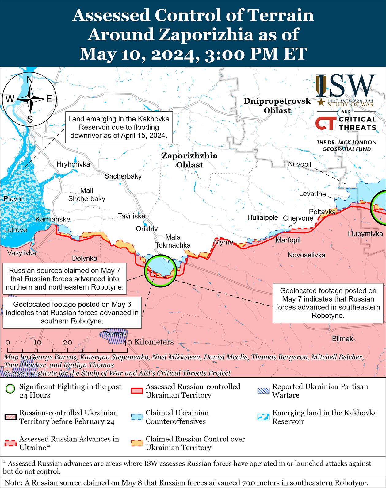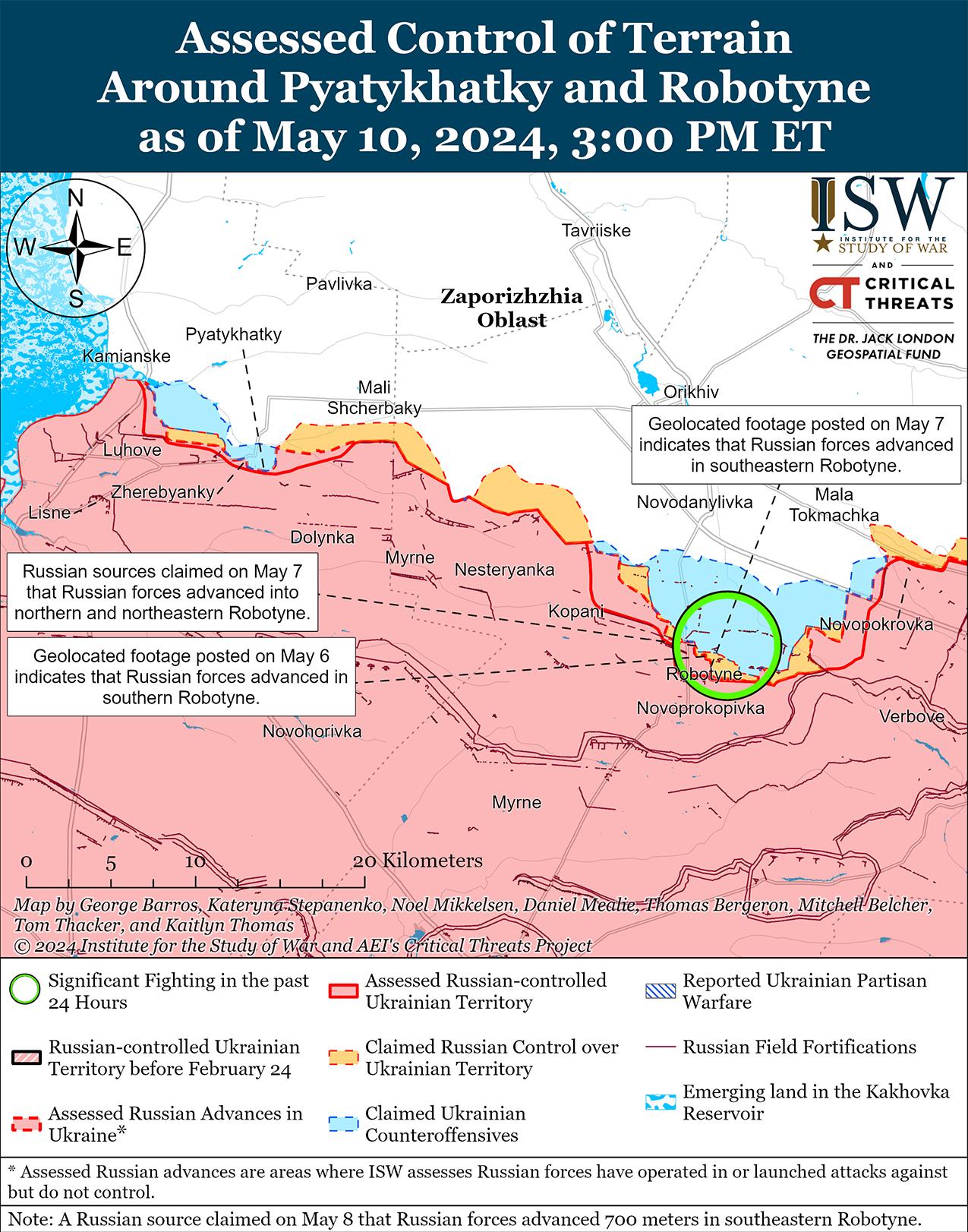 10 мая на западе Запорожской области продолжались позиционные бои, однако подтвержденных изменений линии фронта на этом участке не было. Продолжались позиционные бои на западе Запорожской области в районах населенных пунктов Работино и Вербовое (восточнее Работино). [78] Российский блогер утверждал, что российские войска продвинулись к северной окраине Работино, однако ISW не обнаружил визуальных подтверждений этому заявлению. [79] Сообщается, что подразделения российского 70-го мотострелкового полка (42-я мотострелковая бригада, 58-я общевойсковая армия, Южный военный округ [ЮВО]) используют мотоциклы для подъезда к украинским позициям в районе Работино. [80] Сообщается, что подразделения российского 1152-го мотострелкового полка (58-й ОА) также действуют в районе Работино. [81]