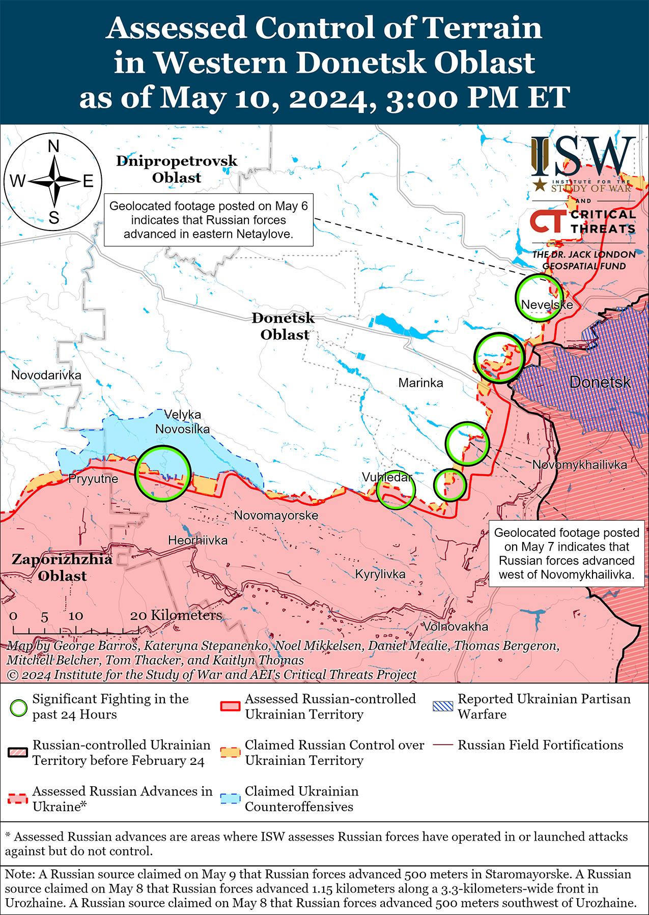 Российские войска незначительно продвинулись в приграничном районе Донецкой и Запорожской областей на фоне продолжающихся боев в этом районе 10 мая. На геолоцированных кадрах, опубликованных 7 мая, видно, что российские войска незначительно продвинулись к юго-западу от Урожайного (к югу от Великой Новоселки). [74] На дополнительных геолоцированных кадрах, опубликованных 10 мая, видно, что российские войска недавно незначительно продвинулись южнее Старомайорского (к югу от Великой Новоселки). [75] Российские военные блогеры утверждали, что подразделения 1466-го мотострелкового полка и 394-го мотострелкового полка (127-я мотострелковая дивизия, 5-я общевойсковая армия, Восточный военный округ) продвинулись западнее Старомайорского и в пределах административных границ населенного пункта. [76]